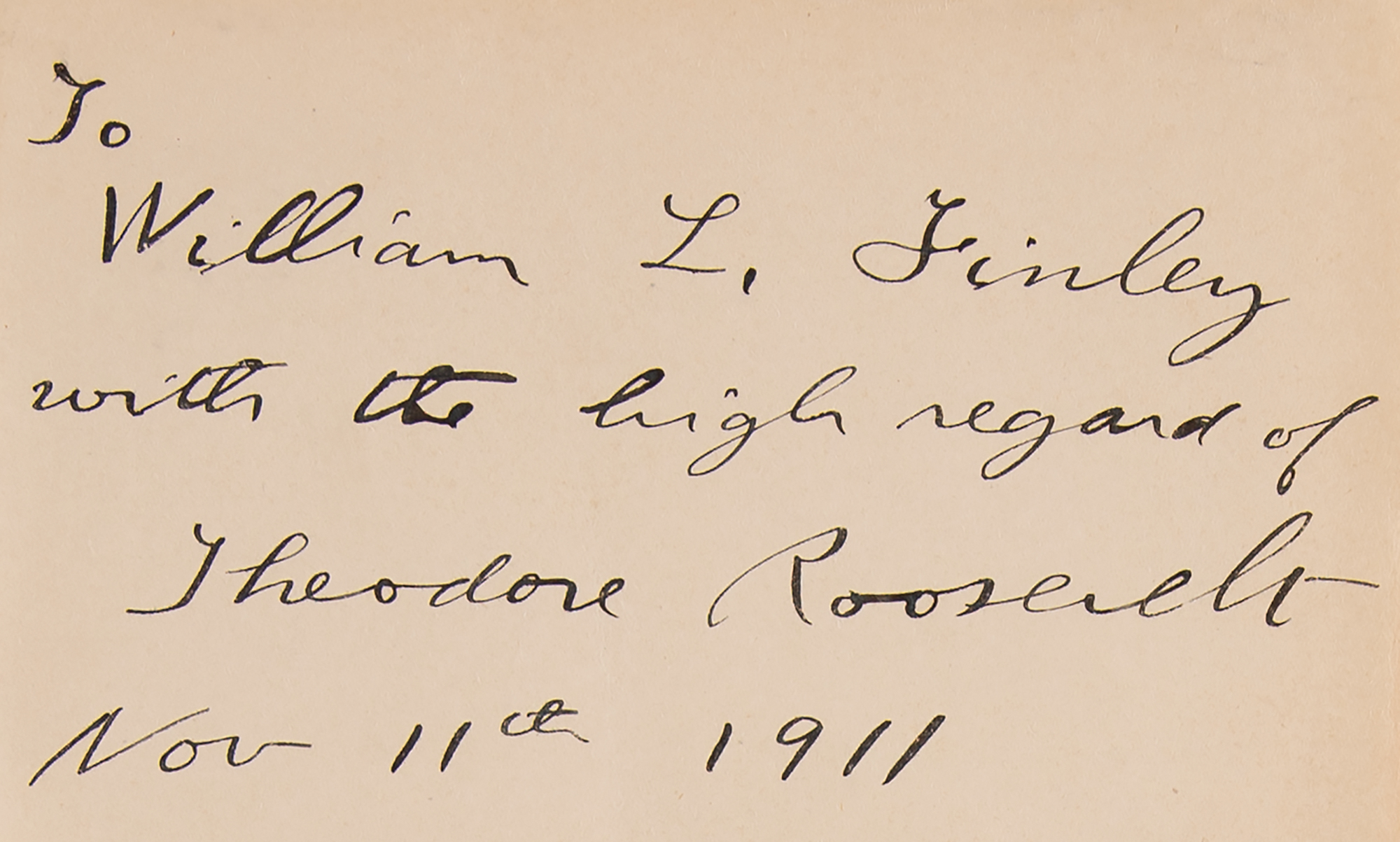 Just after leaving the White House, Theodore Roosevelt famously undertook the Smithsonian-Roosevelt African Expedition in 1909–1910. This trip was a defining moment in Roosevelt's post-presidential legacy and resulted in his authorship of African Game Trails, detailing the "African wanderings of an American hunter-naturalist." The recipient of this example, William L. Finley, was an American wildlife photographer who corresponded with Roosevelt on conservationist topics. In 1905, Finley and Herman T. Bohlman visited and photographed Lower Klamath Lake and Tule Lake. Their report in the November–December issue of Bird Lore helped to influence President Roosevelt's decision to set those areas aside as federal bird reservations. A superb presentation copy of Roosevelt's impressive book.