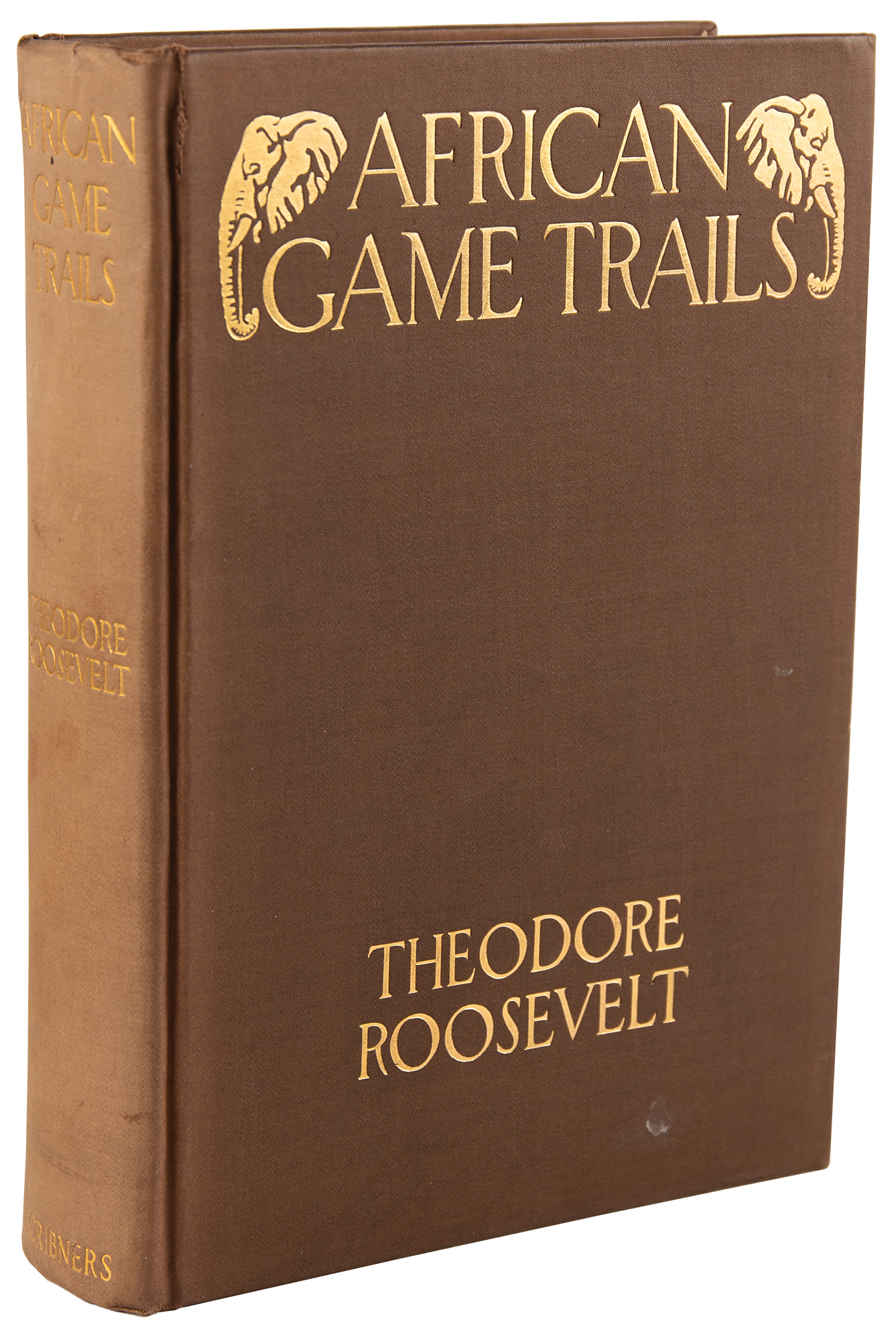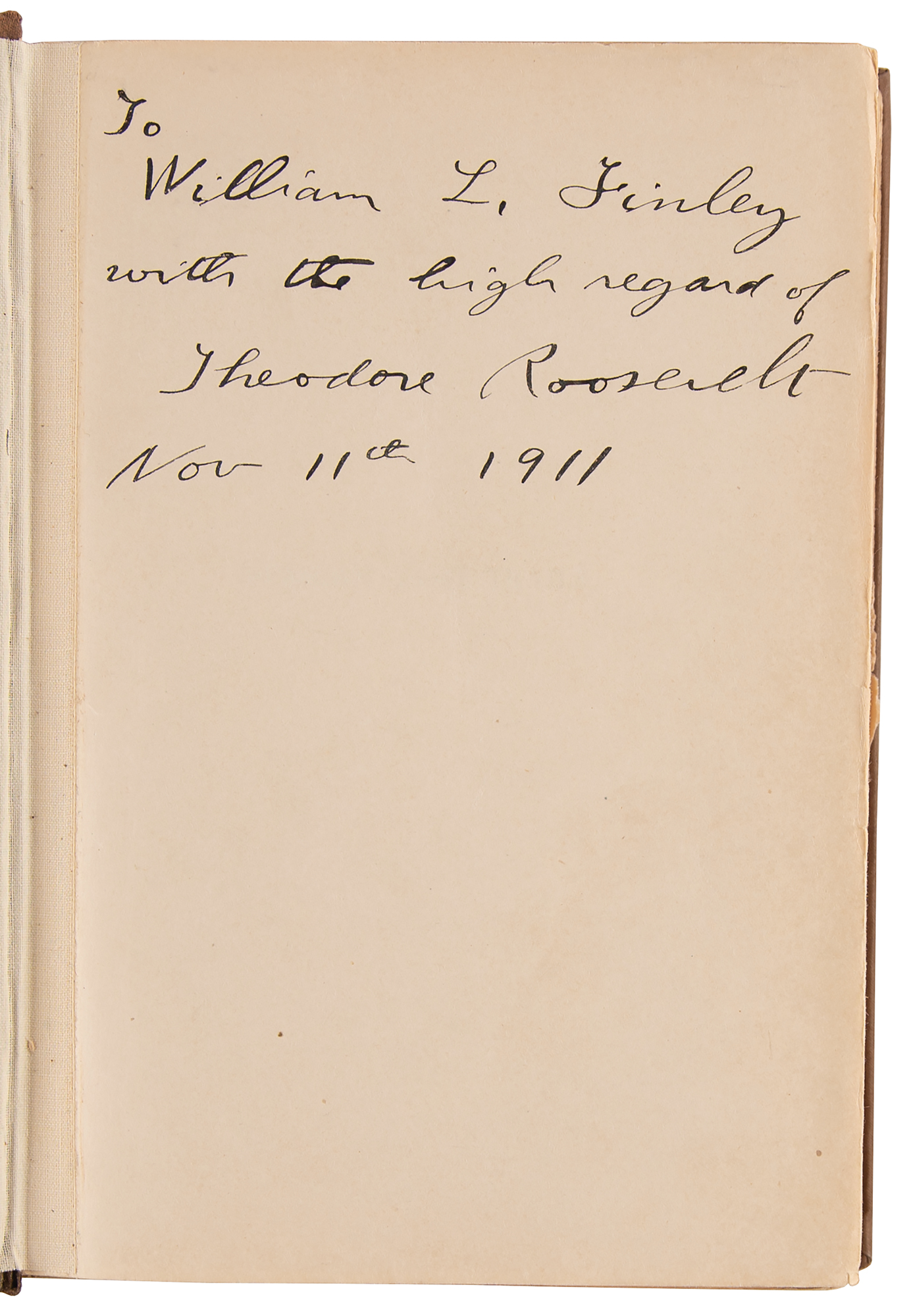 Signed book: African Game Trails. First edition. NY: Charles Scribner's Sons, 1910. Hardcover bound in brown cloth, top edge gilt, 6.5 x 9.5, 529 pages. Boldly signed and inscribed on the first free end page, "To William L. Finley, with the high regard of Theodore Roosevelt, Nov. 11th, 1911." Autographic condition: fine, with a very faint bend to the signed page. Book condition: VG/None, with sunning to spine and a few pencil notations to front pastedown. Accompanied by a handsome custom-made quarter-leather clamshell case with marbled boards.