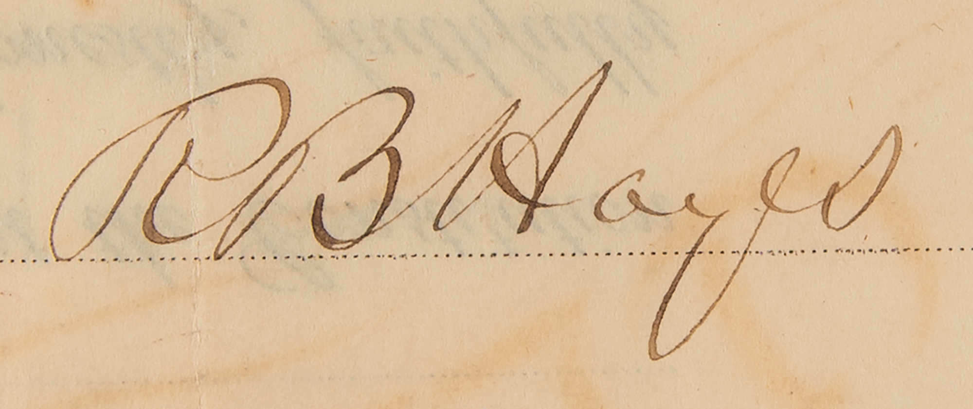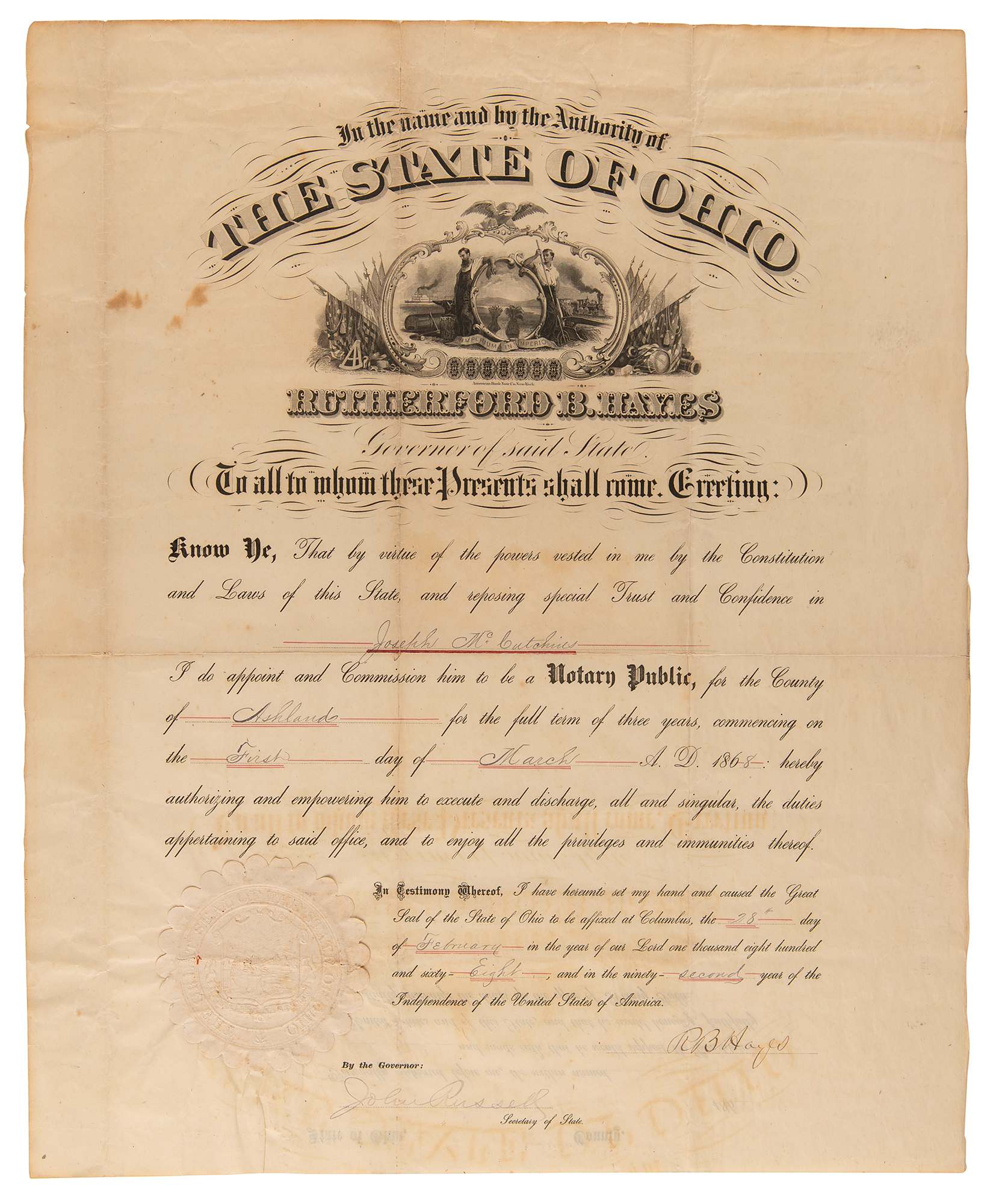 Partly-printed DS, signed “R. B. Hayes,” one page, 13.75 x 17, February 28, 1868. As governor of Ohio, Hayes appoints Joseph McCutchins "to be a Notary Public, for the County of Ashland." Neatly signed at the conclusion in ink by Governor Rutherford B. Hayes and countersigned by Secretary of State John Russell. The embossed paper seal remains intact at lower left. In very good to fine condition, with creasing, small stains, some light toning, and tape reinforcements to the back of the intersecting folds; Hayes's signature is clear, dark, and otherwise unaffected.