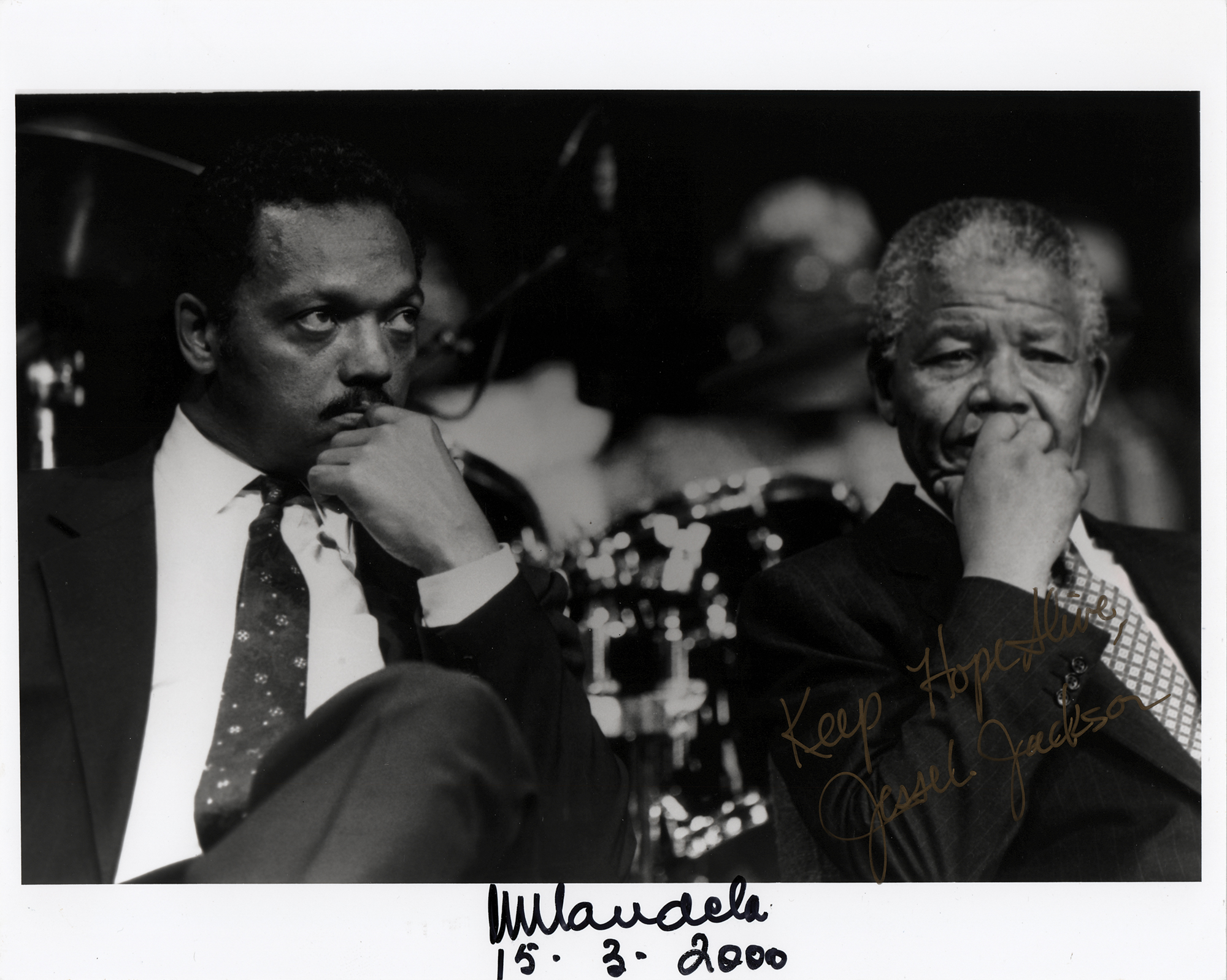 Scarce glossy 10 x 8 photo of civil rights leaders Nelson Mandela and Jesse Jackson together, signed in black felt tip, "N. Mandela, 15-3-2000," and in gold ink, "Keep Hope Alive, Jesse L. Jackson." In fine condition, with a couple of minor surface creases, and a light paperclip impression to the top edge. A sharp image boasting a scarce combination of autographs.
