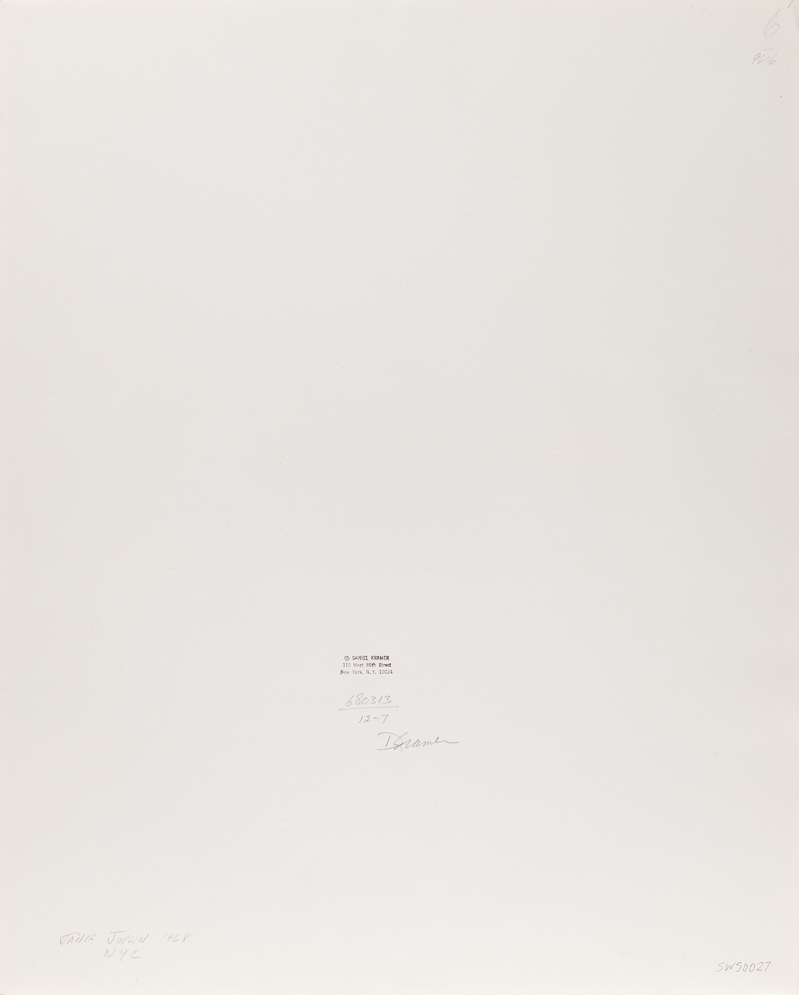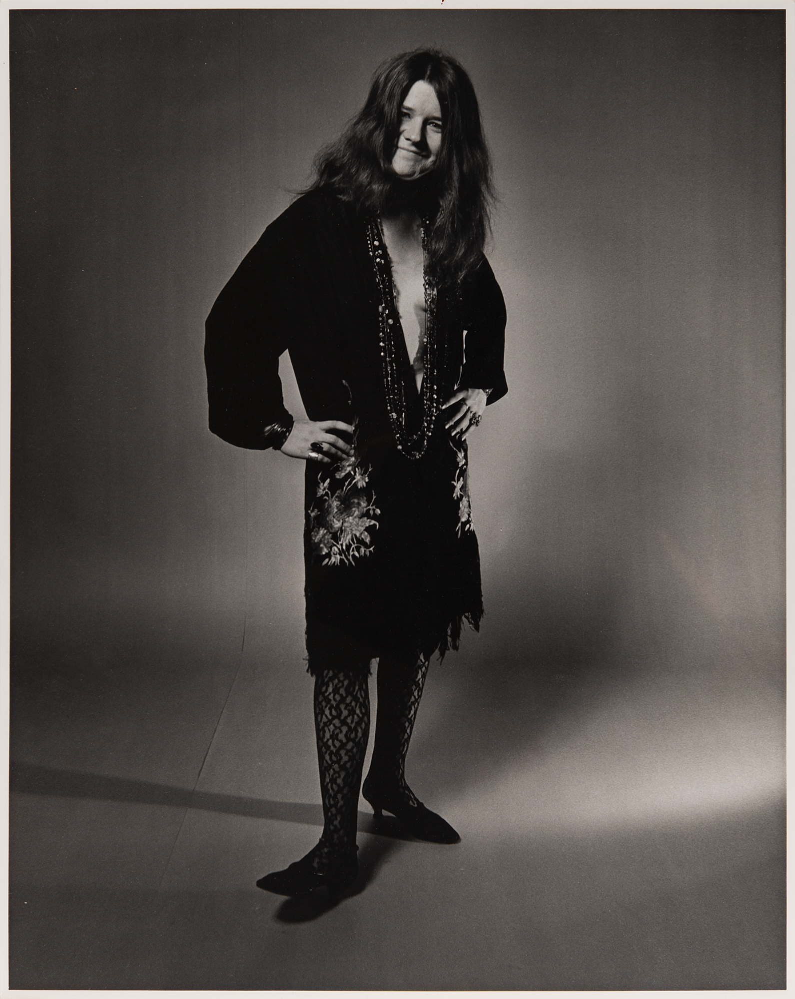 Fantastic original semi-glossy 16 x 20 silver gelatin photograph of Janis Joplin in a full-length pose, decked out in her trademark Bohemian wardrobe—a flowy, low-cut dress, several rings and necklaces, and fishnet tights—taken by photographer Daniel Kramer in New York City in 1968. Captioned and signed on the reverse in pencil, "D. Kramer," and also stamped with his copyright. In fine condition.