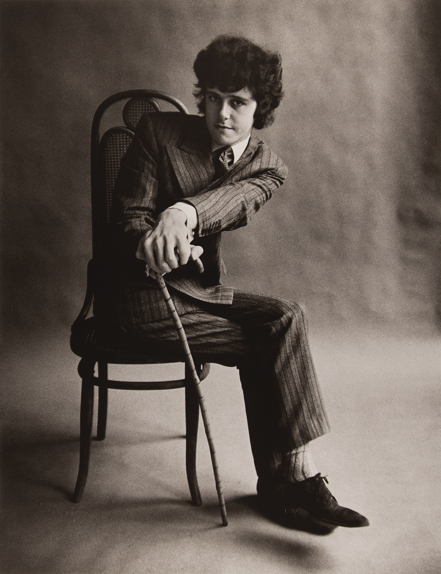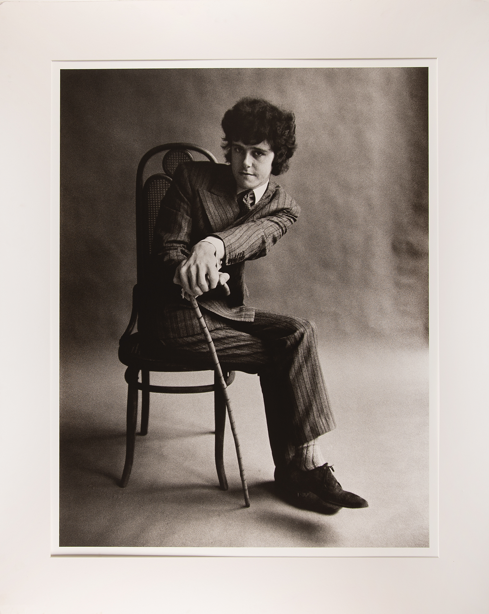 From the personal collection of legendary rock photographer Barry Feinstein—a massive original 31.5 x 40 photographic print of Donovan seated in a chair, hands wrapped around the head of a rustic walking cane, taken by Barry Feinstein in New York City in 1964 and printed by Barry himself. Matted to an overall size of 40 x 50. In fine condition.