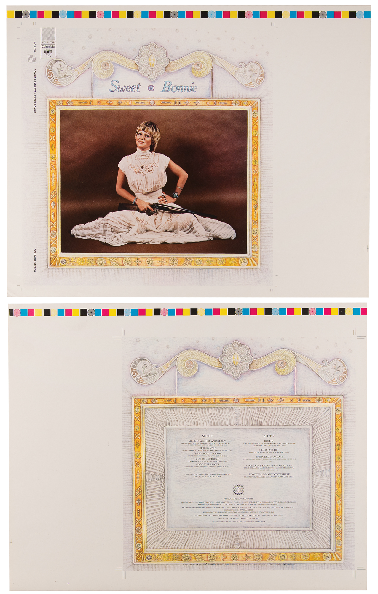From the personal collection of legendary rock photographer Barry Feinstein—a pair of original vintage album cover test print proofs for Bonnie Bramlett's 1973 solo debut album Sweet Bonnie Bramlett, 19 x 15.25, printed on slick lightweight stock with printer's marks in the borders. One features the front cover, showing "Sweet Bonnie" posed with a shotgun across her lap; the other features the back cover with track listing and album credits, elegantly framed. In the final version of the album's artwork, the title over her head was elongated to 'Sweet Bonnie Bramlett.' In overall fine condition.