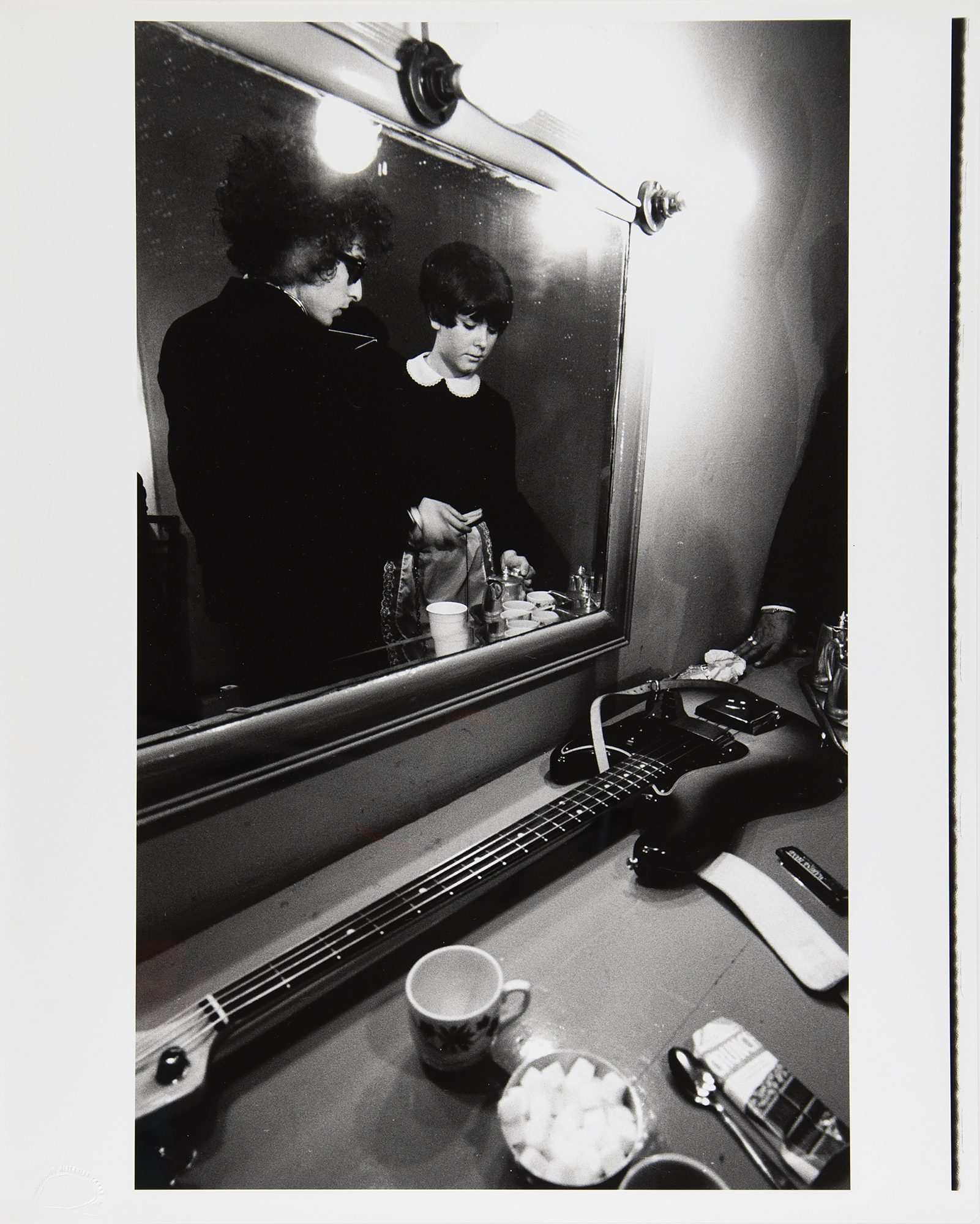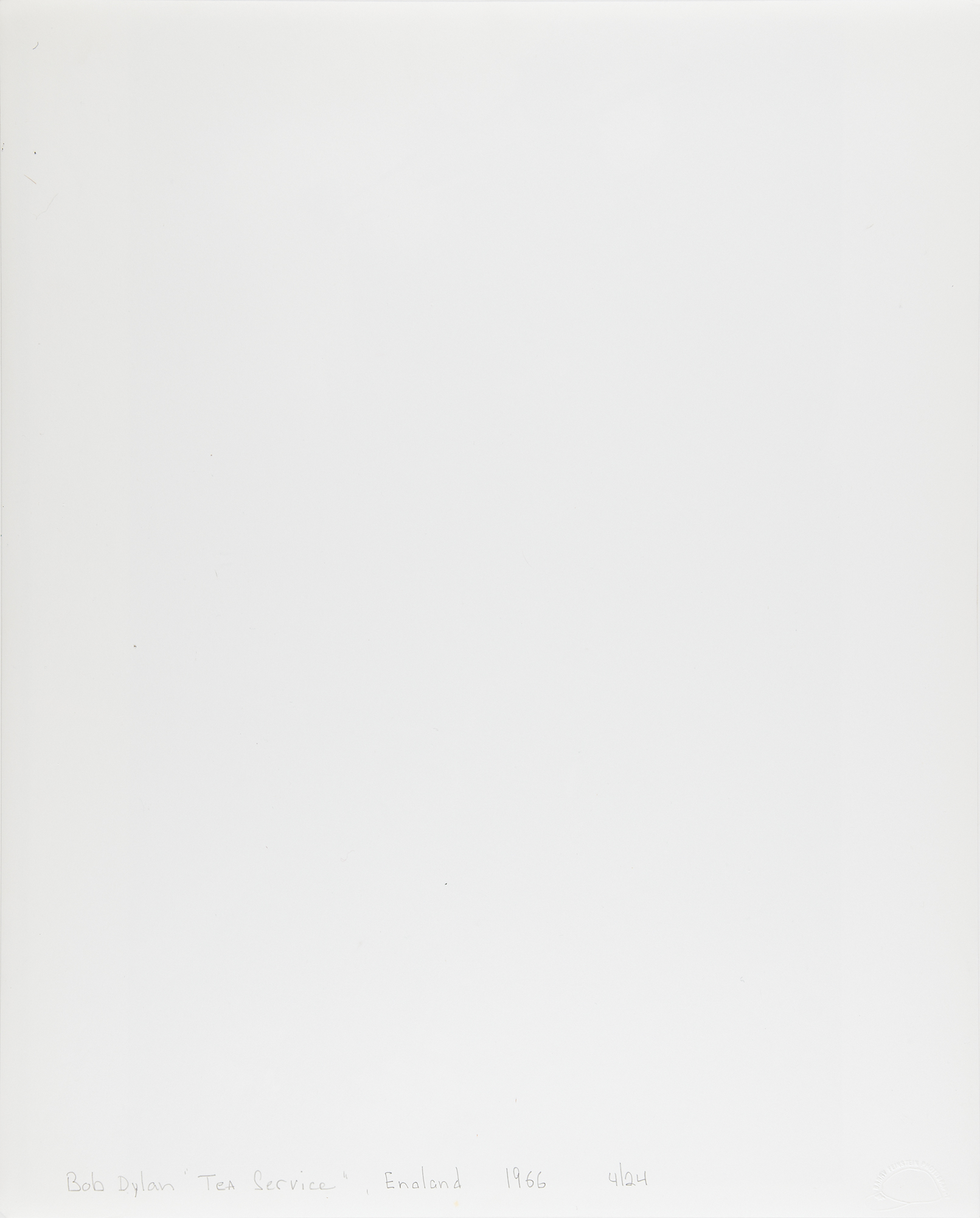 Limited edition semi-glossy 15.75 x 19.75 silver gelatin photograph of Bob Dylan enjoying tea service in England during his 1966 World Tour, taken by Barry Feinstein. The photographer expertly frames the sunglasses-clad rock star in a mirror over a surface that carries an electric bass and various teatime accoutrements. Titled and numbered on the reverse in pencil: "Bob Dylan, Tea Service, England, 1966, 4/24." Embossed at the bottom with a "Barry Feinstein Photography" blindstamp. In fine condition.