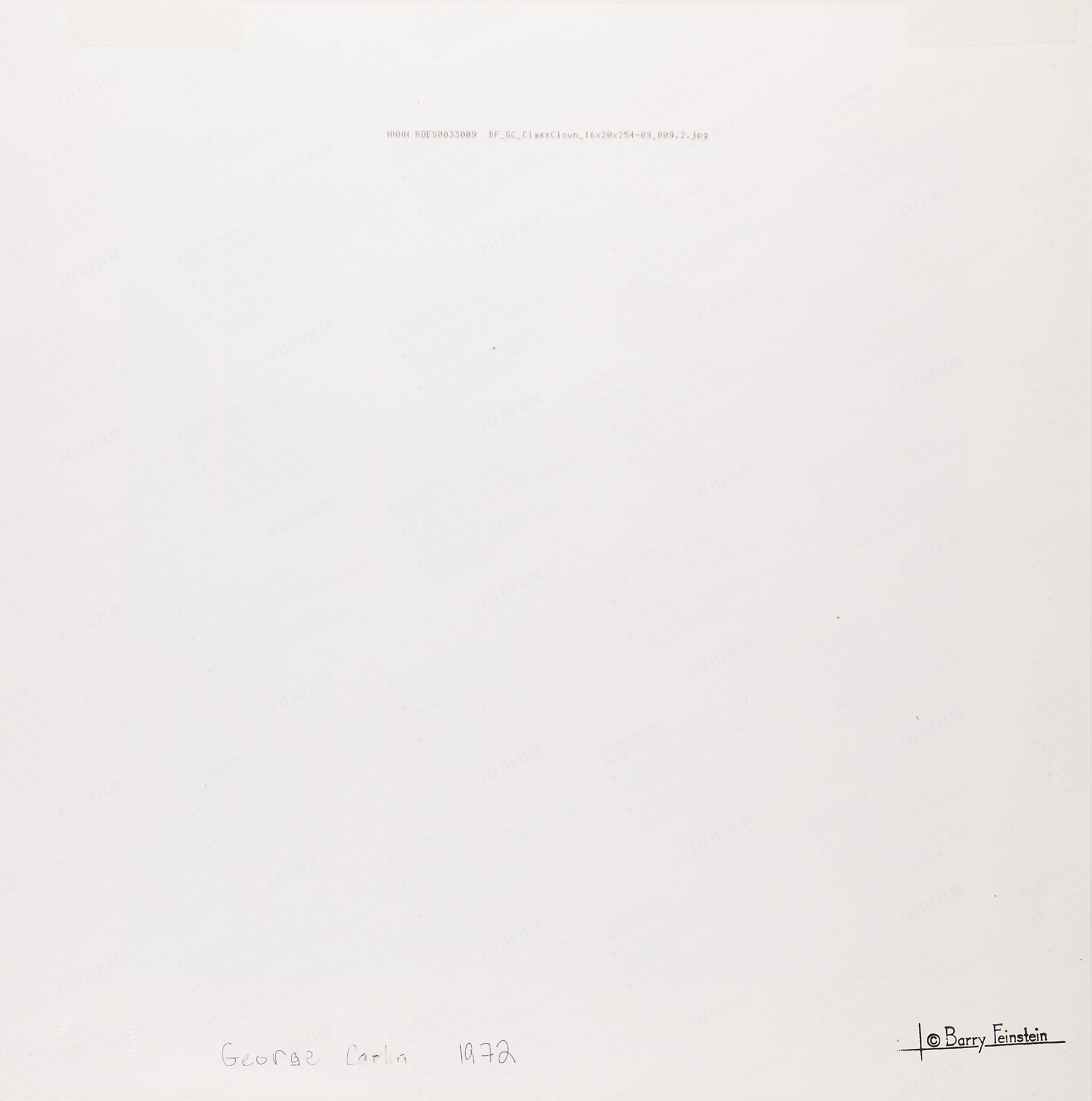Color satin-finish 16 x 16 print of the cover shot taken by photographer Barry Feinstein for George Carlin's 1972 comedy album Class Clown, embossed at the bottom with a "Barry Feinstein Photography" blindstamp. Reverse bears Fujicolor Professional watermarks and Feinstein's ink copyright stamp. In fine condition.