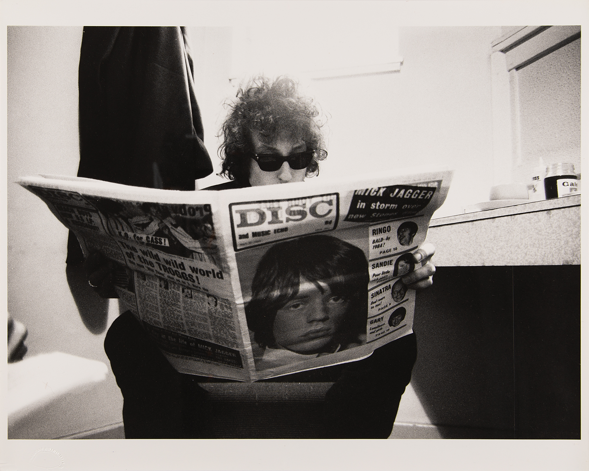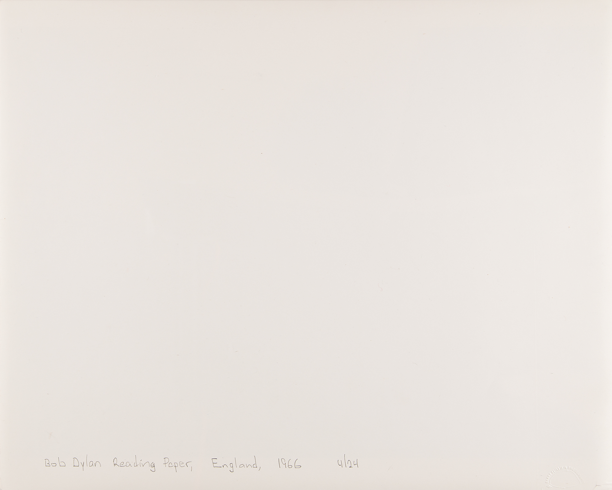 Limited edition semi-glossy 19.75 x 15.75 silver gelatin photograph of Bob Dylan reading the British popular music magazine Disc and Music Echo—with a cover story on Rolling Stones frontman Mick Jagger—taken by Barry Feinstein in England during Dylan's 1966 World Tour. Titled and numbered on the reverse in pencil: "Bob Dylan, Reading Paper, England 1966, 4/24." Embossed at the bottom with a "Barry Feinstein Photography" blindstamp. In fine condition.