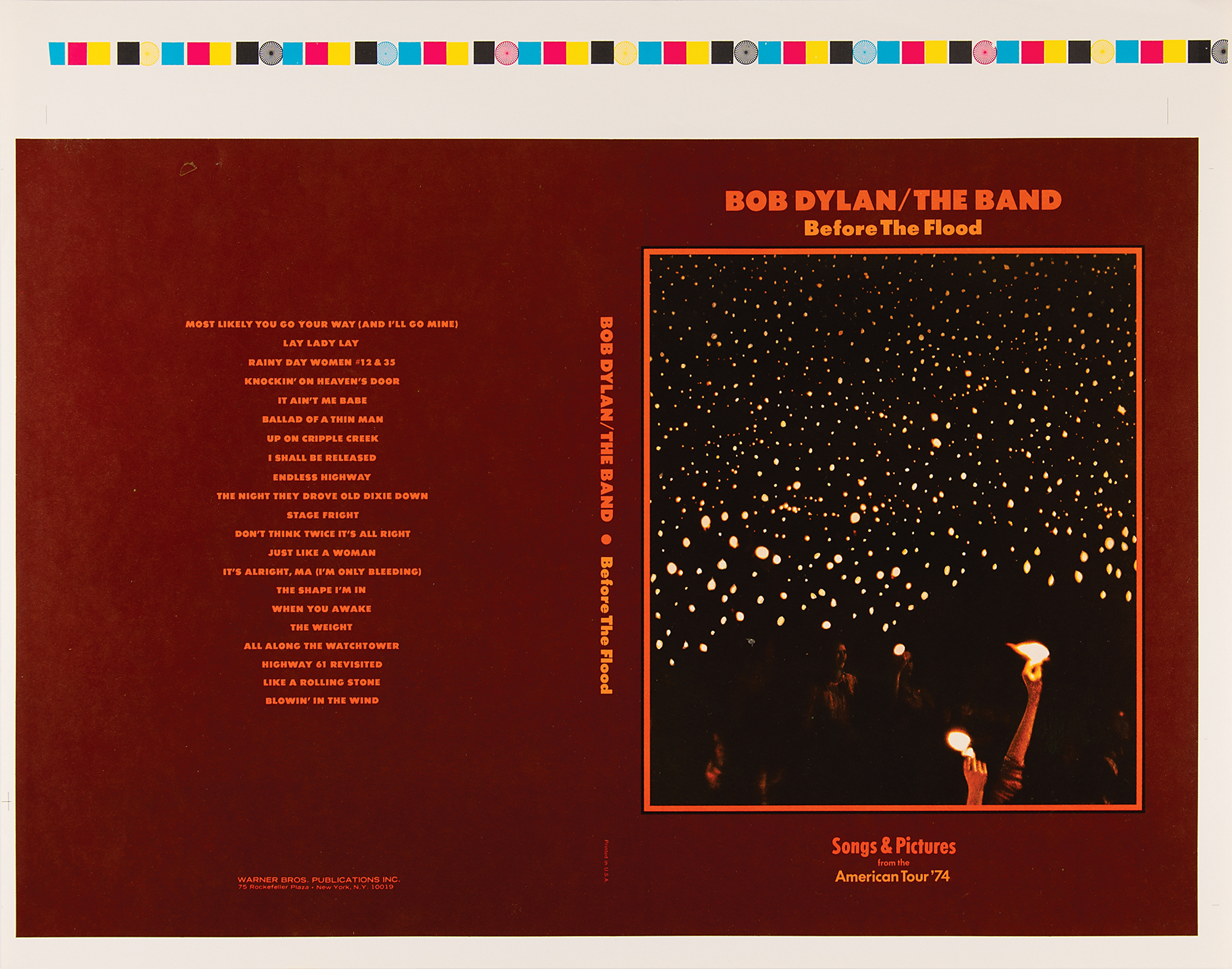 From the personal collection of legendary rock photographer Barry Feinstein—an original vintage book cover test print proof for "Bob Dylan/The Band, Before the Flood: Songs & Pictures from the American Tour '74," released by Warner Bros. Publications as a songbook companion to the live album of the same name, 20 x 15.75, printed on slick lightweight stock with printer's marks in the borders. In fine condition.