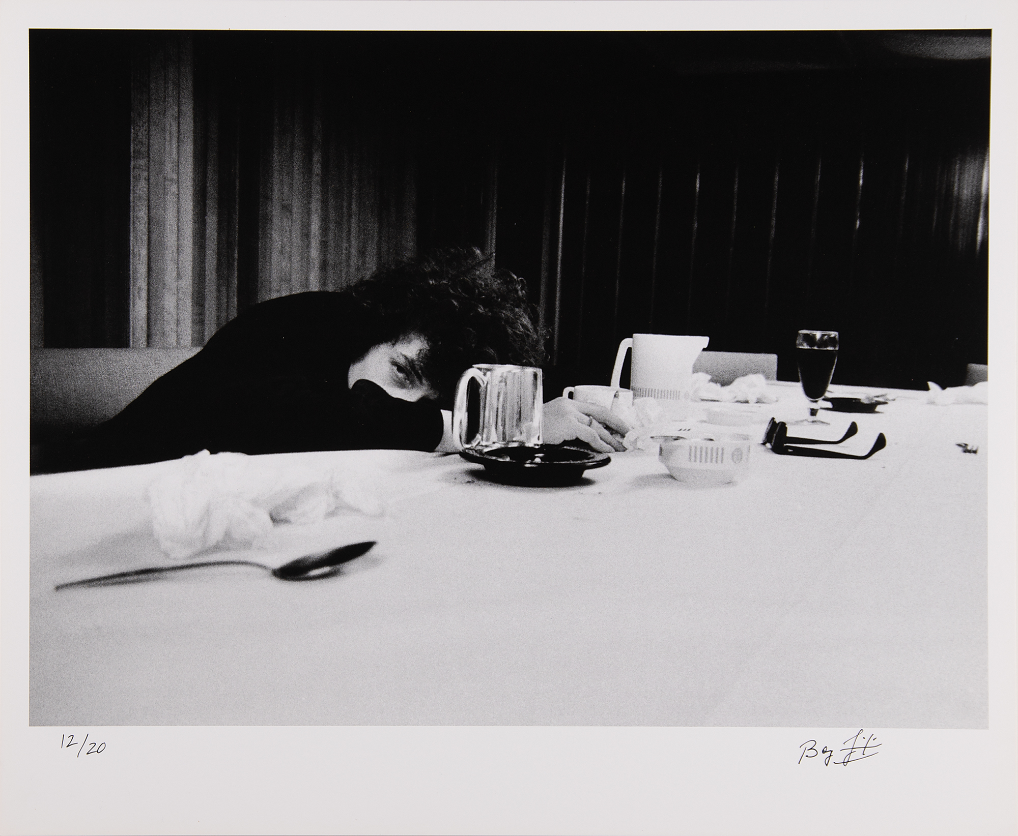 Limited edition semi-glossy 17 x 14 photographic print showing Bob Dylan slumped over a diner table in Cardiff, Wales, during his 1966 World Tour, numbered 12/20, signed in the lower border in black felt tip by photographer Barry Feinstein. Stamped on the reverse Feinstein's ink copyright stamp. In fine condition.