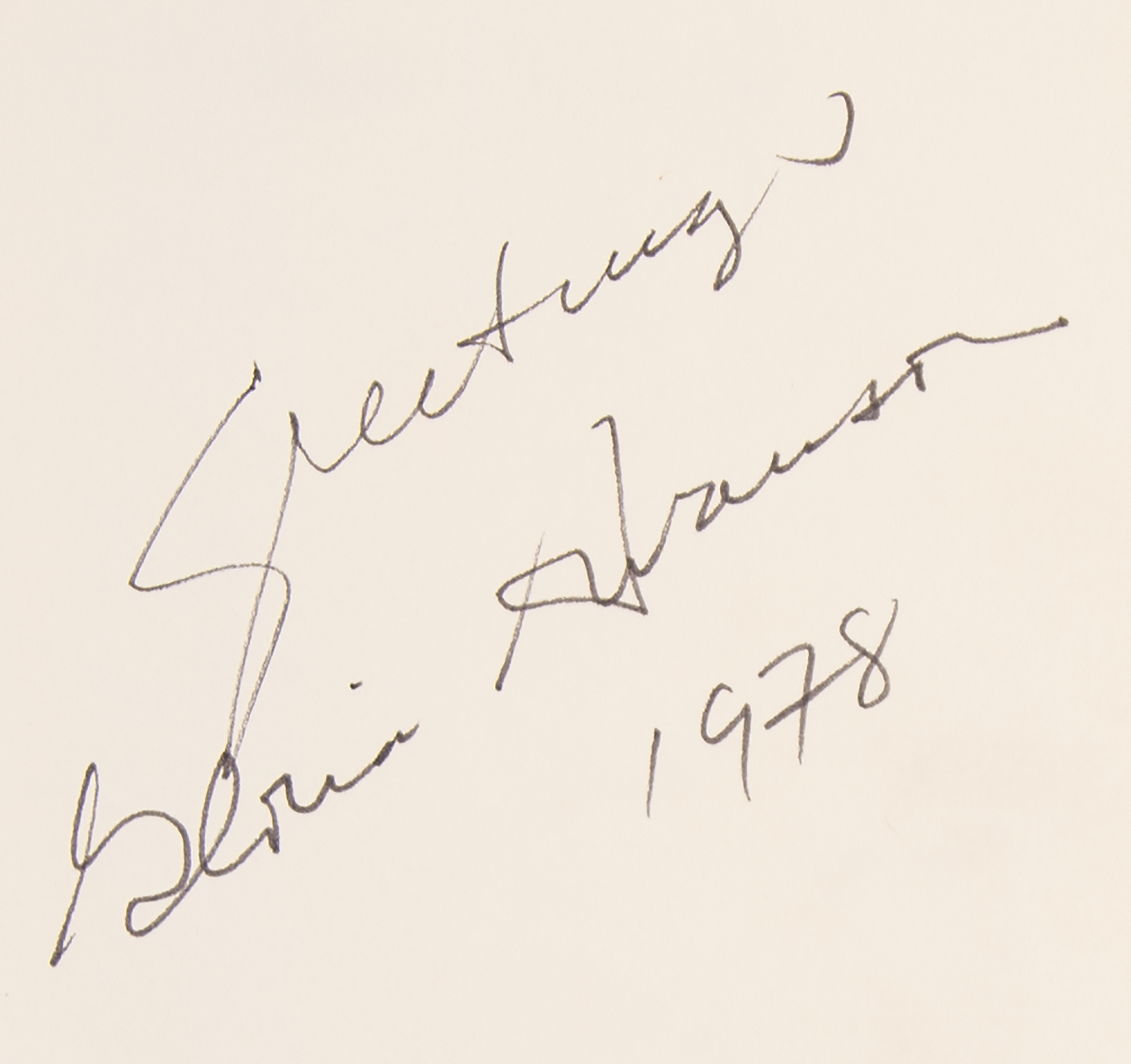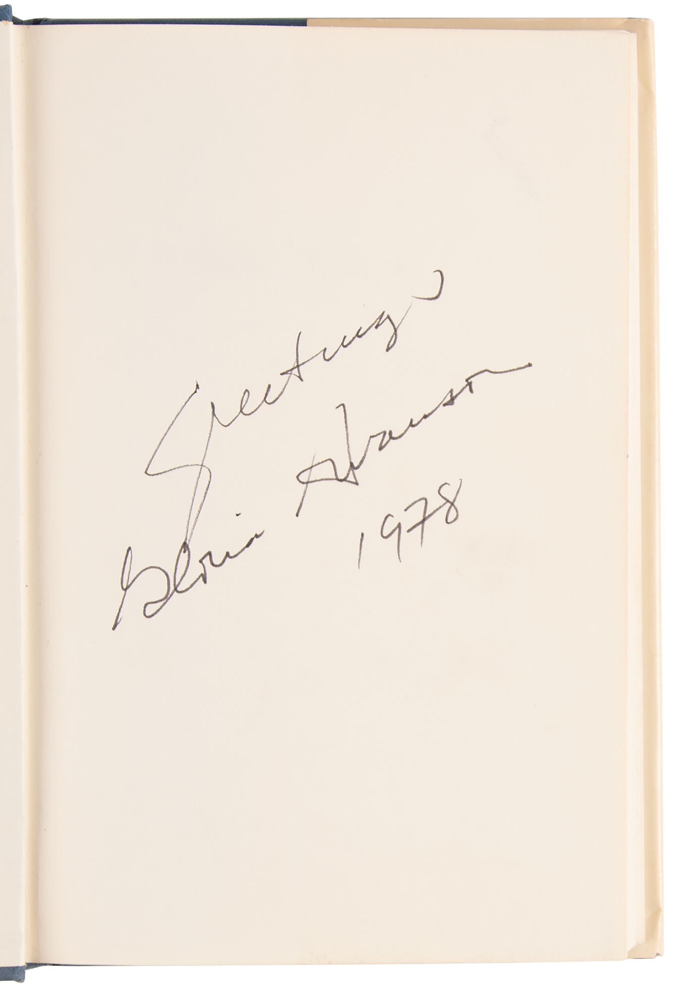 Signed book: Gloria Swanson by Richard Hudson and Raymond Lee. Later printing. NY: Castle Books, 1970. Hardcover with dust jacket, 7 x 10.25, 269 pages. Signed on the first free end page in black felt tip, "Greetings, Gloria Swanson, 1978." In fine condition, with light toning to the dust jacket spine.