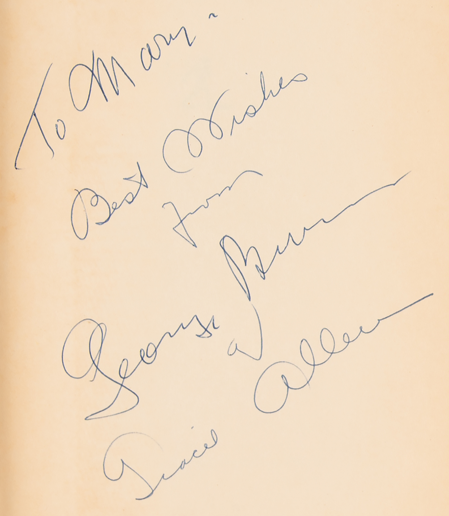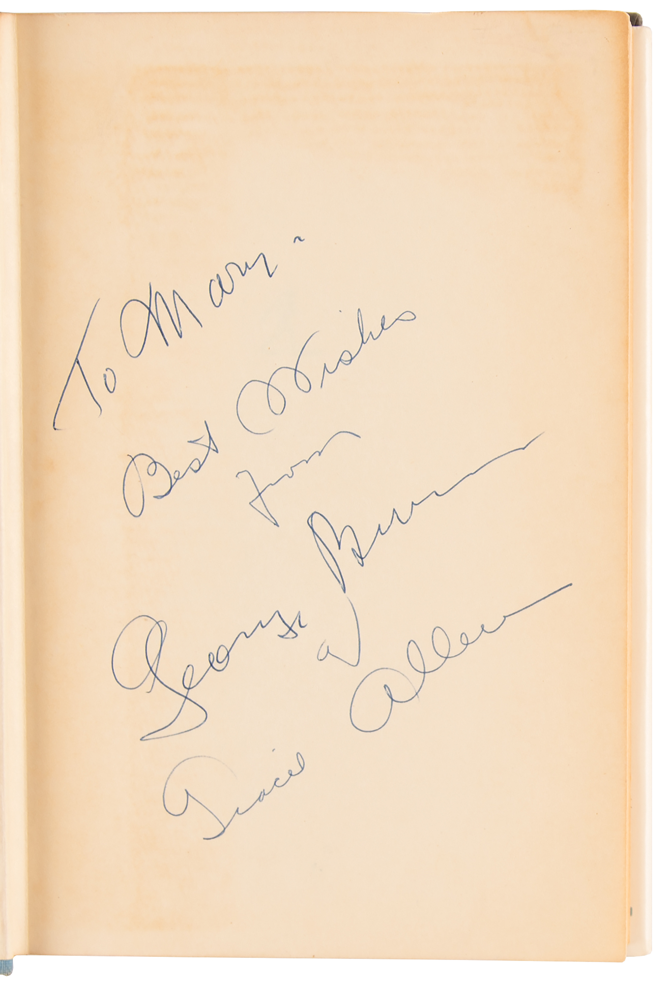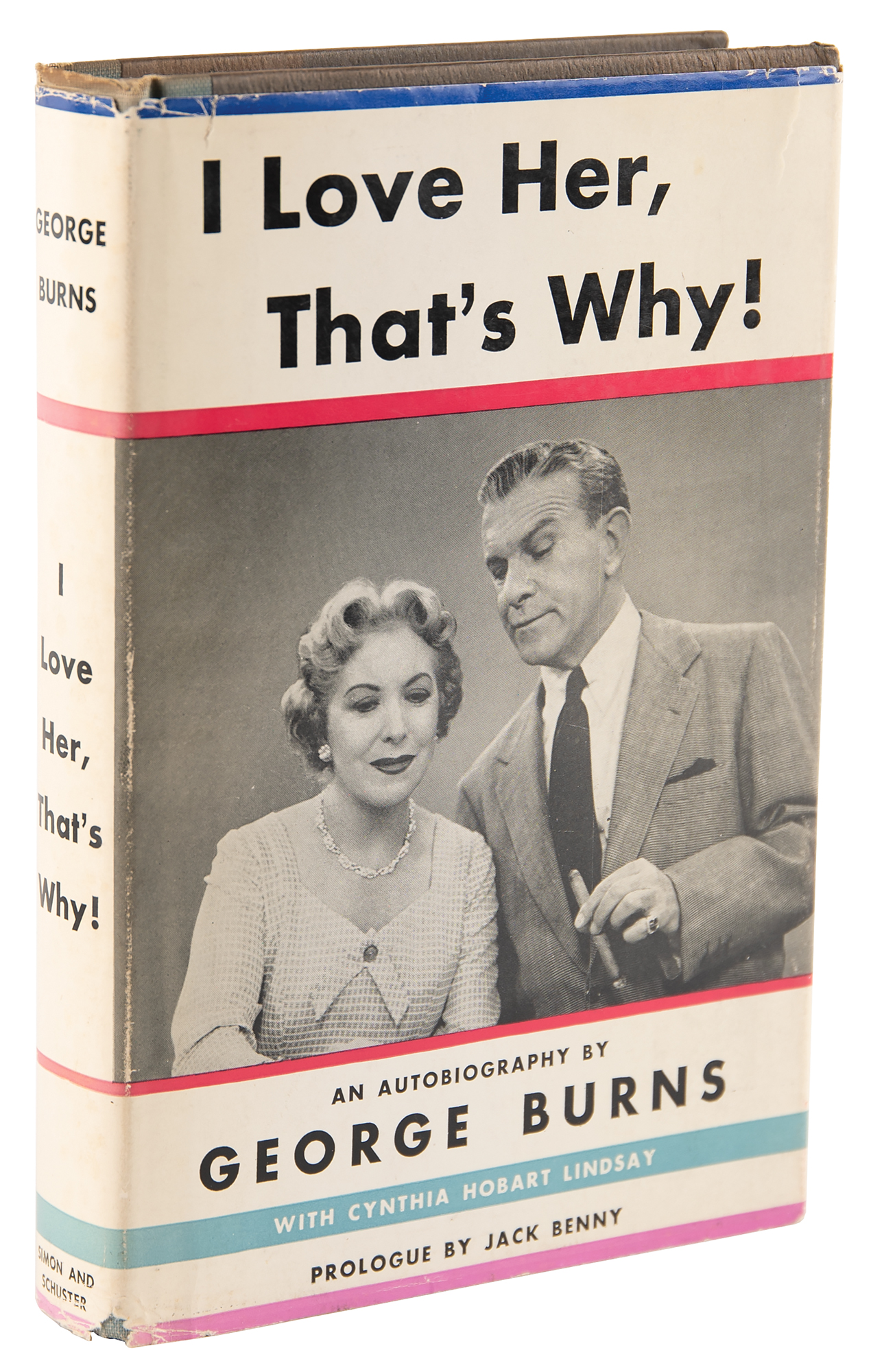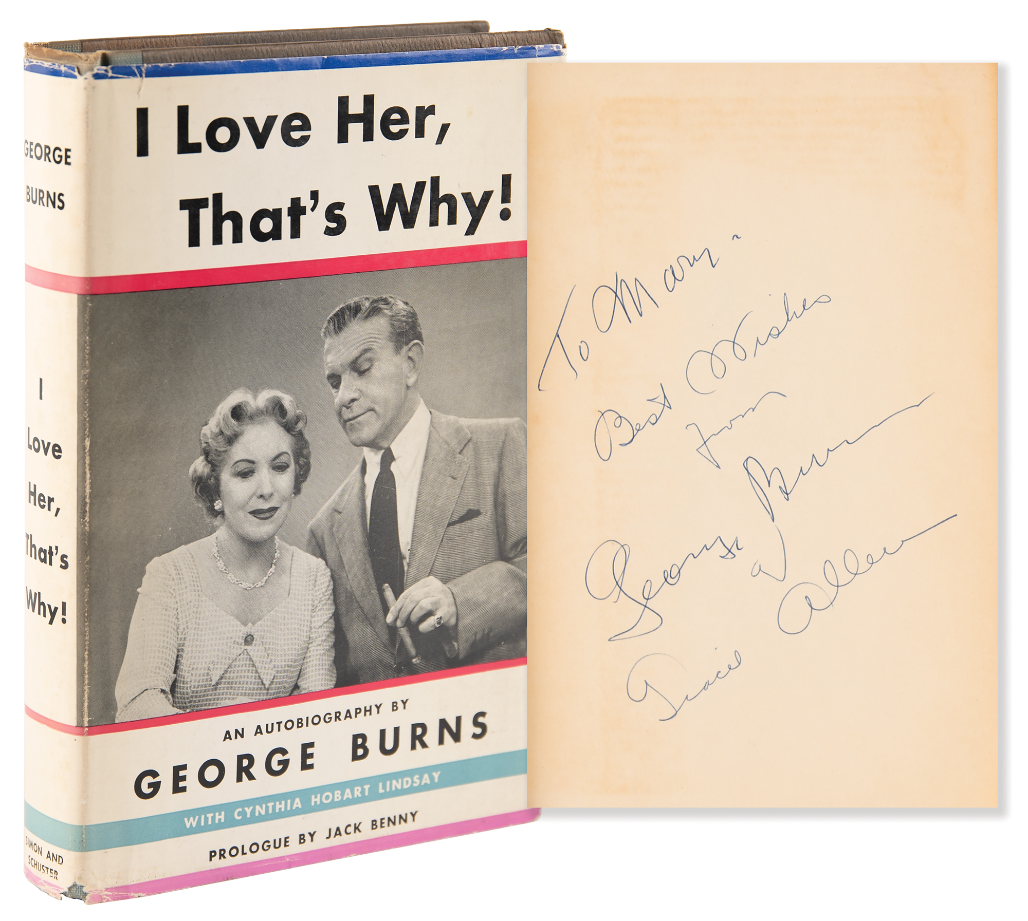 Signed book: I Love Her, That's Why!. First edition. NY: Simon and Schuster, 1955. Hardcover with dust jacket, 5.75 x 8.5, 267 pages. Signed and inscribed on the half-title page in blue ballpoint, "To May, best wishes from George Burns" and "Gracie Allen." In fine condition.