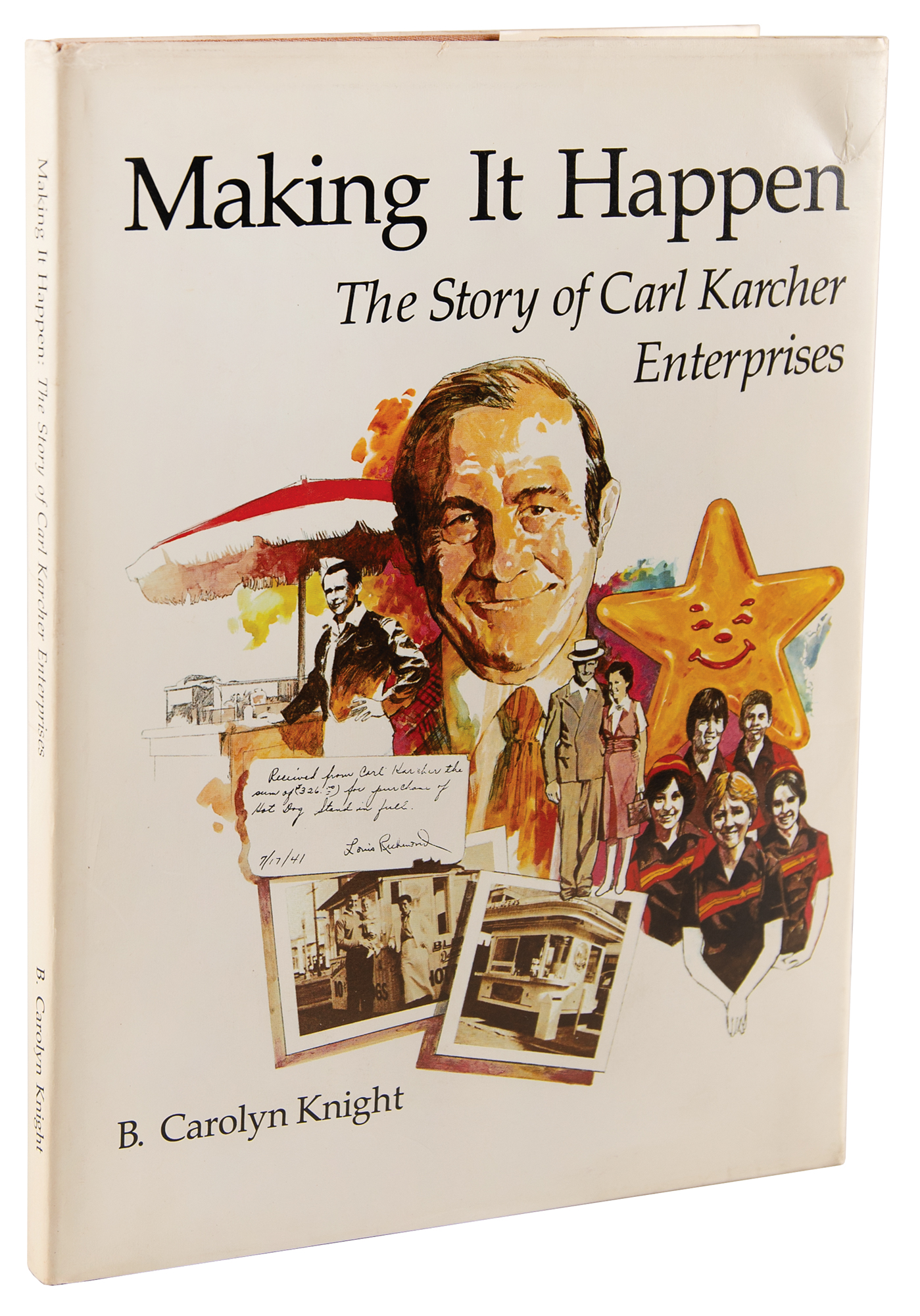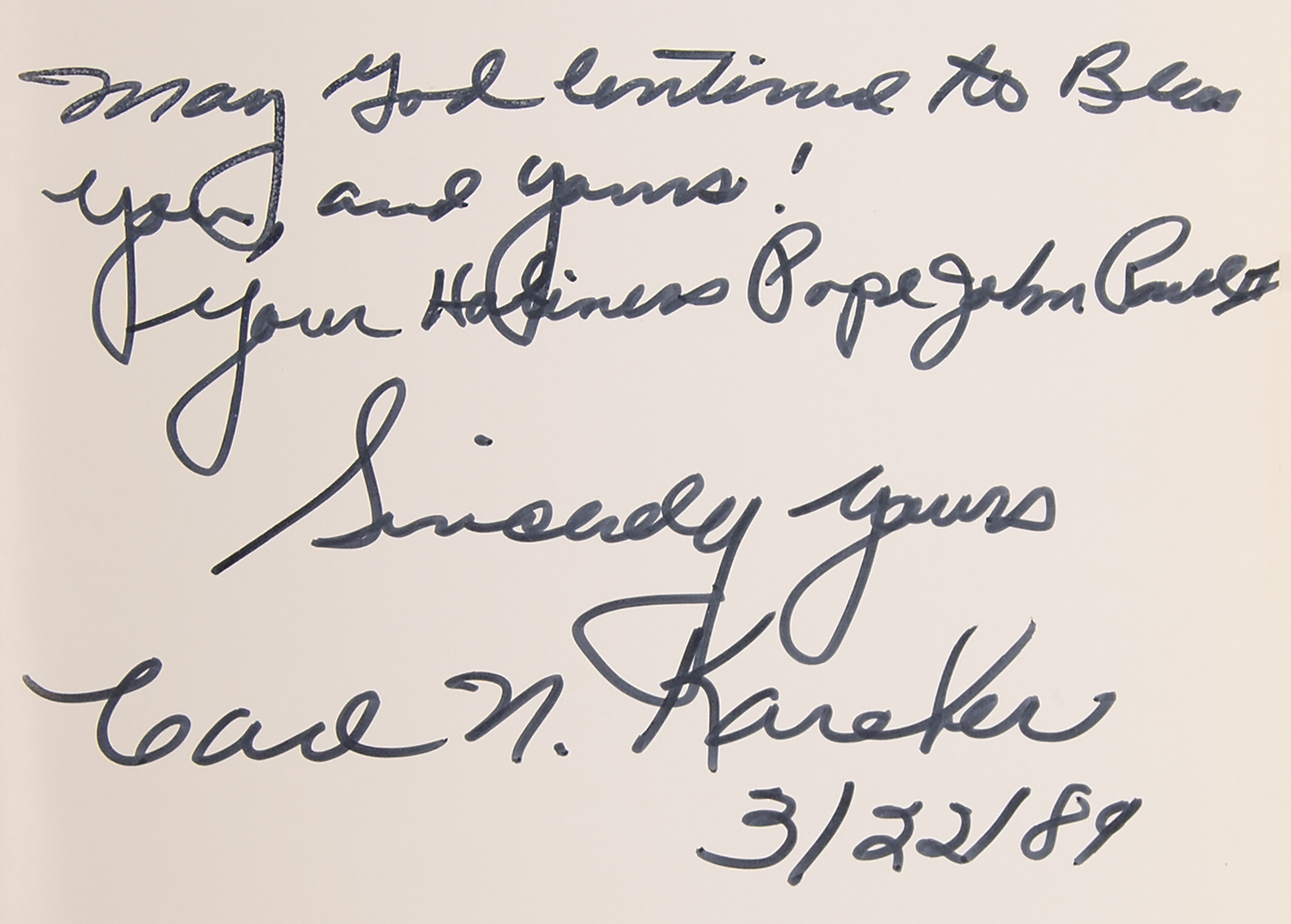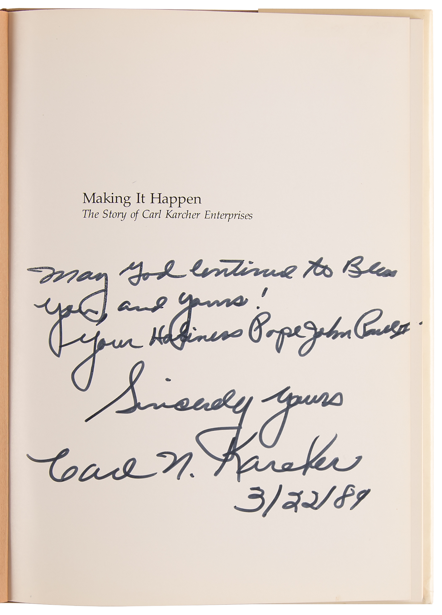 Founder of the Carl's Jr. hamburger chain (1917–2008). Signed book: Making It Happen: The Story of Carl Karcher Enterprises. Anaheim: Carl Karcher Enterprises, 1981. Hardcover with dust jacket, 7.75 x 10.25, 143 pages. Signed on the half-title page in black felt tip, "May God continue to Bless you and yours! Your Holiness Pope John Paul II, Sincerely yours, Carl N. Karcher, 3/22/1989." In fine condition, with light toning and tears to the dust jacket.