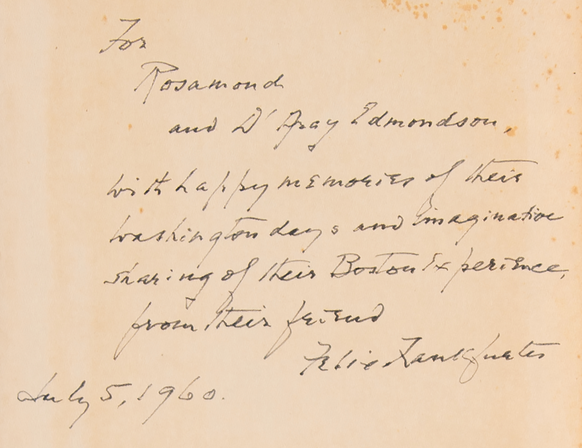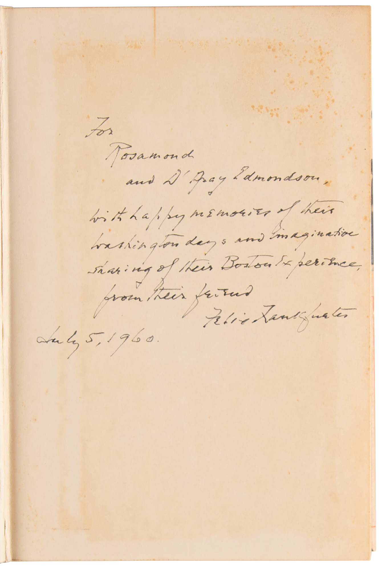 Signed book: Reminisces. Later printing. NY: Reynal & Company, 1960. Hardcover with dust jacket, 6 x 8.5, 310 pages. Signed and inscribed on the first free end page in fountain pen, "For Rosamond and D'Aray Edmondson, with happy memories of their Washington days and imaginative sharing of their Boston experience, from their friend, Felix Frankfurter, July 5, 1960." In very good to fine condition, with light toning and staining to the signed page, and a price-clipped jacket.