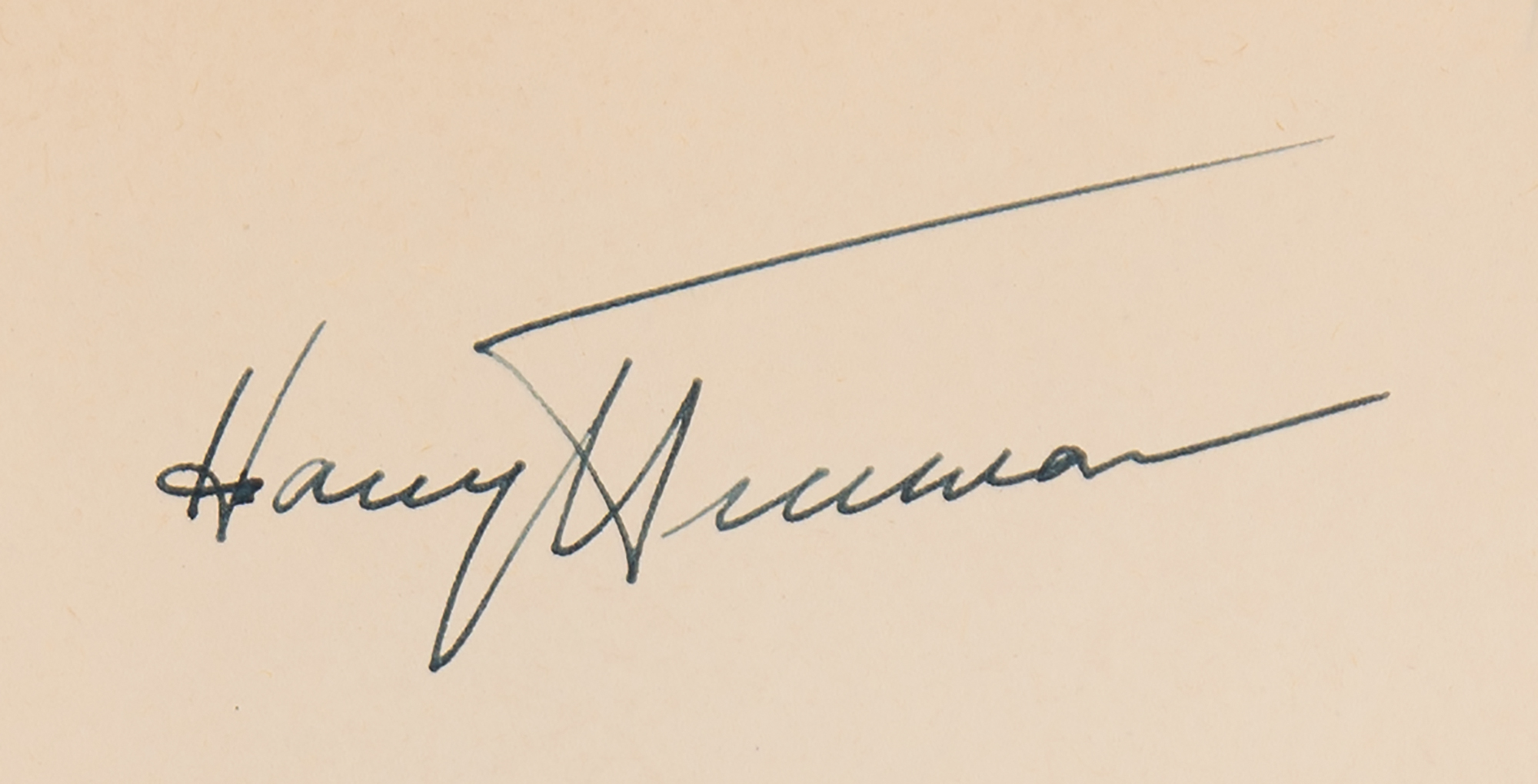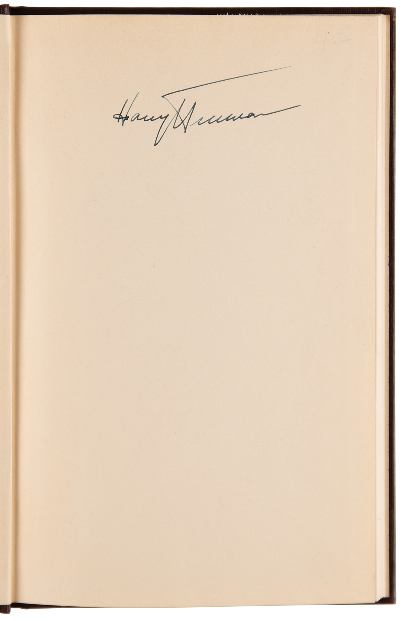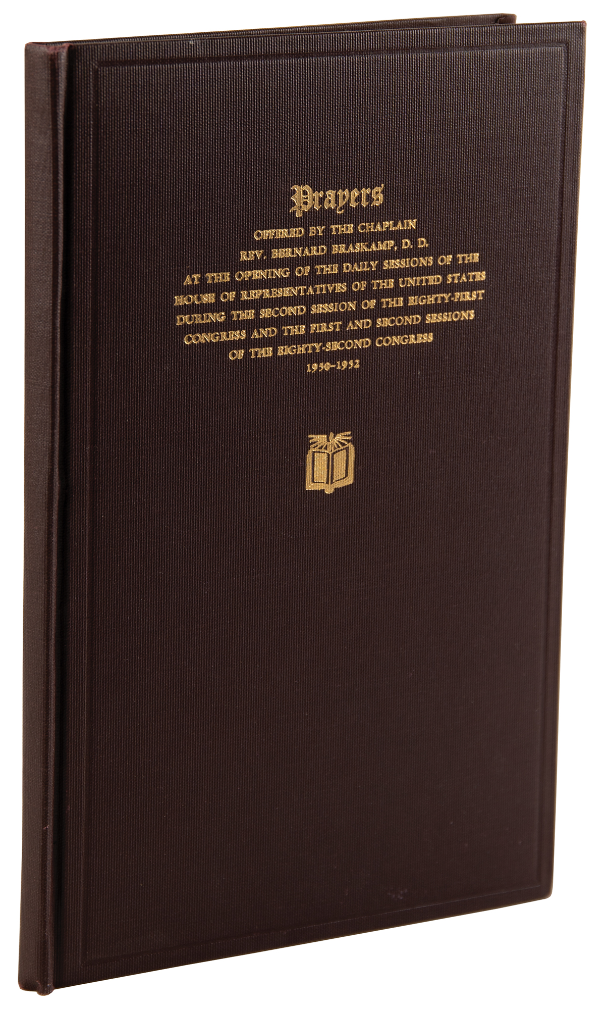 Signed book: Prayers Offered by the Chaplain Rev. Bernard Braskamp, D.D. at the Opening of the Daily Sessions of the House of Representatives of the United States During the Second Session of the Eighty-First Congress and the First and Second Sessions of the Eighty-Second Congress, 1950–1952. First edition. Washington, D.C.: United States Government Printing Office, 1952. Hardcover, 6 x 9.25, 146 pages. Signed on the first free end page in fountain pen, "Harry S. Truman." In very fine condition.
