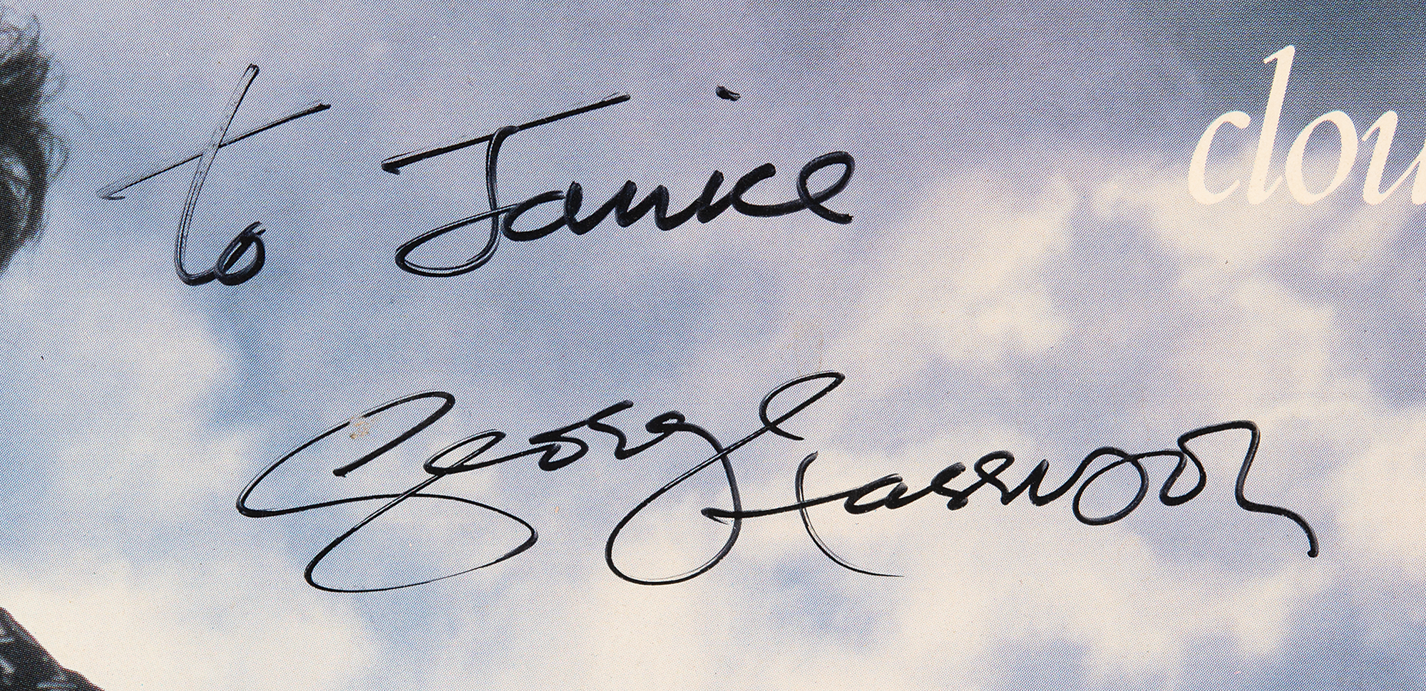 Cloud Nine album signed and inscribed on the front cover in black felt tip, "To Janice, George Harrison." In fine condition, with a light crease to the upper left corner. The record is not included.