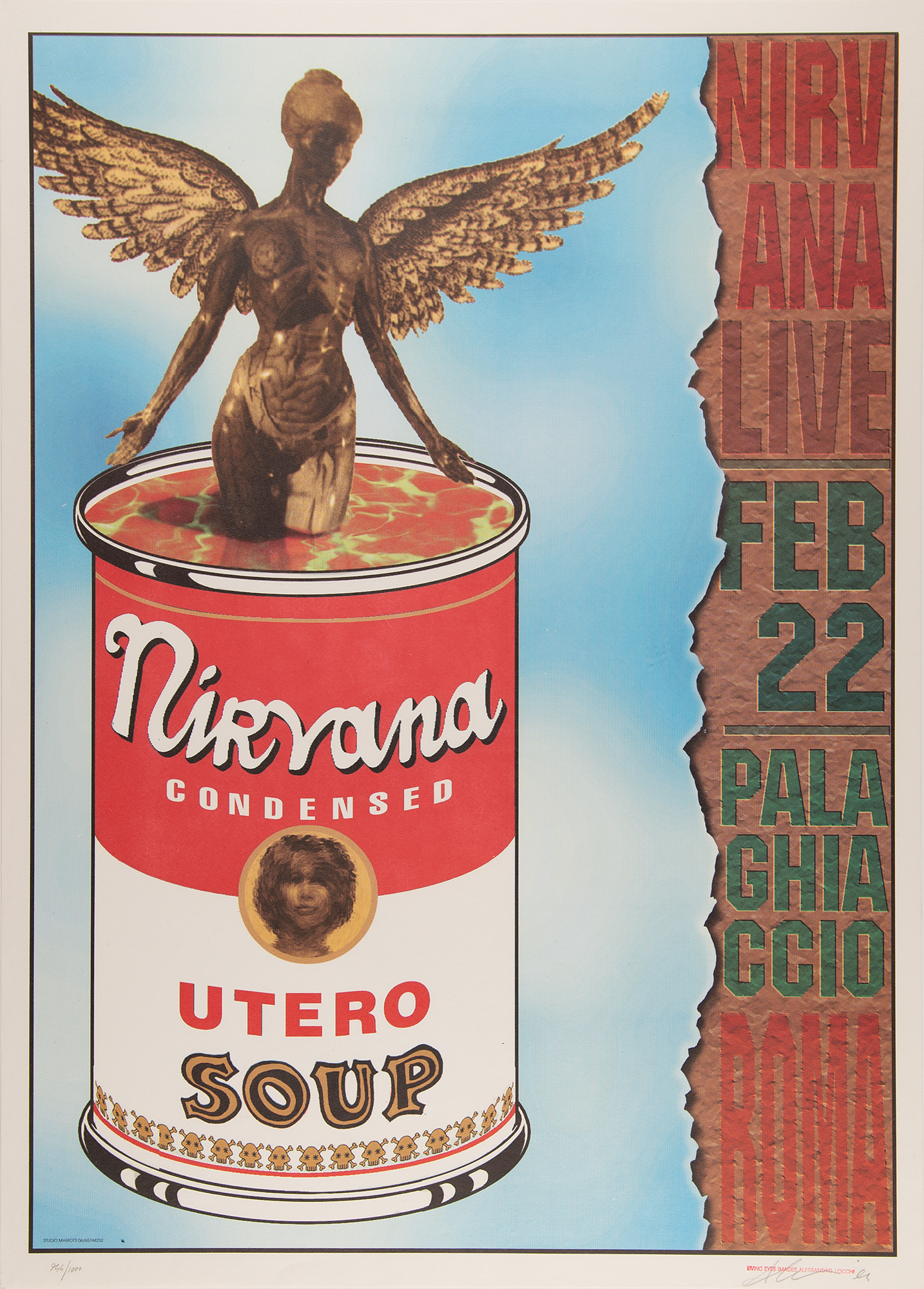 Attractive limited edition original 19.5 x 27.5 concert poster for Nirvana at the Palaghiaccio di Marino near Rome, Italy, on February 22, 1994, numbered 944/1000, signed in the lower border in pencil by artist Alessandro Locchi. The surreal artwork, inspired by Andy Warhol’s iconic Campbell’s soup can, reinterprets it as "Nirvana Utero Soup," incorporating the winged anatomical figure from the band’s 'In Utero' album cover: the figure rises from the can, symbolizing Nirvana’s poignant themes of rebirth and decay. In very fine condition.