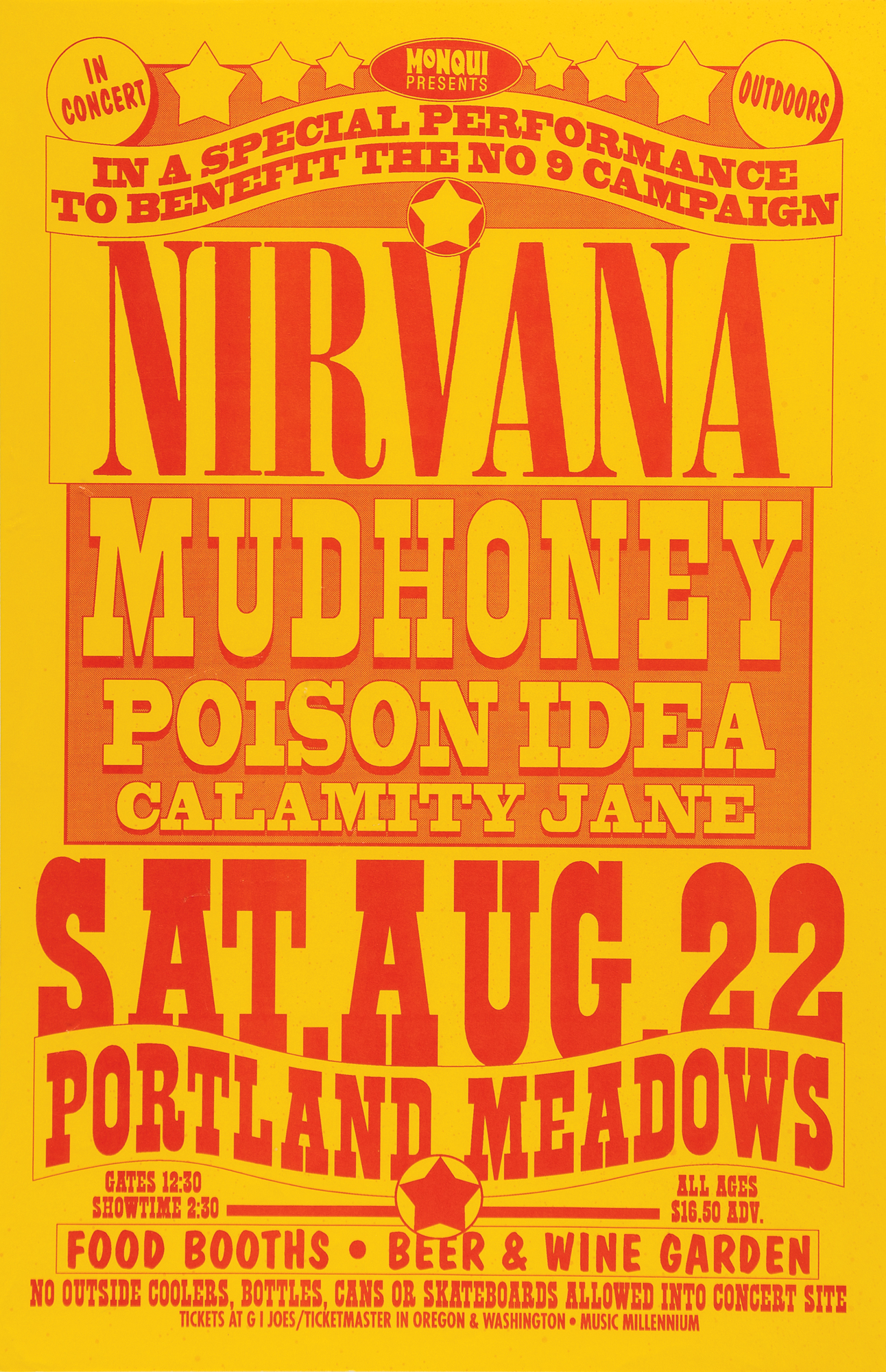 Original red-and-yellow 11 x 17 single-sided concert poster for Nirvana at Portland Meadows in Oregon on August 22, 1992, supported by Mudhoney, Poison Idea, and Calamity Jane, in a "special performance to benefit the No 9 Campaign." A disclaimer along the bottom reads: "No outside coolers, bottles, cans or skateboards allowed into concert site." In fine condition.