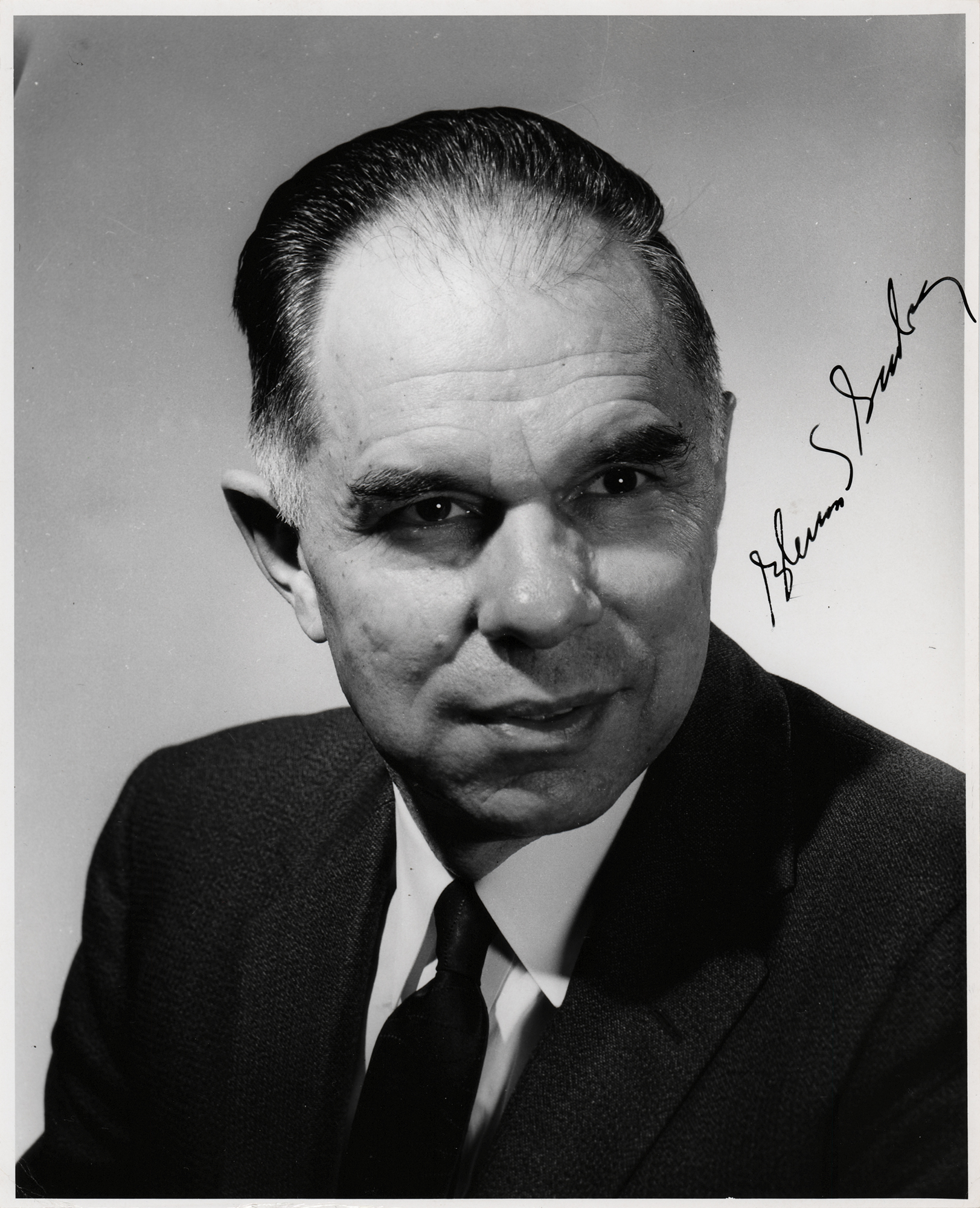 Nobel Prize-winning chemist (1912–1999) who was instrumental in the discovery of several elements, and developed the extraction process used to isolate the plutonium fuel for the second atomic bomb during the Manhattan Project. Sharp vintage glossy 8 x 10 head-and-shoulders photo of Seaborg in a suit and tie, boldly signed in fountain pen. In fine condition, with small creases to the lower left corner tip.