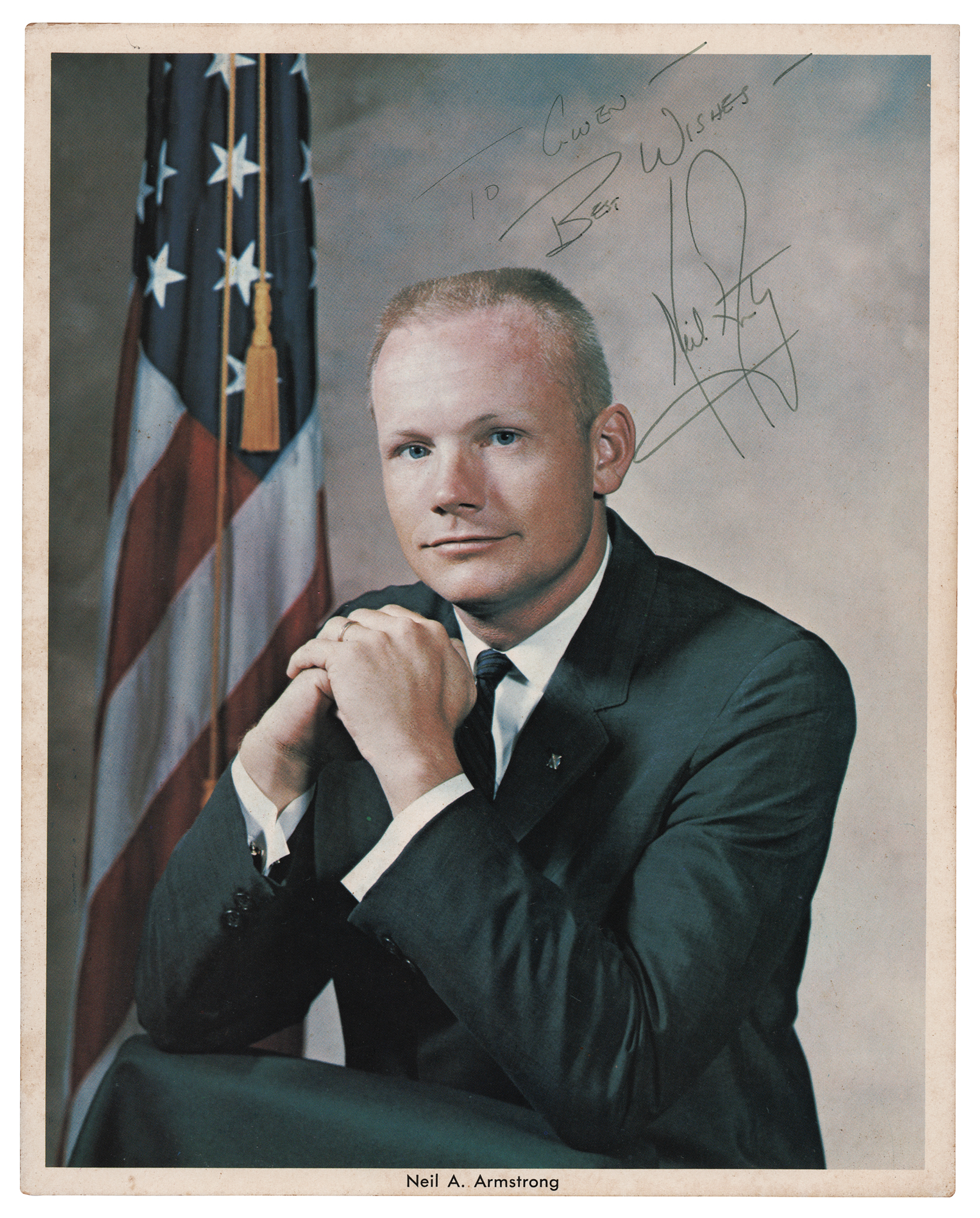 Desirable official color 8 x 10 NASA lithograph of Neil Armstrong during the Gemini era, signed and inscribed in black felt tip, "To Gwen—Best Wishes—Neil Armstrong.” In fine condition.