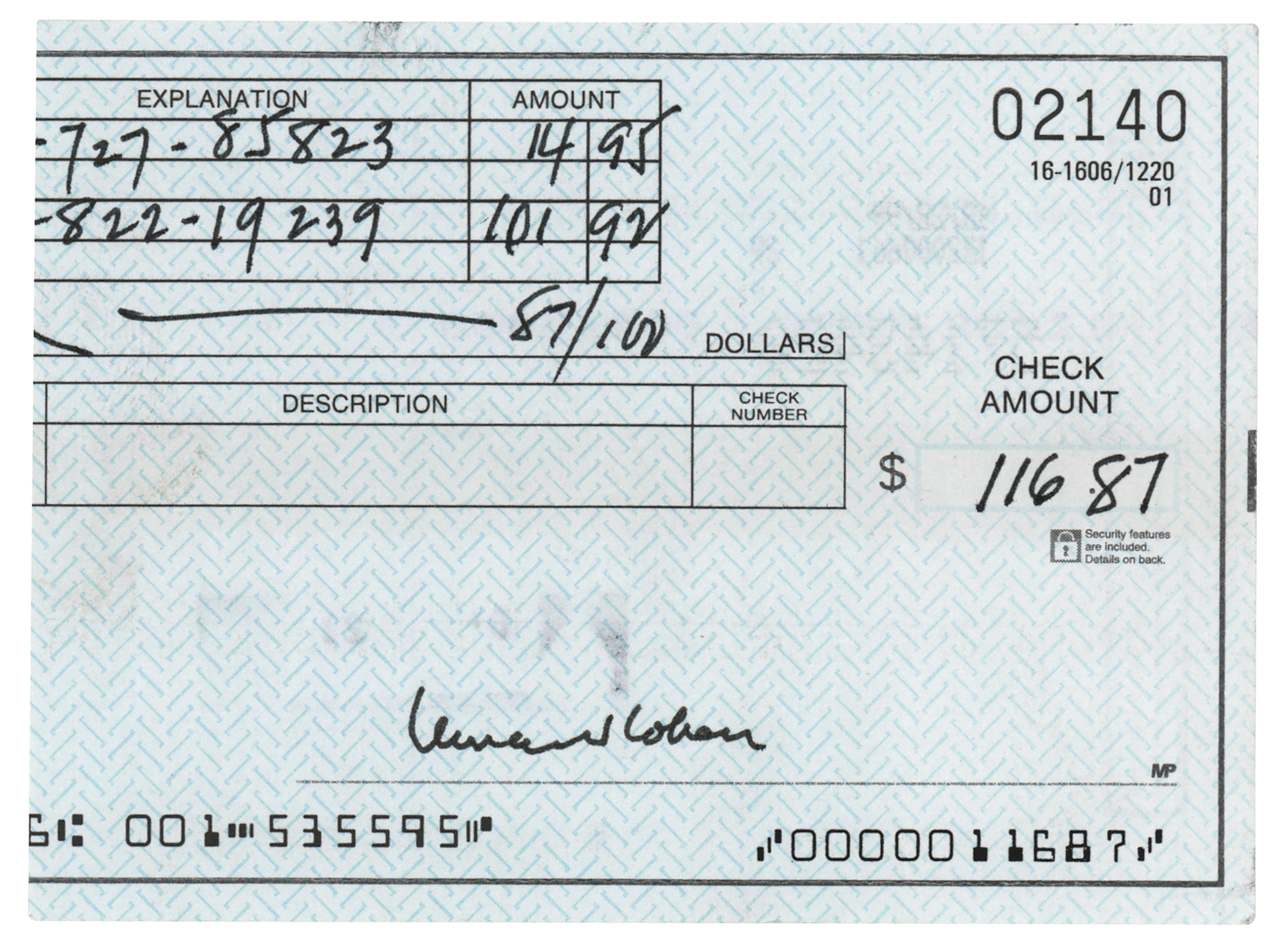 Felt tip signature, "Leonard Cohen,” on a 4.5 x 3.25 slip cut from a personal check. In fine condition.