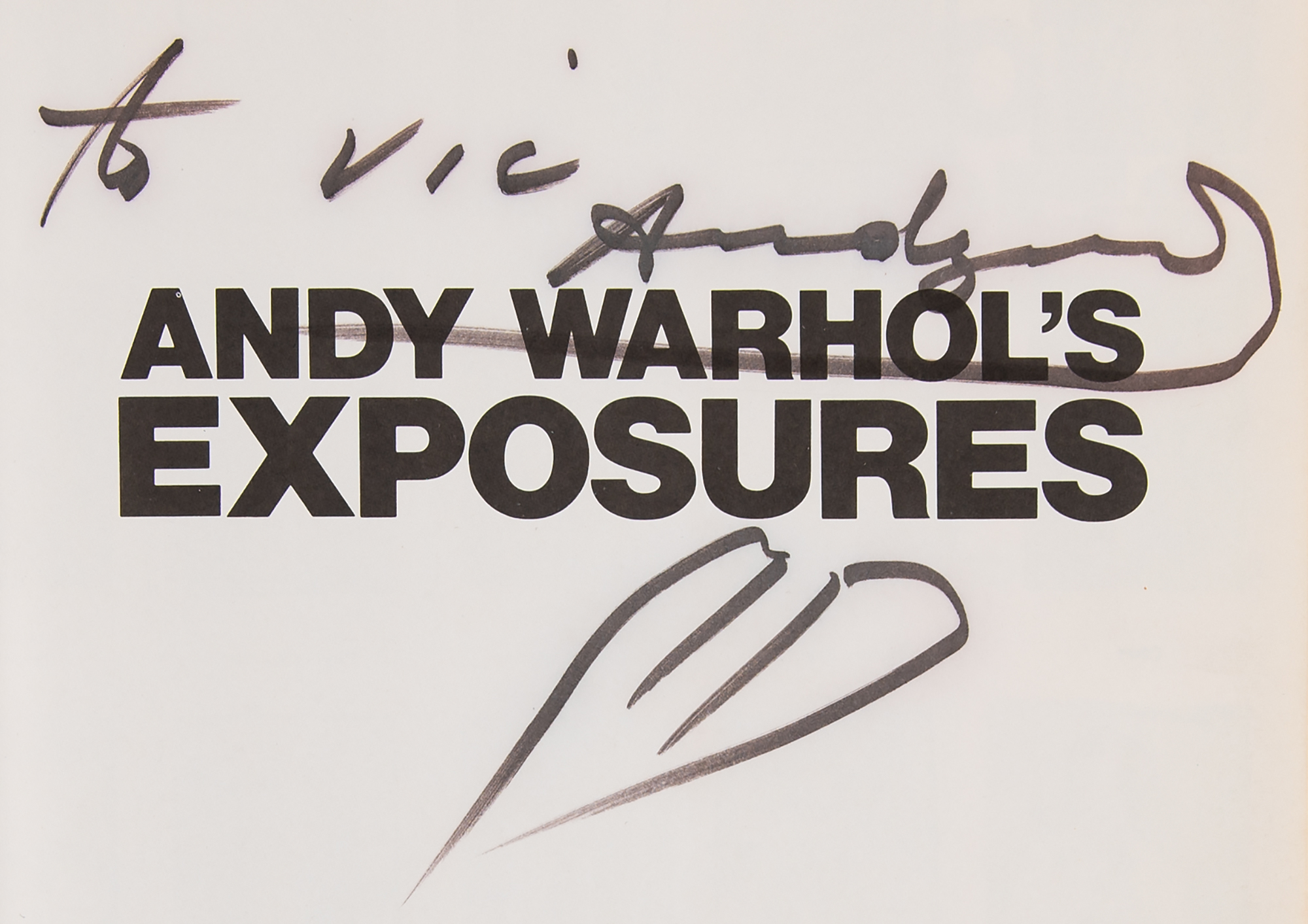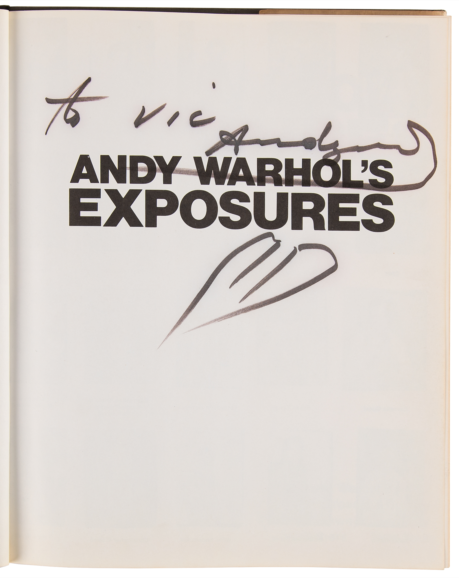 Signed book: Andy Warhol's Exposures. First edition. NY: Andy Warhol Books/Grosset & Dunlap, 1979. Hardcover with dust jacket, 9.5 x 11.5, 255 pages. Signed and inscribed on the half-title page in black felt tip, “To Vic, Andy Warhol," who draws a large sketch of a woman's lips below. In fine condition, with wear to the dust jacket.