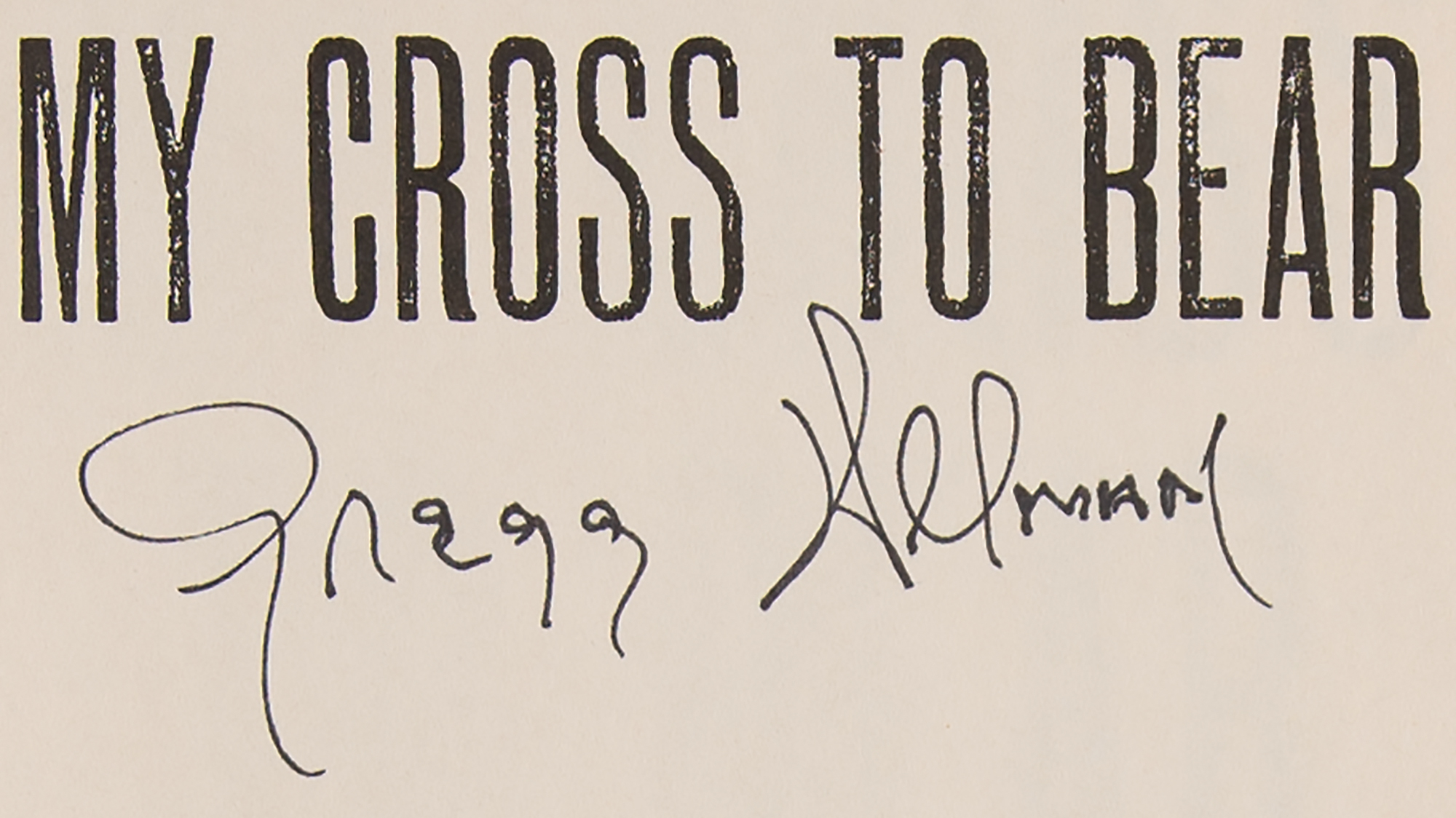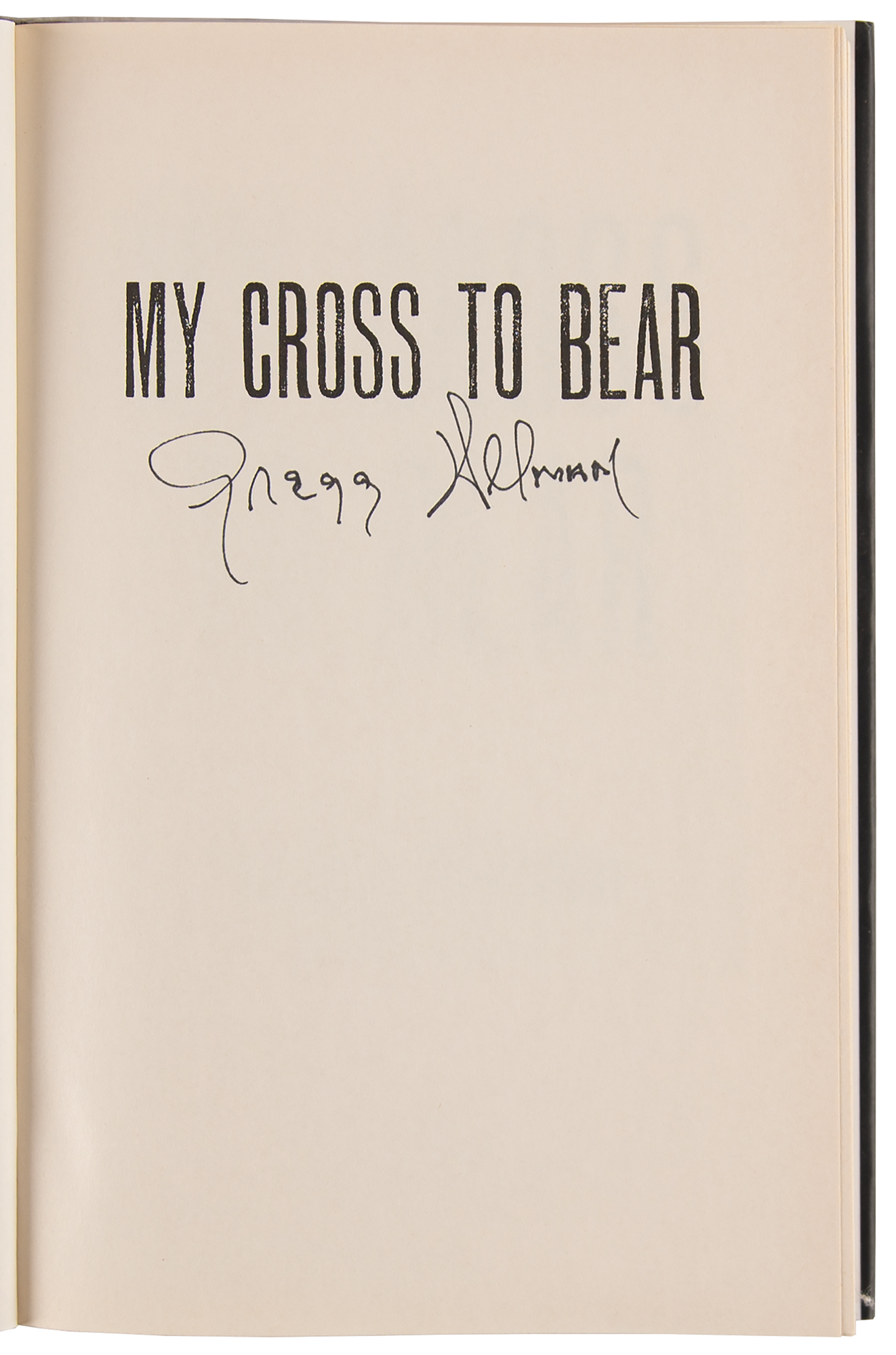Signed book: My Cross to Bear. First edition. NY: William Morrow, 2012. Hardcover with dust jacket, 6.25 x 9.25, 390 pages. Signed on the half-title page in black felt tip by Gregg Allman. In very fine condition.
