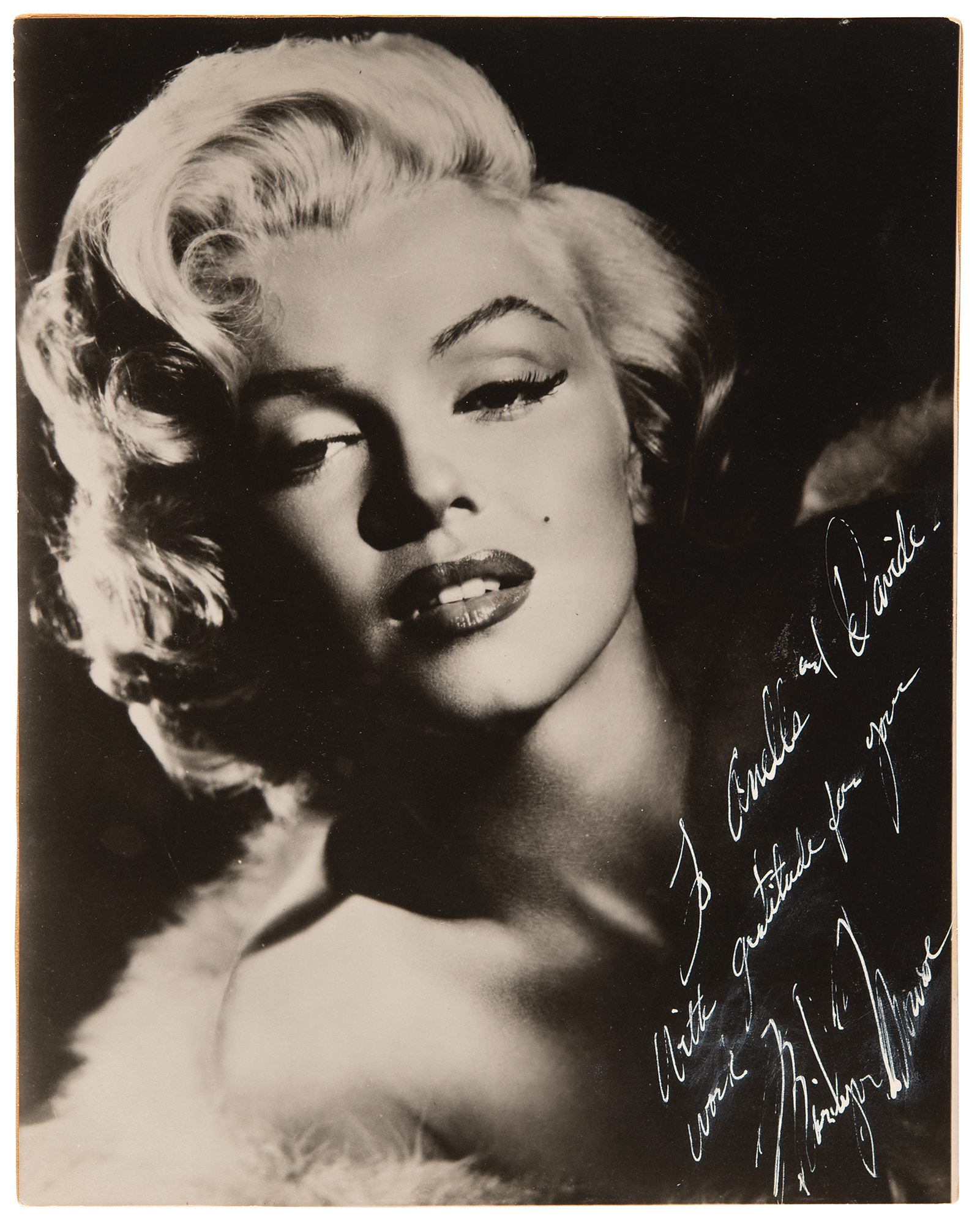 Breathtaking vintage matte-finish 7.5 x 9.25 photo of Monroe by Frank Powolny, nicely signed and inscribed in white ink to the famed London shoemakers, "To Anello and Davide, With gratitude for your work, Marilyn Monroe.” Affixed to a same-size mount and in fine condition, with trimmed edges.
