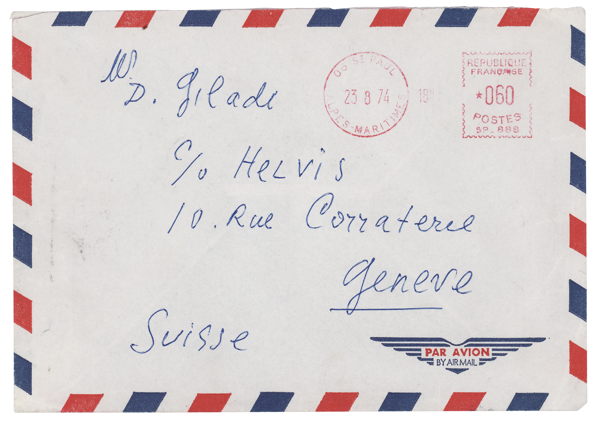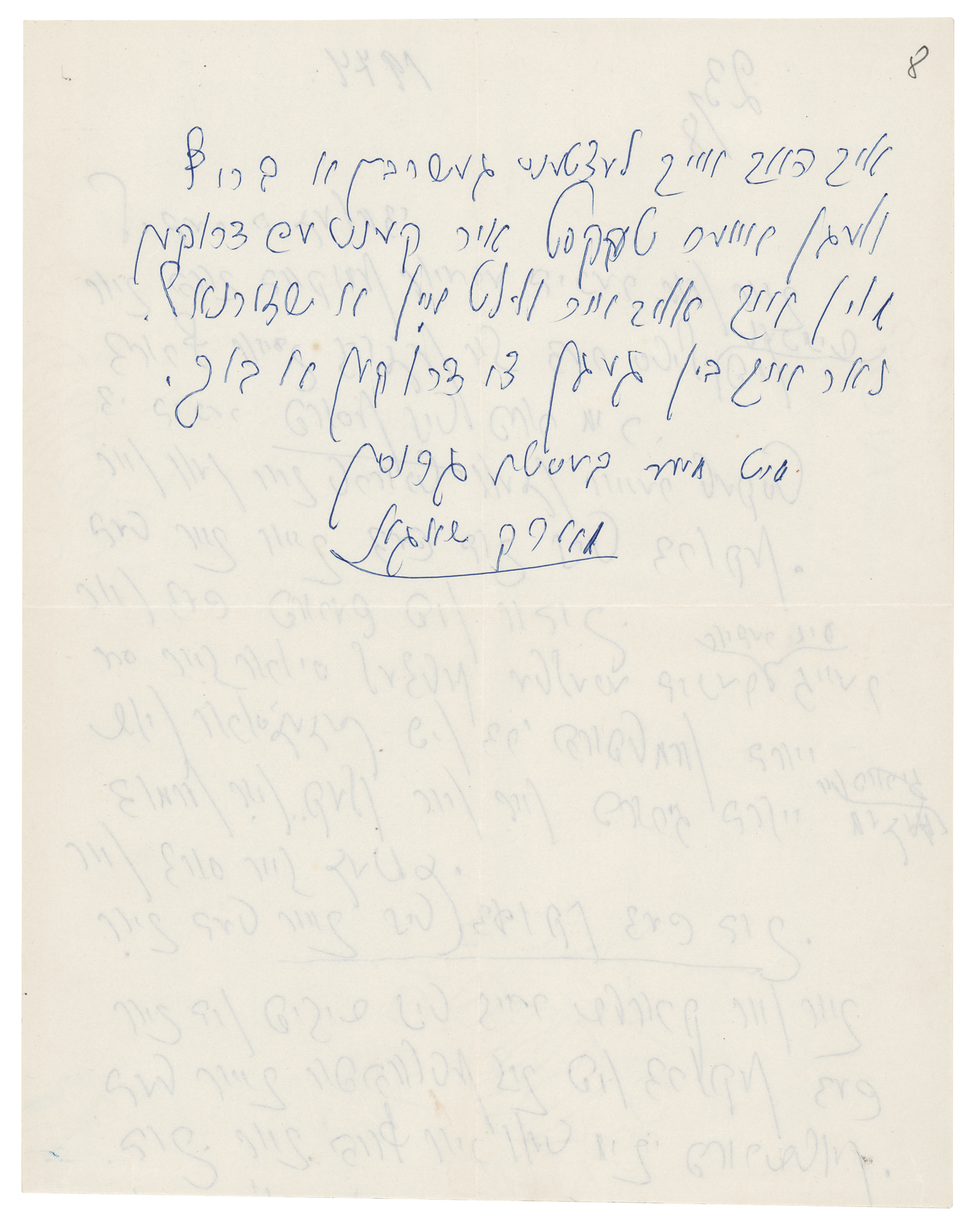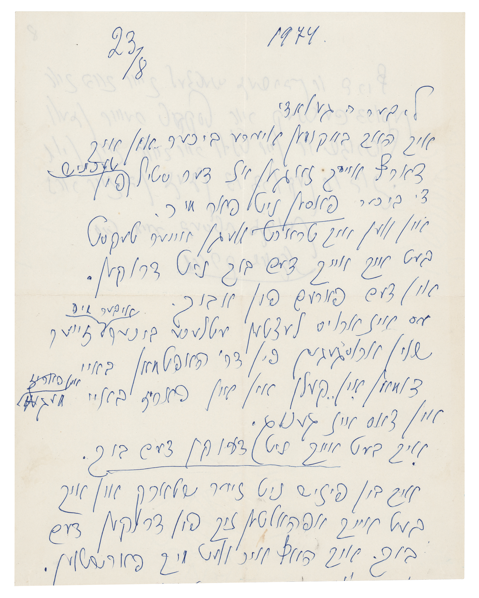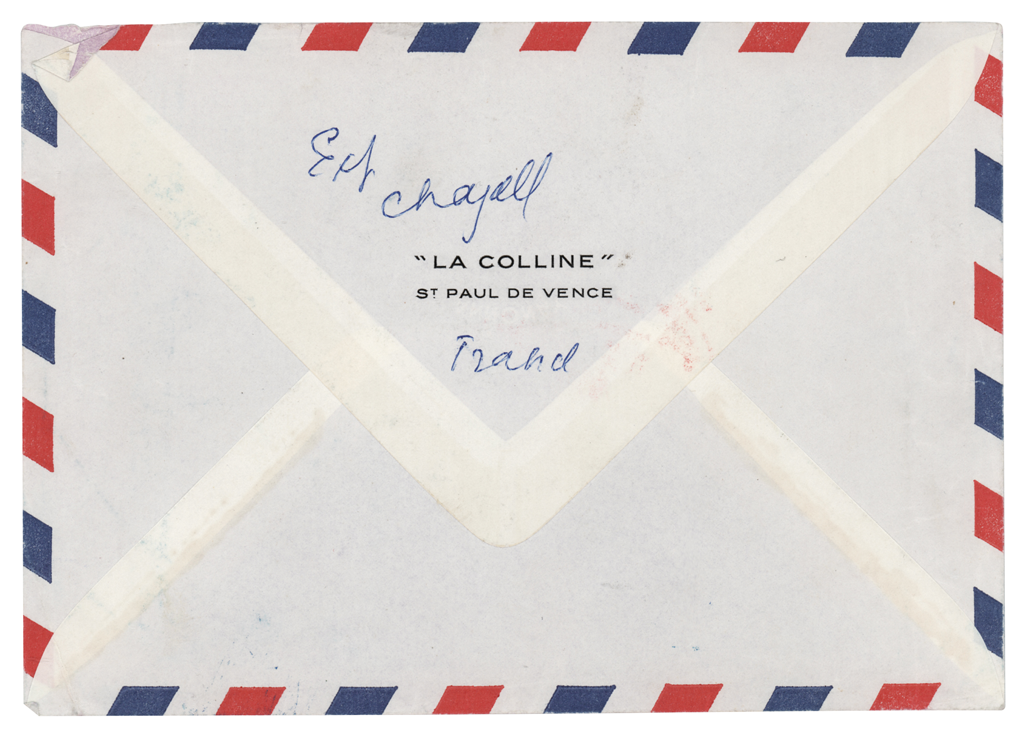 ALS in Yiddish, one page both sides, 8.25 x 10.5, August 23, 1974. Handwritten letter to David Giladi, a Jewish art dealer and a collector of Chagall's work, in full (translated): "I have received your books and I would like to tell you that the subtle hints in them are not to my liking and do not suit me. And when I think about the text, I must ask you not to print them in the form of a book. Several books were published recently by Dr. Hauptman from Köln, and I think that's enough. I will ask you not to print the book. I'm not at my best, and I would ask you to postpone the printing of the book. I hope you understand me. I recently wrote to you about the text. You can print it, if you like, in a Journal, but I object to print it as a book." In fine condition. Accompanied by the original mailing envelope, addressed in Chagall's own hand and adding his surname, "Chagall," in the return address on the flap.