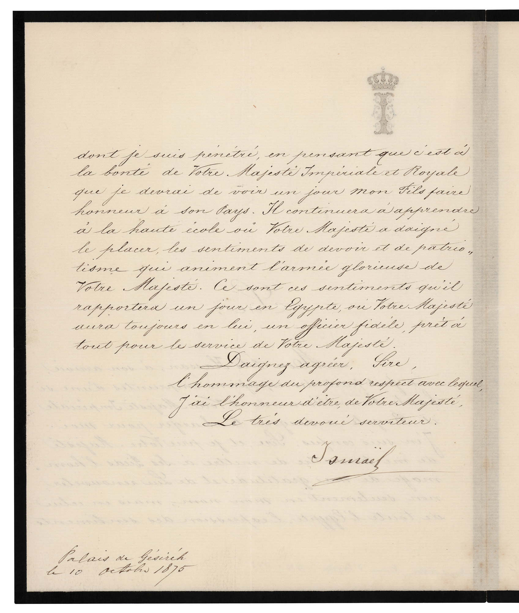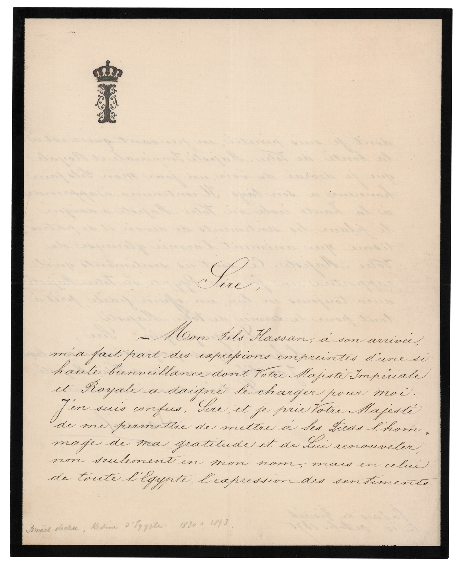 Khedive of Egypt and conqueror of Sudan from 1863 to 1879, remembered for the modernization of Egypt through investments in industrial and economic development, urbanization, and the expansion of the country's boundaries in Africa; in spite of overseeing the construction of the Suez Canal, severe debt resulting from his policies led to its sale to the British government. LS in French, signed “Ismail,” one page both sides, 8 x 10, black-bordered personal letterhead, October 10, 1875. Untranslated letter to "Your Imperial Majesty," sending thanks for having ensured the education of his son Hassan and promising that he will have in him, when he returns to Egypt, a faithful officer, ready to do anything for his service. In fine condition.