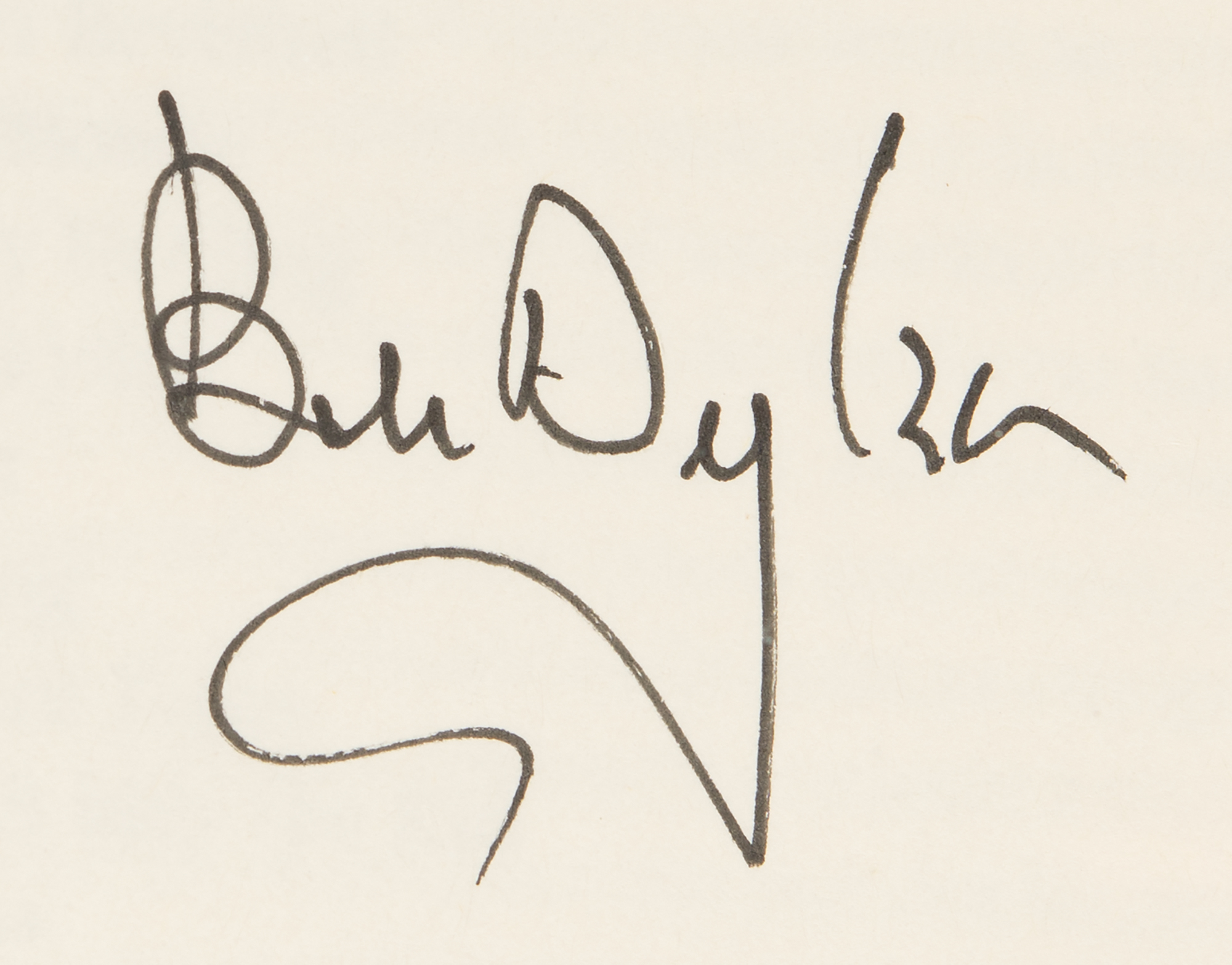 Signed Spanish-language book: Bob Dylan: Letras Completas, 1962–2012. First edition. Barcelona, Spain: Malpaso, 2016. Hardcover, 7 x 9.5, 1297 pages. Signed on the half-title page in black felt tip by Bob Dylan. Includes its original bookmark and belly band that reads (translated): “Nobel Prize For Literature 2016, Complete lyrical works, 1962-2016 / All songs in bilingual edition / Expanded and revised edition by Bob Dylan.” In fine condition, with bumped corners.