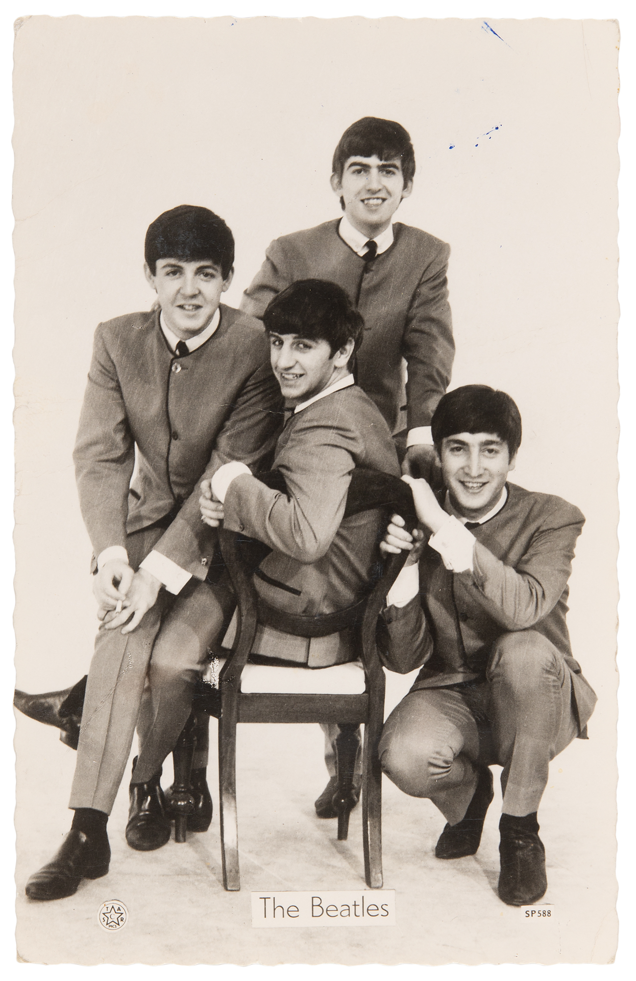 Vintage glossy 3.5 x 5.5 Star Pics merchandising photo of the Beatles wearing their famous gray collarless suits during a Dezo Hoffmann photo shoot at his Wardour Street studio in London, England, in April 1963, signed on the reverse in ballpoint by Paul McCartney, and in pencil by John Lennon. In very good to fine condition, with light creasing to the image side. The consignor notes that the autographs were obtained at the Lewisham Police Station in Lewisham, London, on December 8, 1963, when the Beatles were at the station before and after their show at the Odeon Theatre in Lewisham on the same evening.