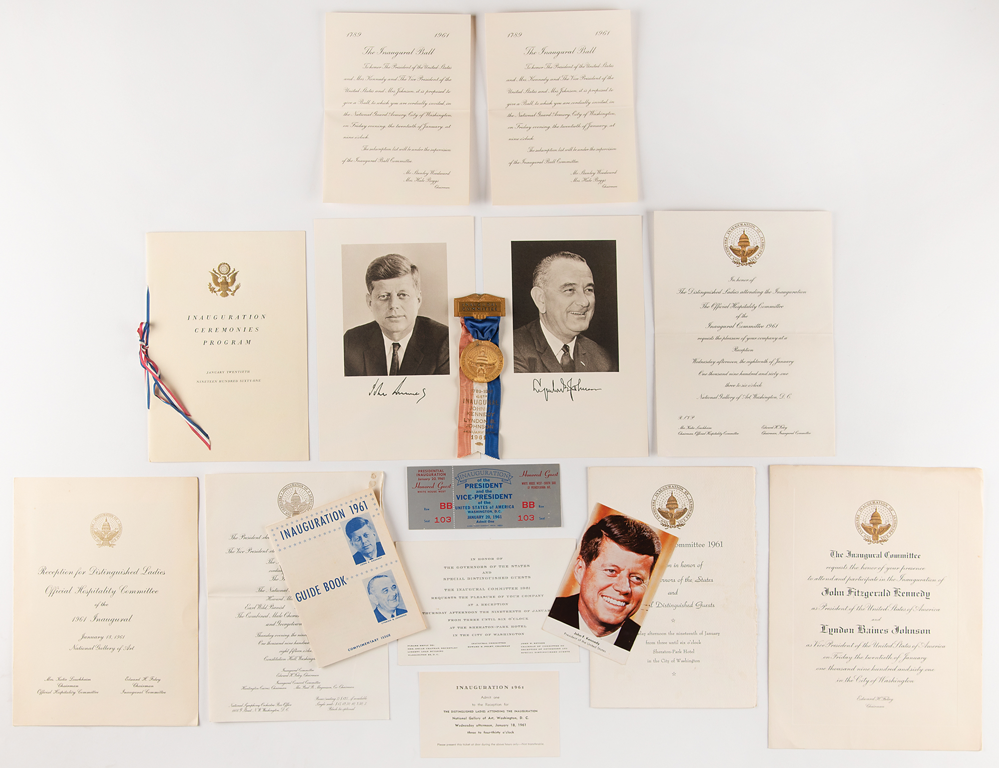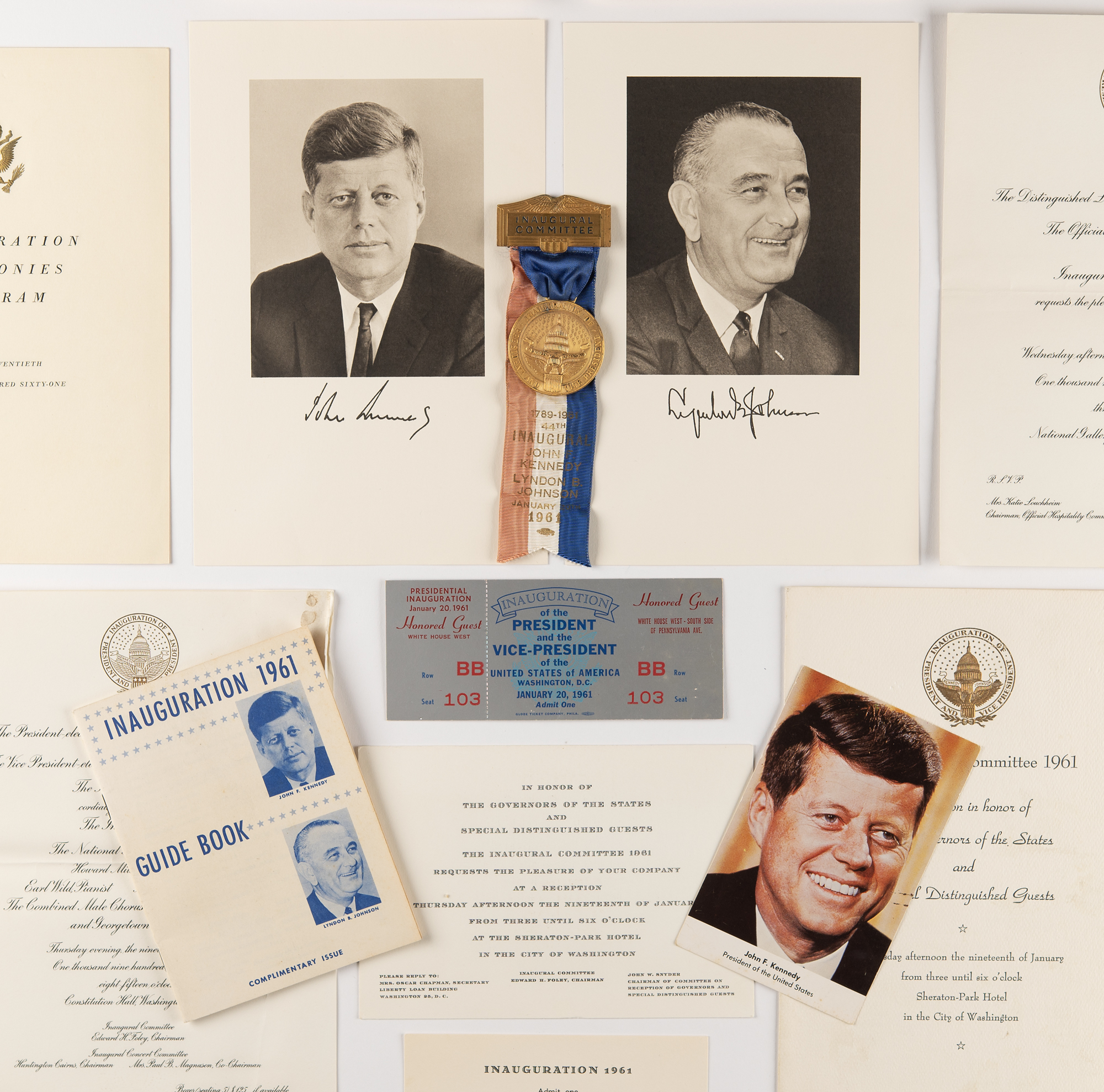 Collection of over 30 items related to the presidencies and families of John F. Kennedy and Lyndon B. Johnson, which includes various inauguration ephemera, invitations, memorial cards, programs, photographs, and more. The collection is highlighted by items from the 1961 inauguration of President Kennedy and Vice President Johnson, which includes: an unused “Honored Guest” ticket to the 1961 presidential inauguration, issued as Row BB and Seat 103; an “Inaugural Committee” badge with patriotic ribbon and central medallion, with the ribbon bearing text: “1789-1961, 44th Inaugural, John F. Kennedy, Lyndon B. Johnson, January 20th, 1961; an “Inauguration Ceremonies” Program; a 1961 inauguration invitation containing portraits of Kennedy and Johnson, both bearing facsimile signatures; an invitation to the 1961 inauguration from the Inaugural Committee; an “Inauguration 1961” guidebook; two invitations to “The Inaugural Ball,” held at the National Guard Armory (January 20th); an invitation to “The Inaugural Concert” at Constitution Hall (January 19th); invitations for receptions held in honor of “The Distinguished Ladies attending the Inauguration” and “The Governors of the States and Special Distinguished Guests,” both of which include their original program, with the “Distinguished Ladies” program containing facsimile signatures of Jackie Kennedy and Lady Bird Johnson, and accompanied by an original admission ticket to the reception. The collection also contains sundry programs and invitations for the 1965 inauguration of President Johnson; a color postcard of JFK; a black-bordered ‘thank you’ card from Jackie Kennedy; a “Special Delivery from Heaven” pamphlet in honor of the late JFK; and various ephemera related to the life of Robert F. Kennedy. In overall fine condition.