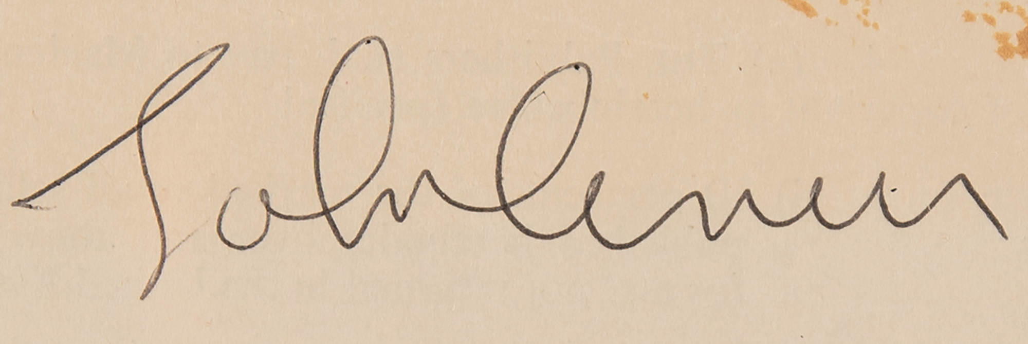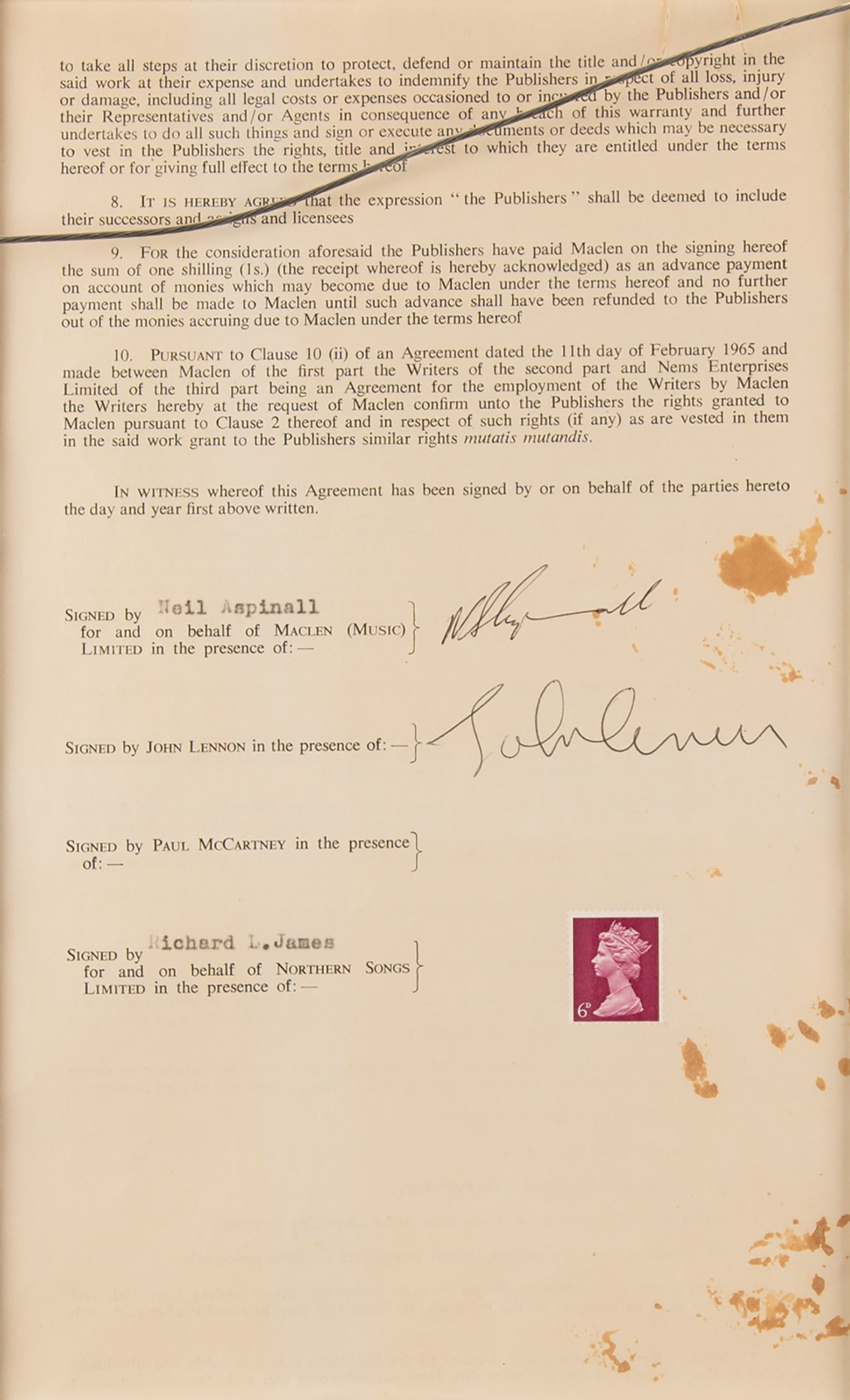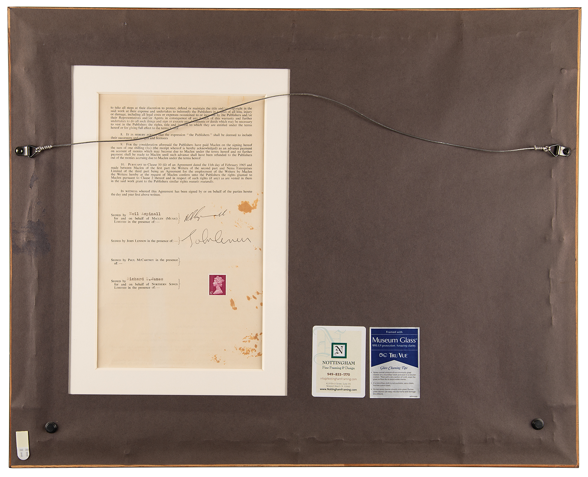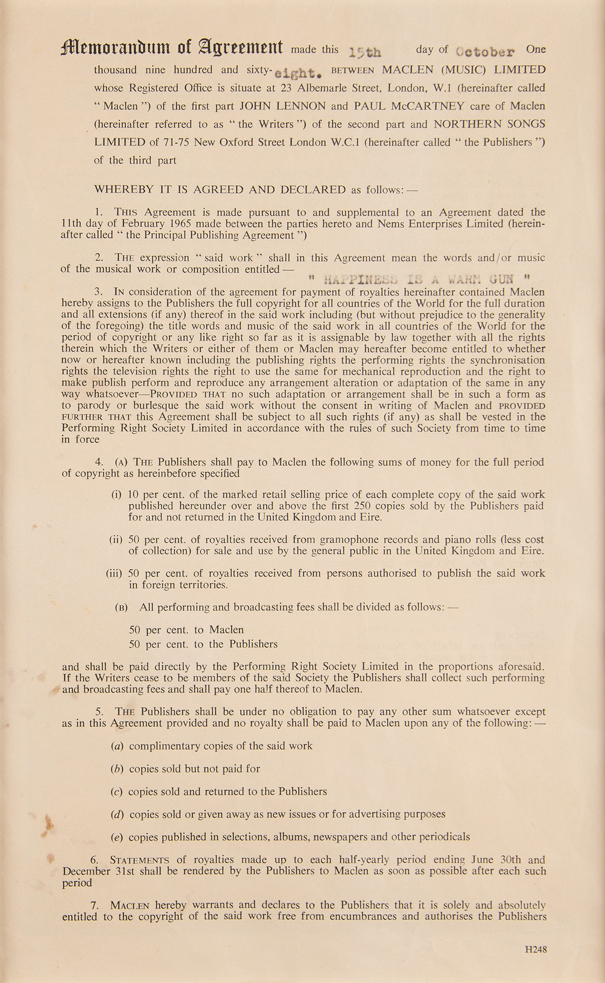Desirable DS, one page both sides, 7.5 x 12.5, October 15, 1968. Memorandum of agreement between Northern Songs Limited and Maclen (Music) Limited, John Lennon, and Paul McCartney, in which the former party will be assigned "the full copyright for all countries of the World for the duration and all extensions" of the "musical work or composition entitled — 'Happiness Is A Warm Gun.'" Signed at the conclusion in black ballpoint by Lennon, and countersigned in black ballpoint by Maclen representative Neil Aspinall. Archivally matted and framed with a full letter of authenticity from PSA/DNA to an overall size of 24 x 19.25; window to frame back reveals the signed page of the document. In fine condition, with a few spots of staining and some tears to top edge.