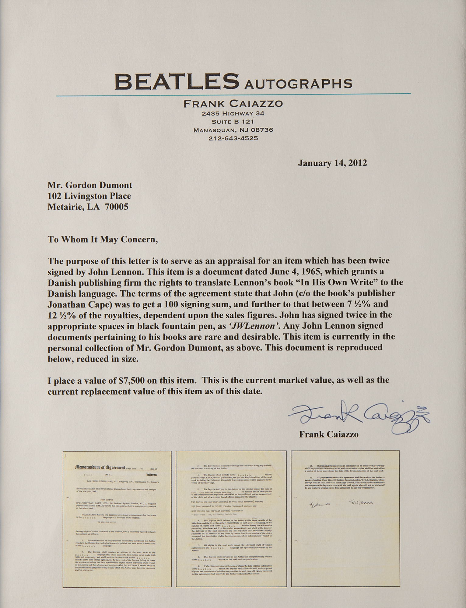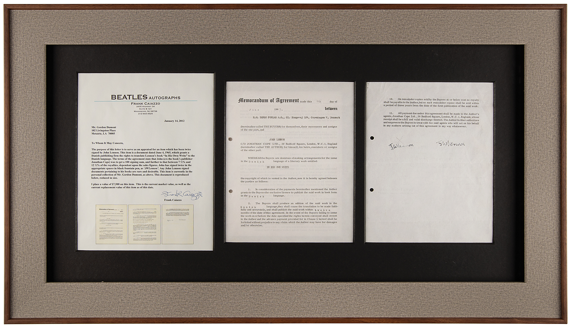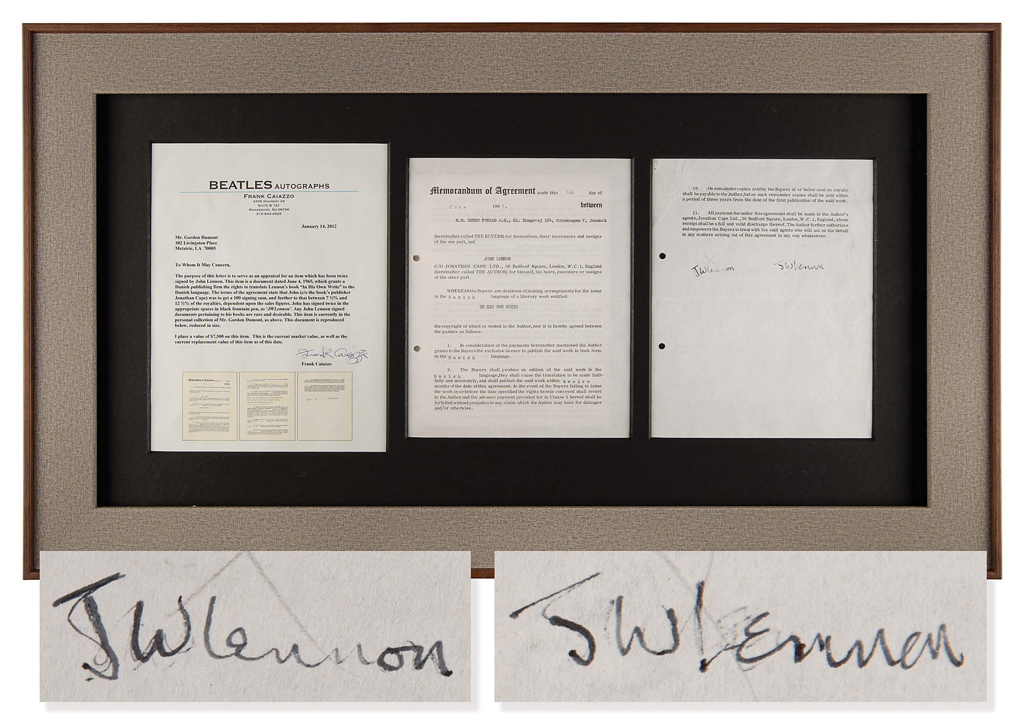 Scarce partly-printed DS, signed twice “J. W. Lennon,” three pages on two sheets, 7.75 x 9.75, June 4, 1965. A memorandum of agreement between John Lennon and the Danish publishing firm H. M. Bergs Forlag A. S., in which Lennon grants the latter party the exclusive license to publish 'In His Own Write' in the Danish language. Signed twice on the last page in black ink by Lennon. Matted and framed with a letter of authenticity from noted Beatles expert Frank Caiazzo to an overall size of 34 x 19. In very good to fine condition, with a corner crease and staple holes, and both signatures showing just a hint of pen trouble. First published in London in 1964, Lennon's first literary effort was a thin volume comprised of nonsensical, disjointed short stories and line drawings. The first solo effort of any of the Beatles, In His Own Write remains a great showcase of Lennon's creative talent.