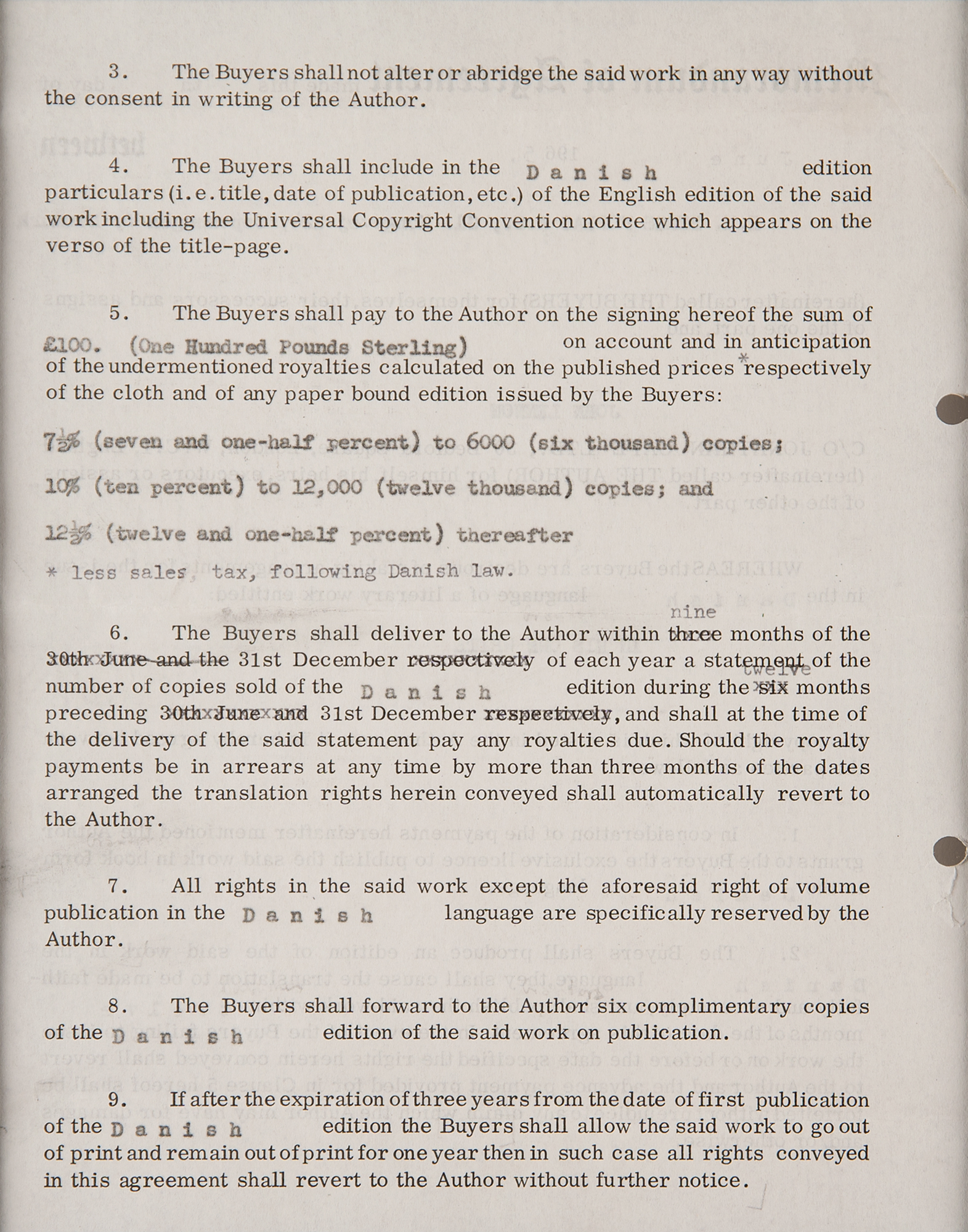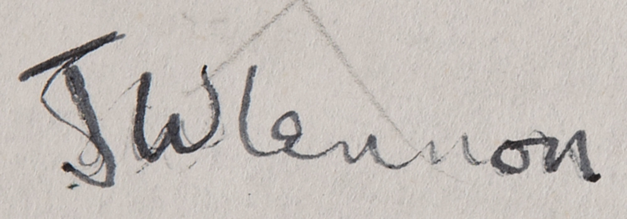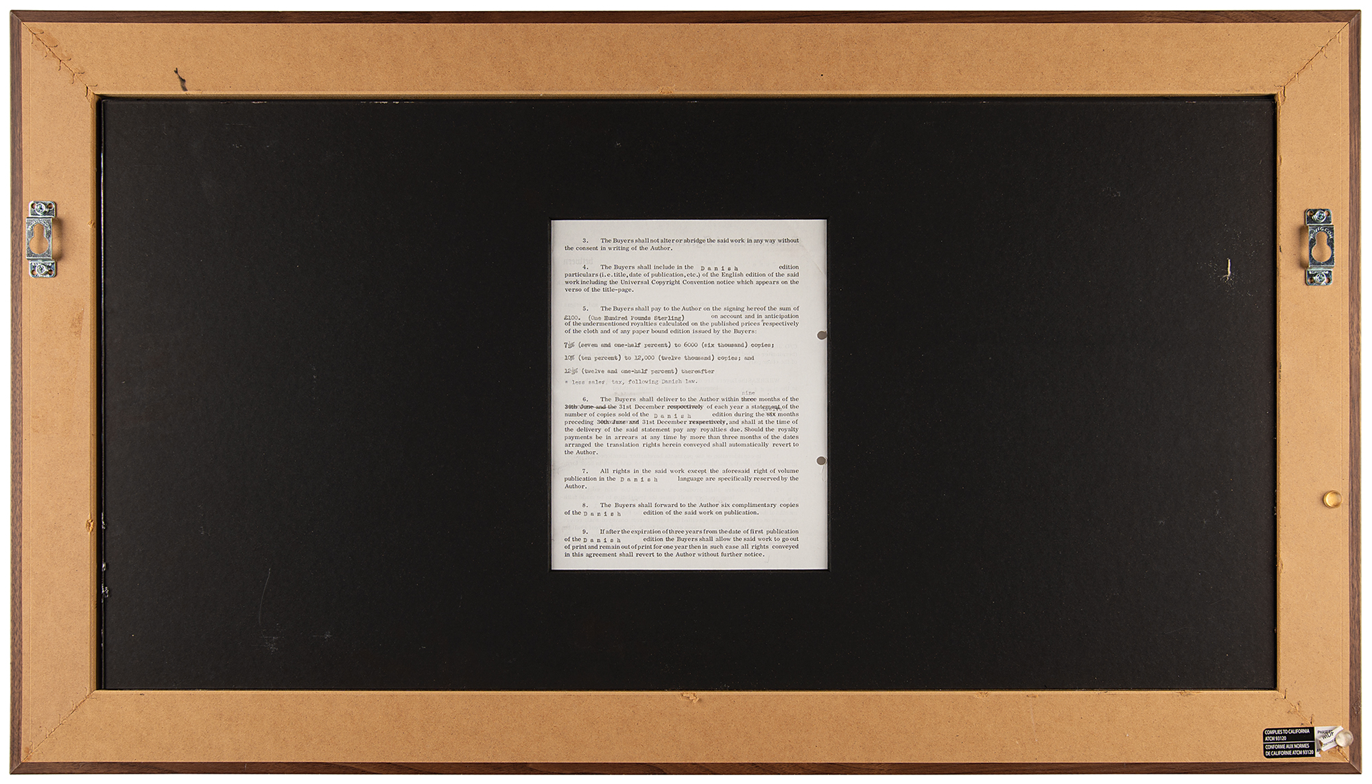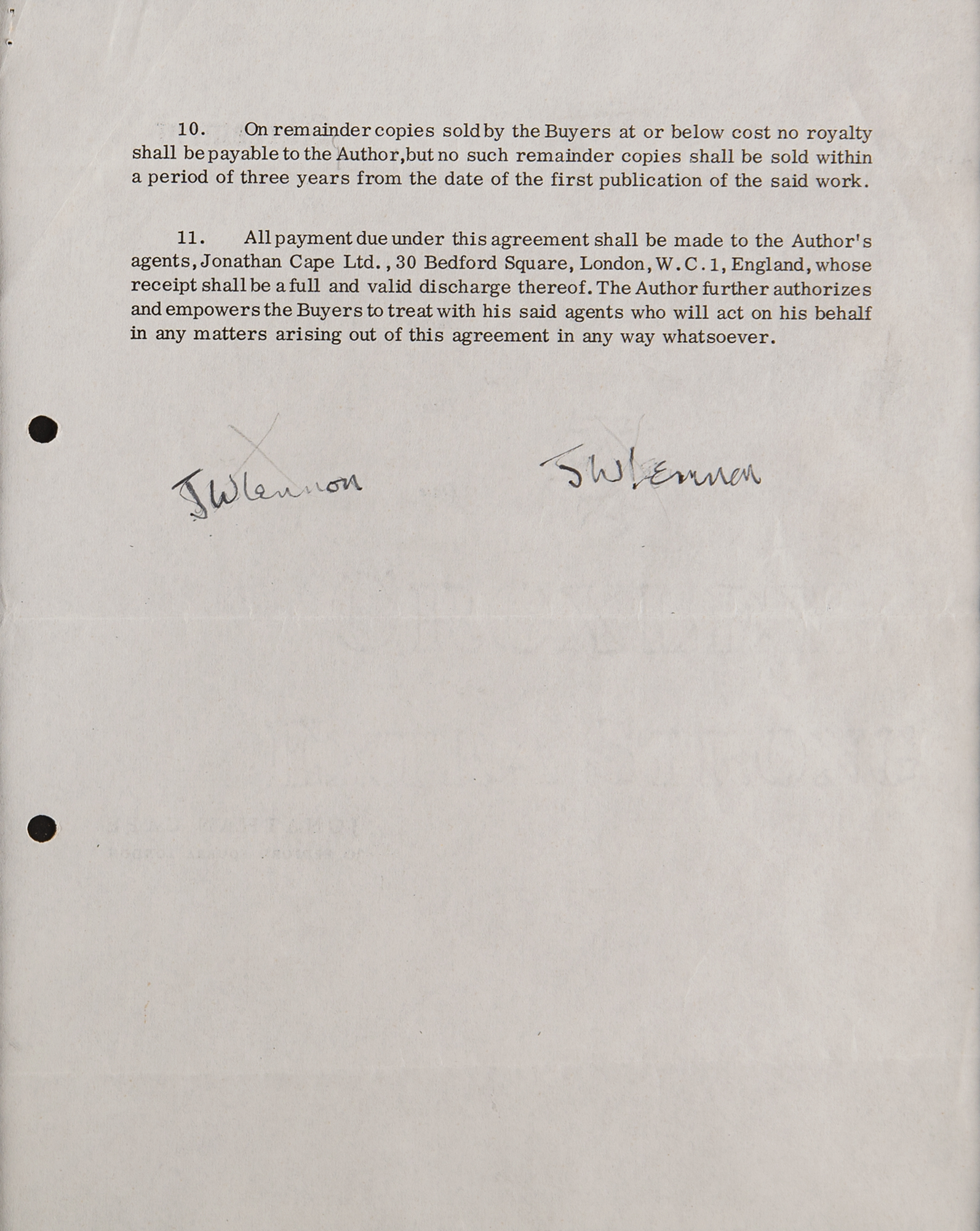 Scarce partly-printed DS, signed twice “J. W. Lennon,” three pages on two sheets, 7.75 x 9.75, June 4, 1965. A memorandum of agreement between John Lennon and the Danish publishing firm H. M. Bergs Forlag A. S., in which Lennon grants the latter party the exclusive license to publish 'In His Own Write' in the Danish language. Signed twice on the last page in black ink by Lennon. Matted and framed with a letter of authenticity from noted Beatles expert Frank Caiazzo to an overall size of 34 x 19. In very good to fine condition, with a corner crease and staple holes, and both signatures showing just a hint of pen trouble. First published in London in 1964, Lennon's first literary effort was a thin volume comprised of nonsensical, disjointed short stories and line drawings. The first solo effort of any of the Beatles, In His Own Write remains a great showcase of Lennon's creative talent.