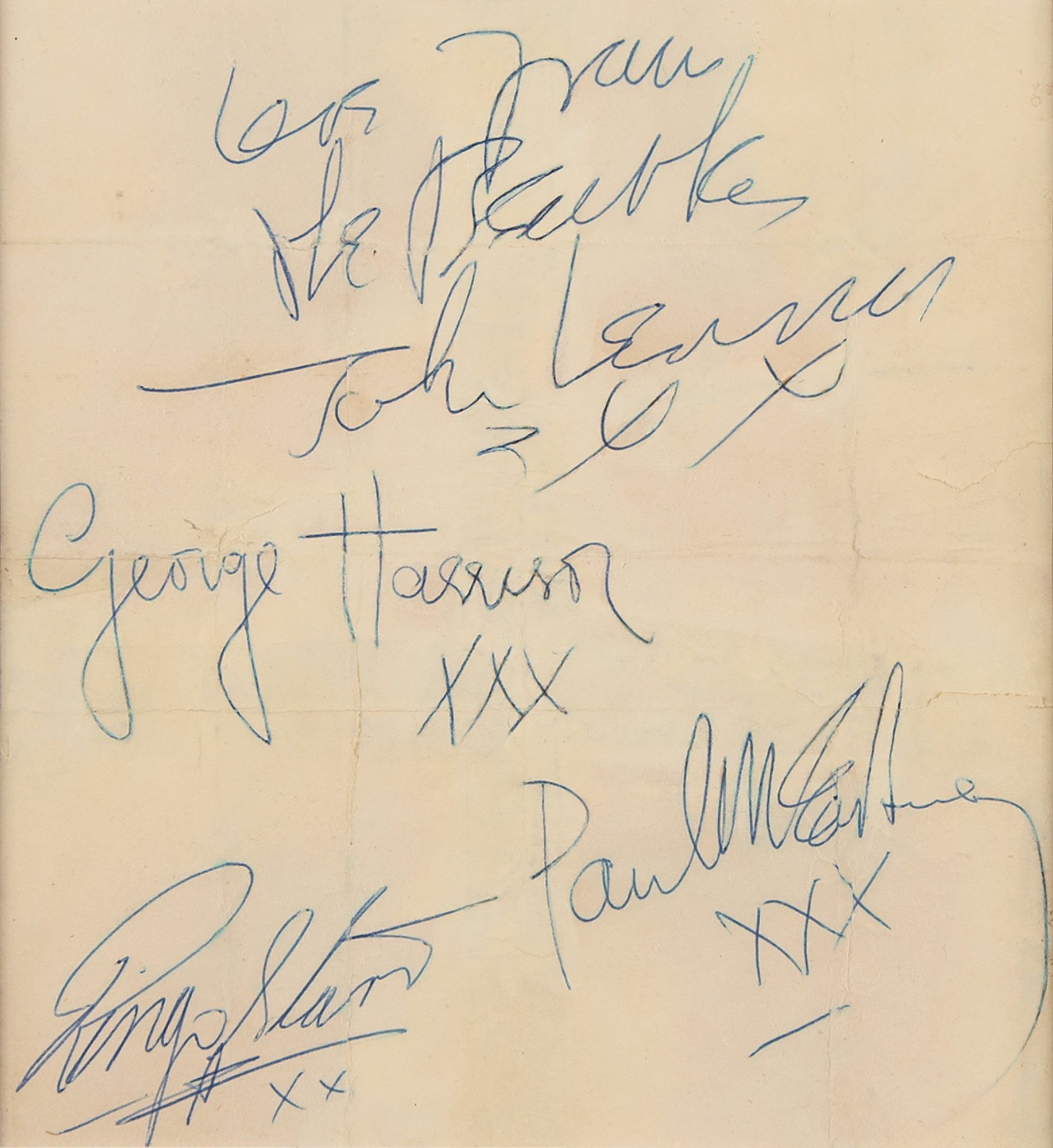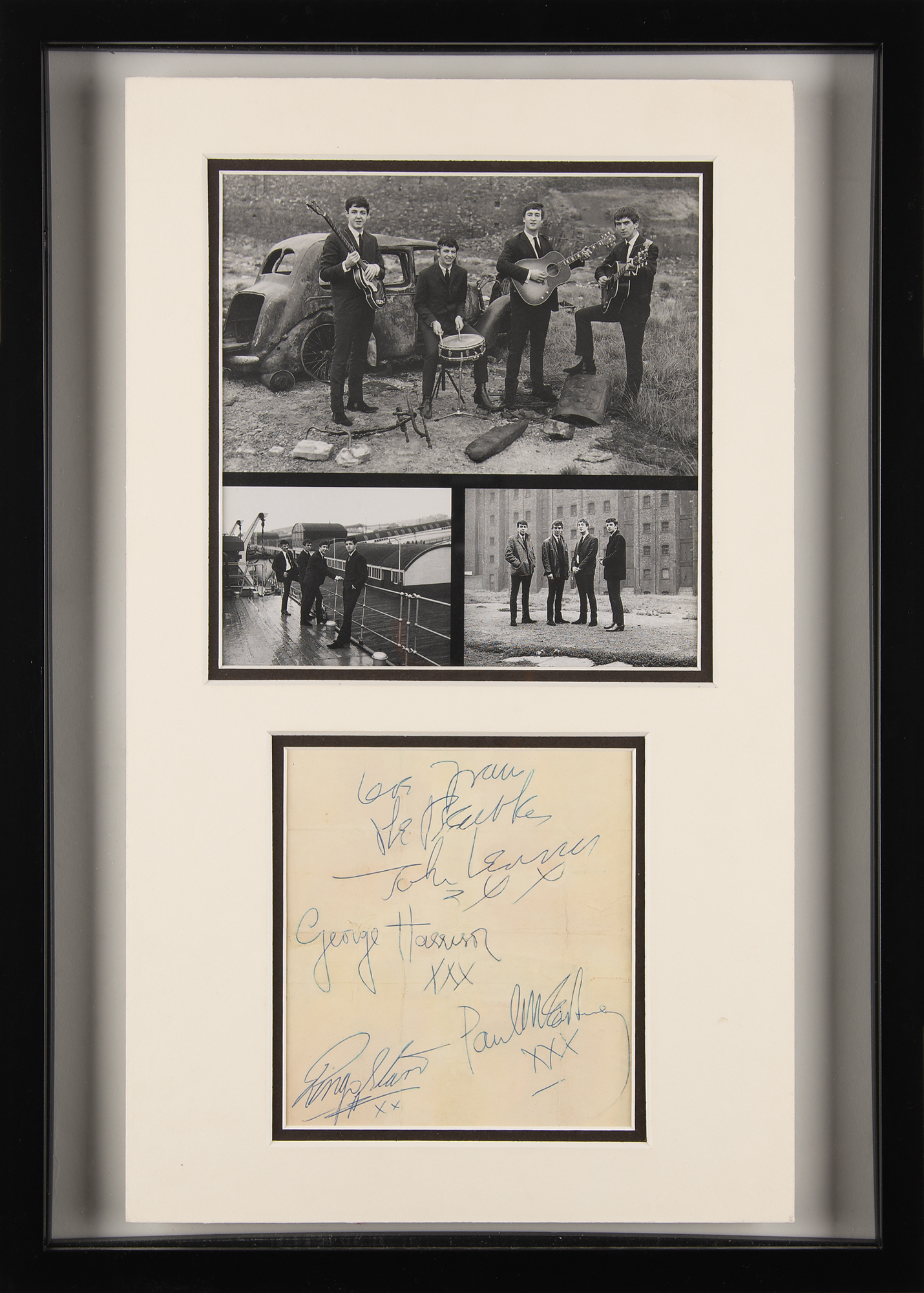 Beautiful vintage circa mid-1963 ballpoint signatures, "Love from the Beatles, John Lennon xxx," "George Harrison xxx," "Ringo Starr xxx," and "Paul McCartney xxx," on an off-white 5.5 x 6 sheet, which is affixed to a heavier cardstock sheet. Double-matted and framed with a composite photo of the band to an overall size of 15 x 21. In very good condition, with overall creasing and multiple intersecting folds. Accompanied by a letter of authenticity from noted Beatles expert Frank Caiazzo, which dates the signatures to mid-1963. A visually striking, uninscribed set of large, bold Beatles signatures obtained as the band's commercial success would soon bring them worldwide exposure.