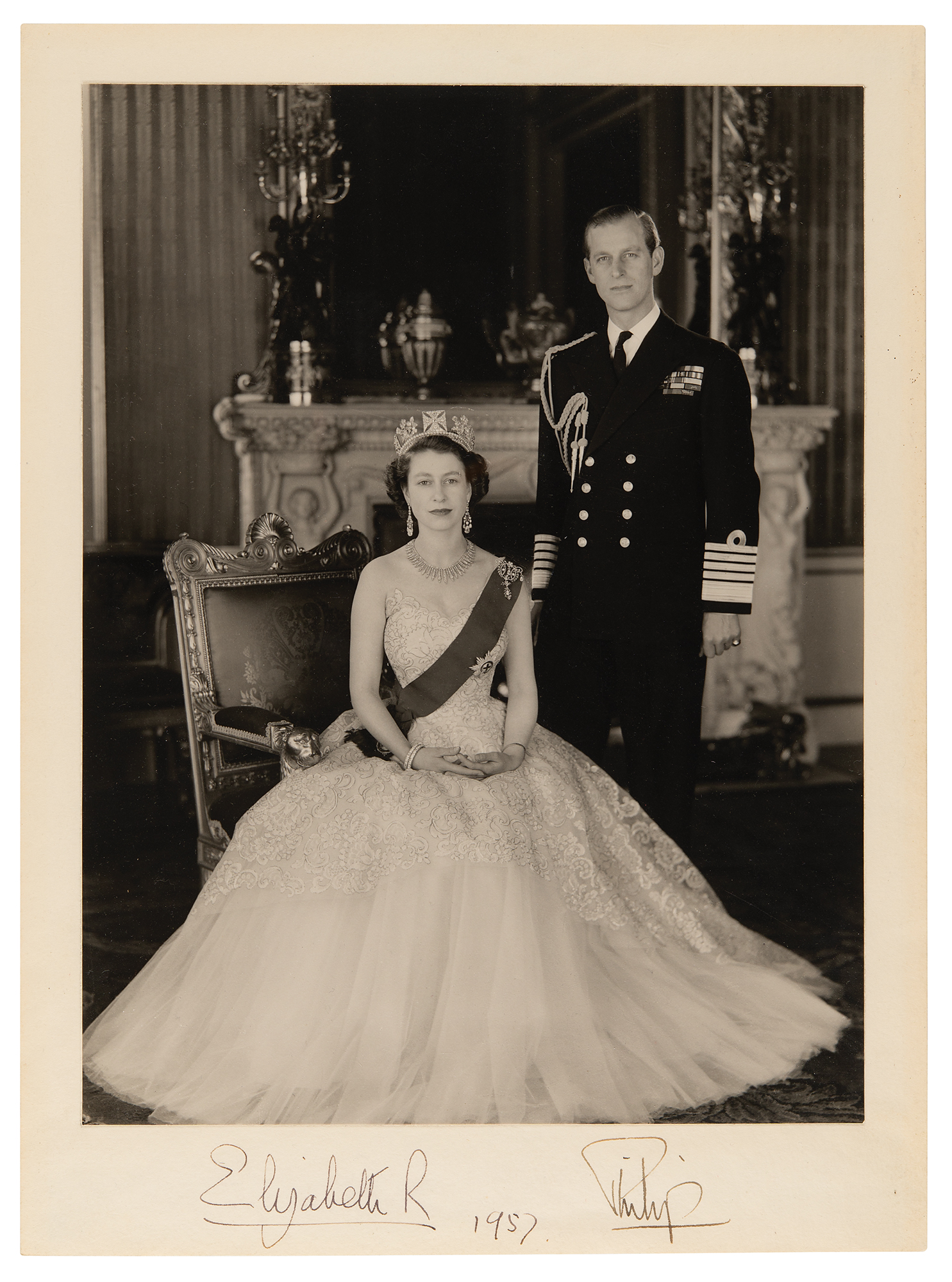 Attractive vintage matte-finish 7.25 x 9.5 portrait of Queen Elizabeth II and Prince Philip posing together, bedecked in their royal attire, affixed to its original 8.5 x 11.5 mount, signed on the mount in fountain pen, "Elizabeth R., 1957" and "Philip." In fine condition. A fabulous, regal portrait of the royal couple.