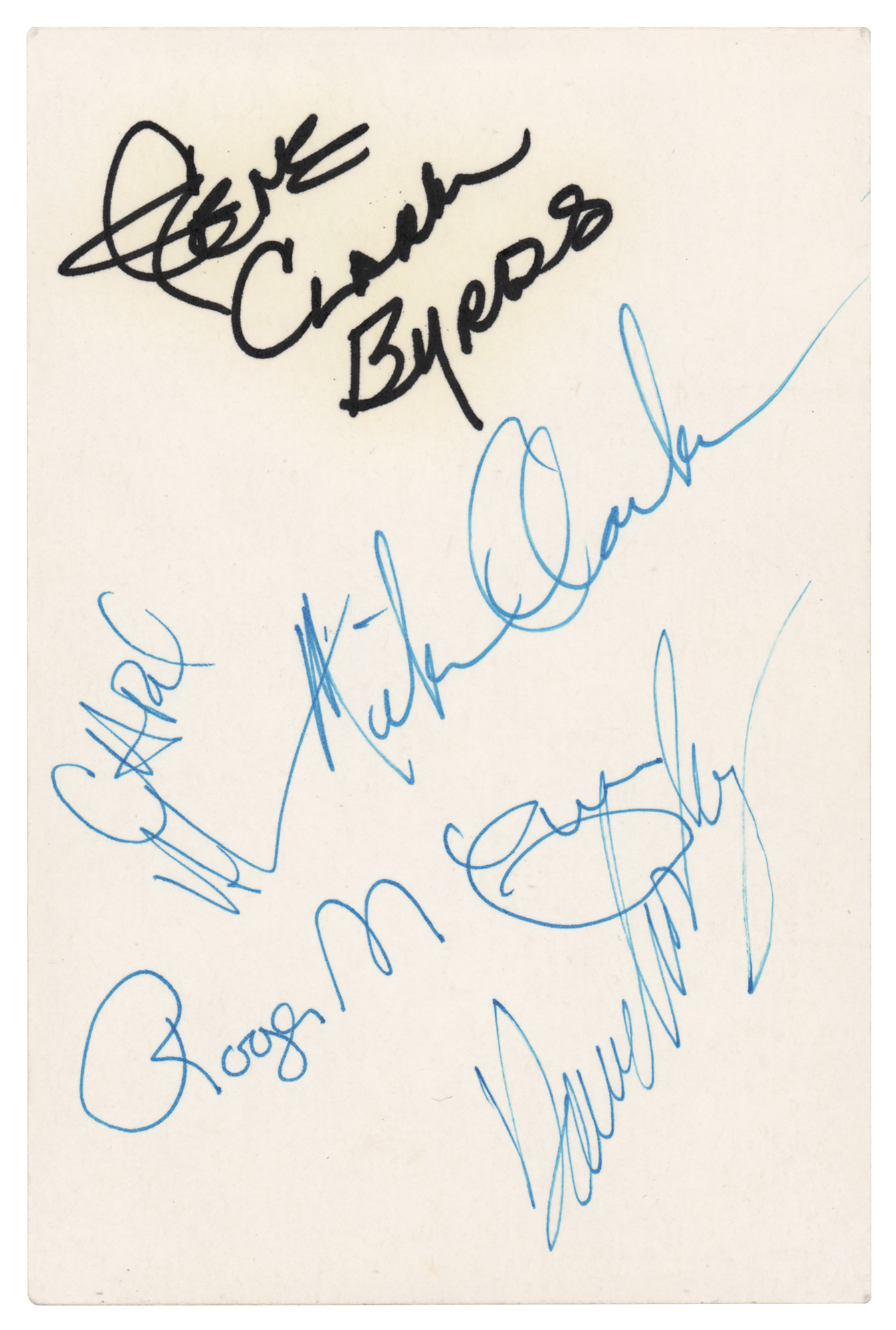 Felt tip signatures of The Byrds—Roger McGuinn, David Crosby, Gene Clark, Michael Clarke, and Chris Hillman—on a white 4 x 6 card. In fine condition, with light yellow haloing to Clark's signature.