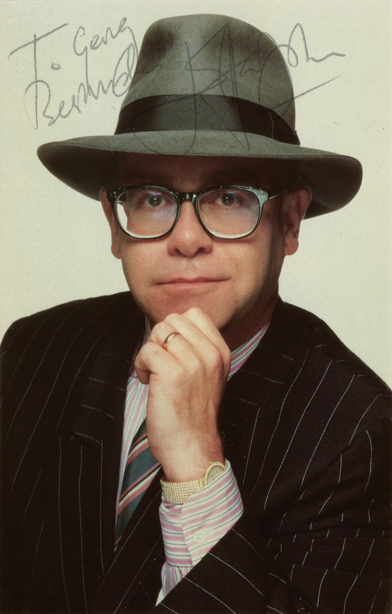 Color 3.5 x 5.5 cardstock photo of Elton John in a fedora and pinstriped suit, signed and inscribed in black ballpoint, "To Georg, Best wishes, Elton John.” In very fine condition.
