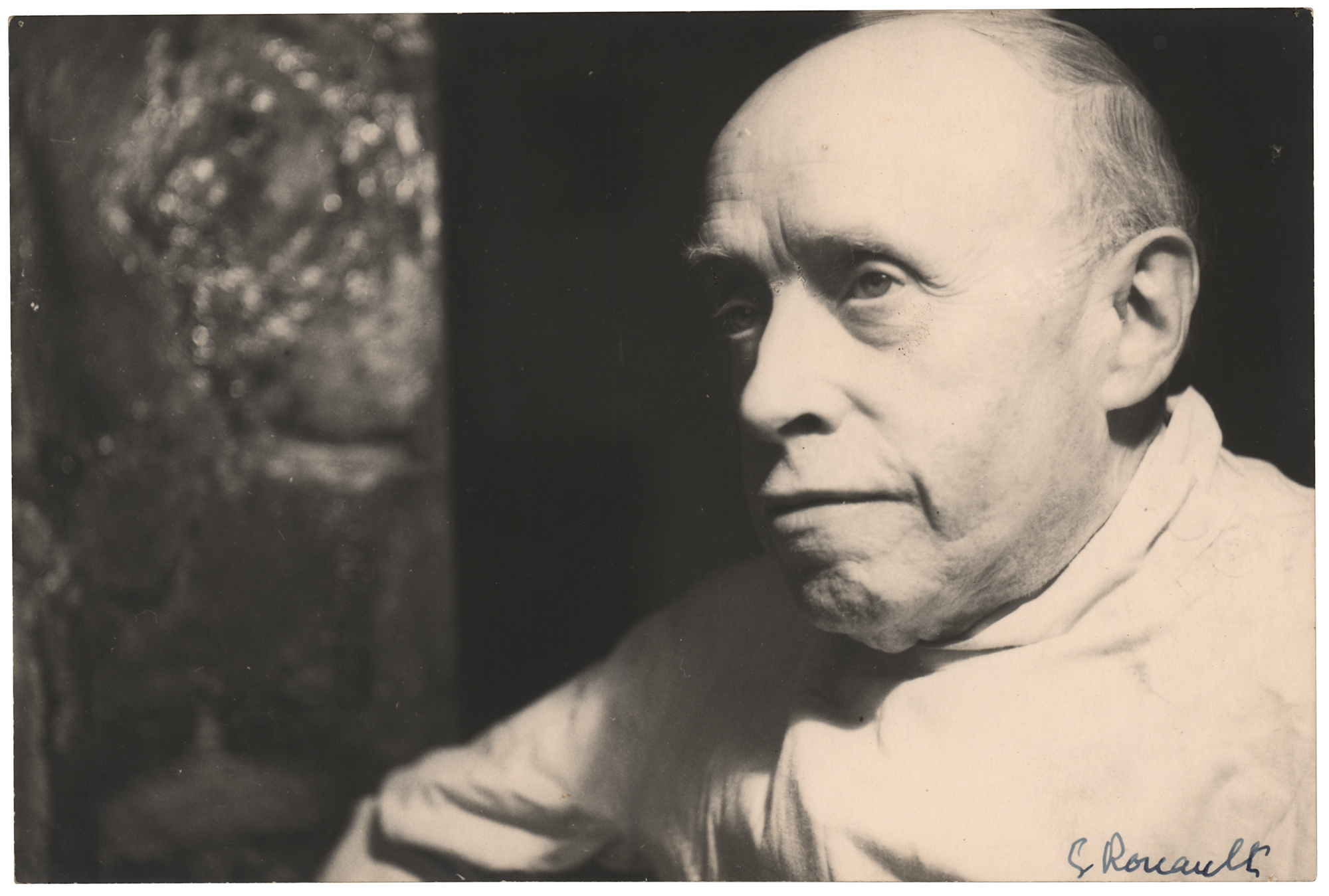 French Fauvist and Expressionist painter, and printmaker in lithography and etching (1871–1958). Uncommon vintage matte-finish 7 x 4.5 photo of the acclaimed French artist, signed in fountain pen, "G. Rouault." Reverse bears the credit stamp of French photographer Yvonne Chevalier. In fine condition.