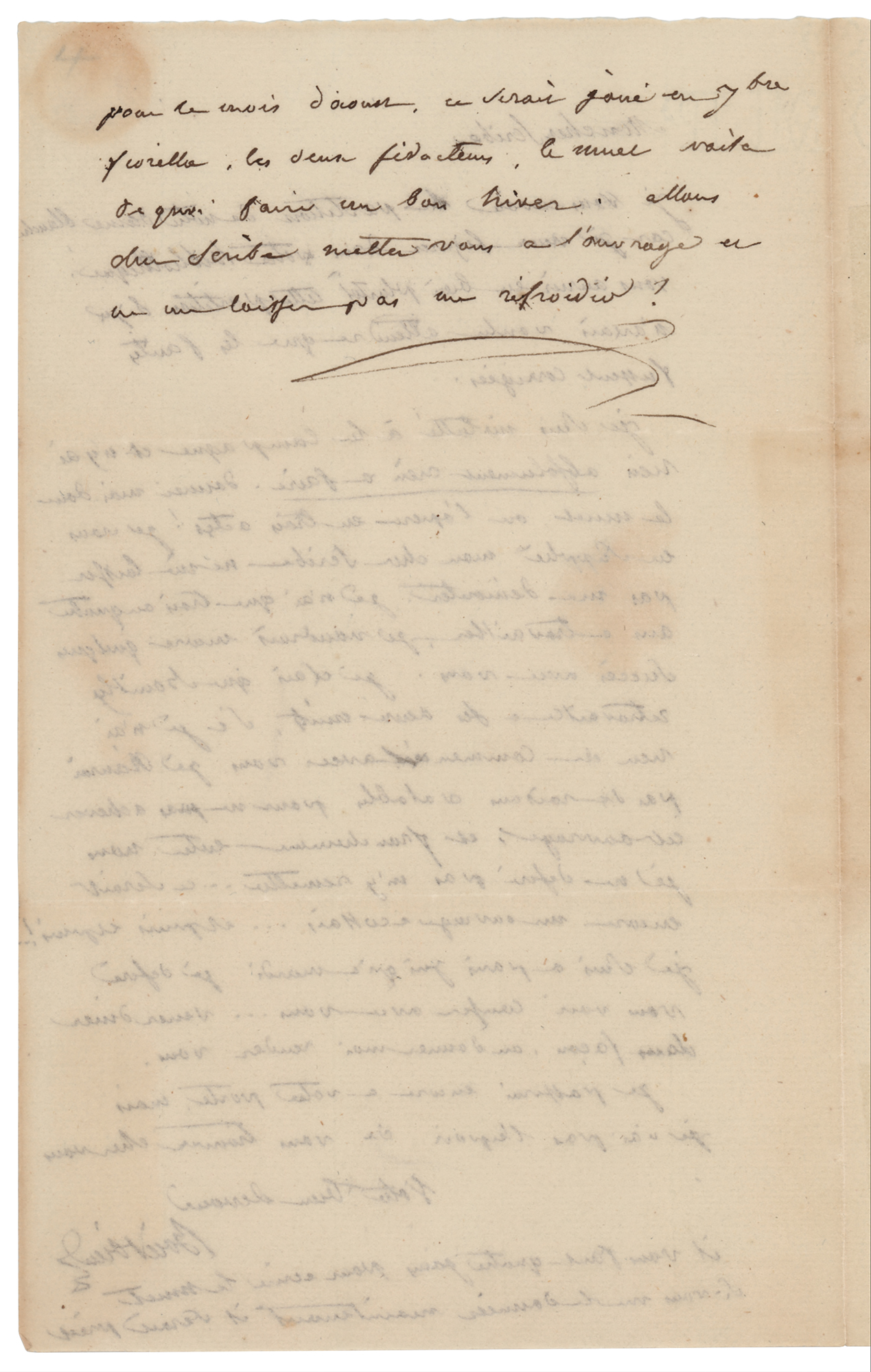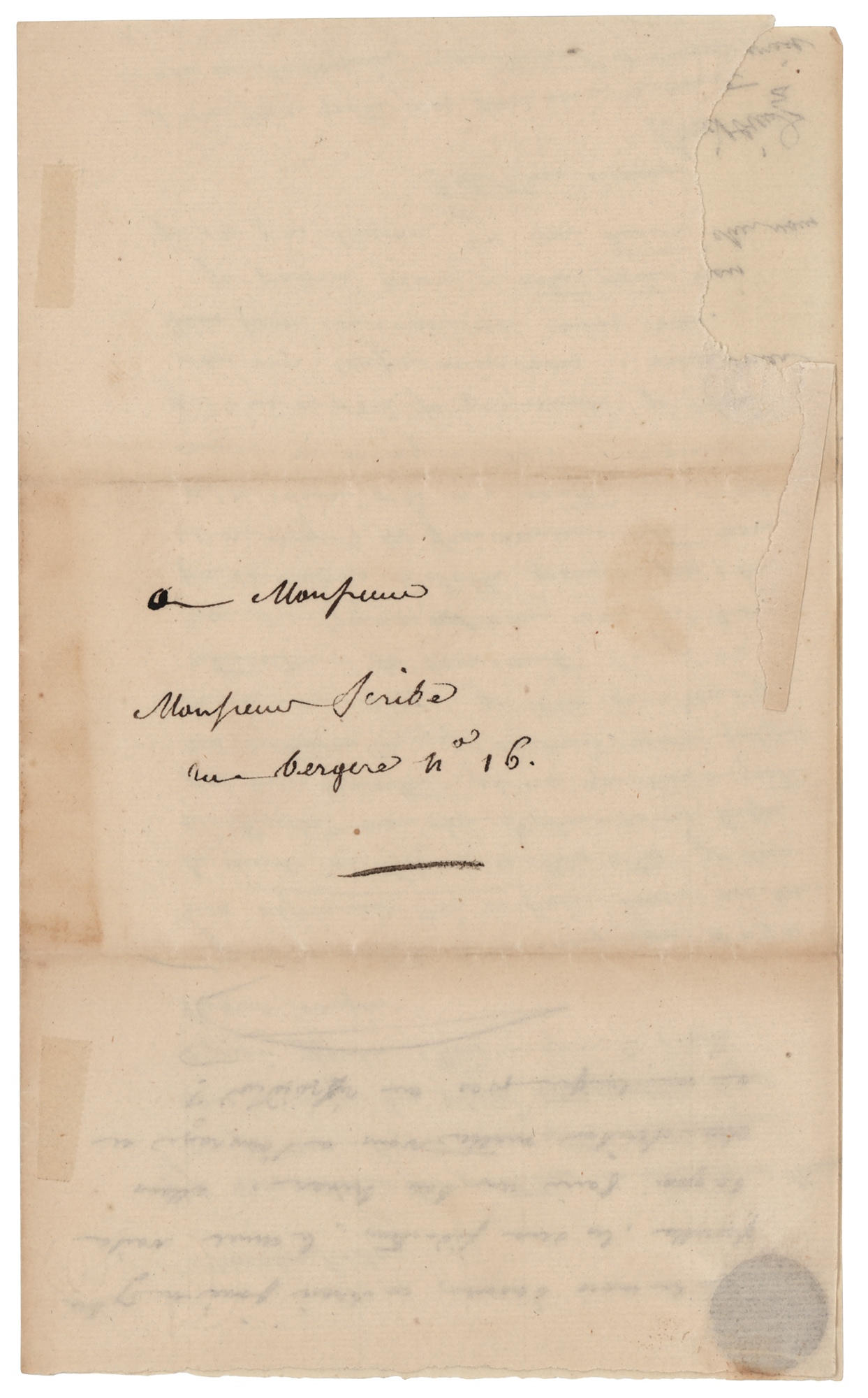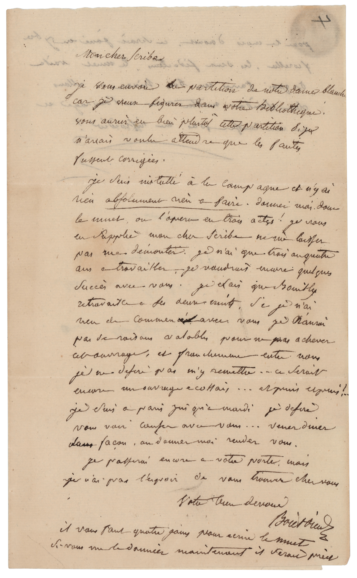 French opera composer often called 'the French Mozart' (1775-1834). ALS in French, signed “Boieldieu,” one page both sides, 4.5 x 7.25, no date. Untranslated handwritten letter to "Monsieur Scribe" concerning his work. Addressed on the integral leaf in Boieldieu's hand. In very good to fine condition, with some faint stains, and seal-related paper loss to the integral address leaf.