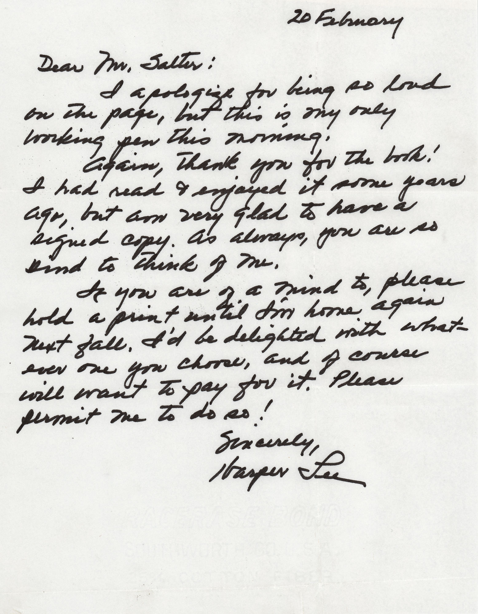 ALS, one page, 8.5 x 11, February 20, [1995]. Handwritten letter to Don Salter, in full: "I apologize for being so loud on the page, but this is my only working pen this morning. Again, thank you for the book! I had read & enjoyed it some years ago, but am very glad to have a signed copy. As always, you are so kind to think of me. If you are of a mind to, please hold a print until I'm home again next fall. I'd be delighted with whatever you choose, and of course will want to pay for it. Please permit me to do so!" In fine condition. Accompanied by the original mailing envelope, addressed in Lee's hand.