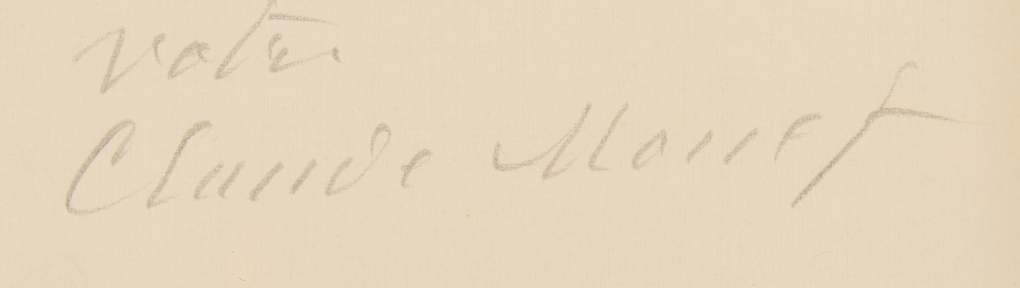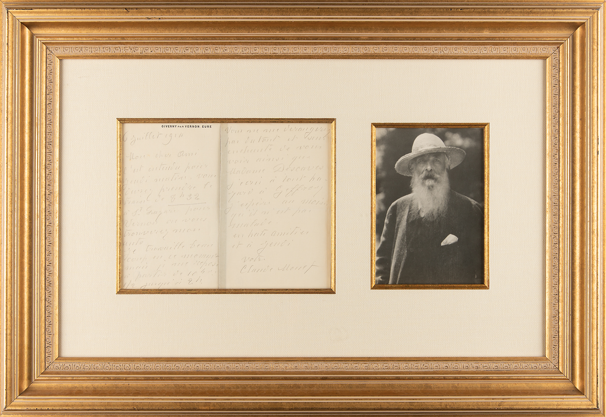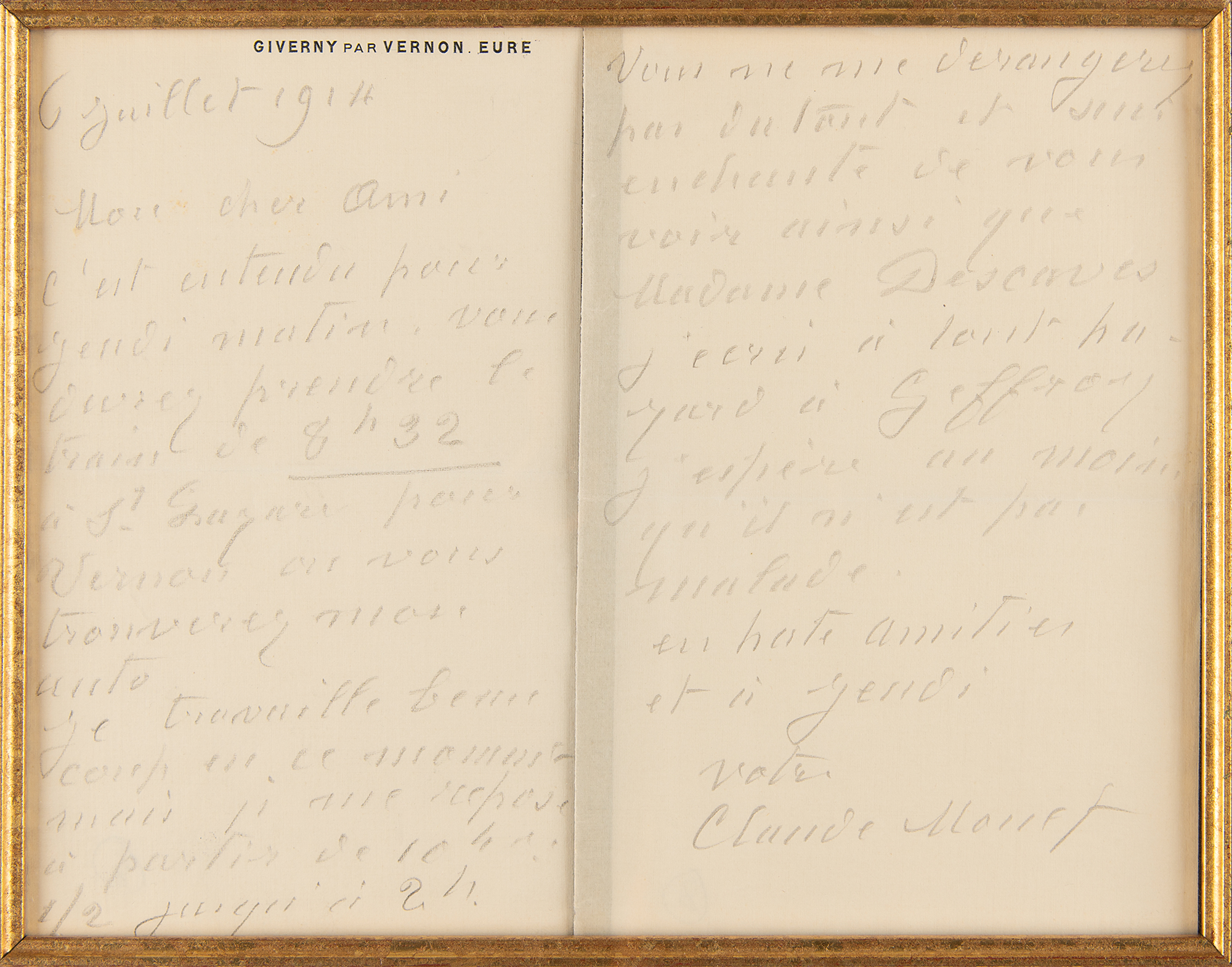 ALS in pencil, in French, two pages, 5 x 7, Giverny par Vernon letterhead, July 6, 1914. Handwritten letter to his friend, the author Lucien Descaves, arranging a meeting. In full (translated): "It's agreed for Thursday morning. You are to catch the 8:32 train at St. Guyner par Vernon, where you will find my car. I am working very hard at the moment, but I take a rest from 10:30 a.m. to 2:00 p.m. You are not bothering me at all and I will be delighted to see you and Mrs. Descaves. I have written to [Gustave] Geffroy, and I hope he is not in ill health. In all friendship and see you Thursday." Impressively cloth-matted and framed with a portrait to an overall size of 26.5 x 18. In fine condition.