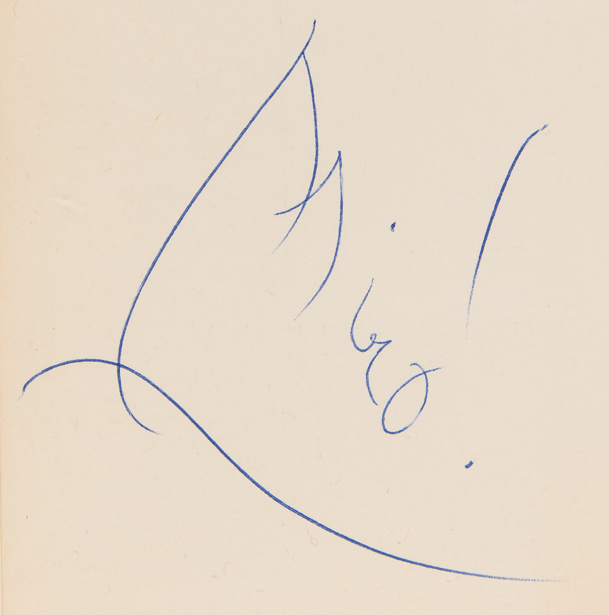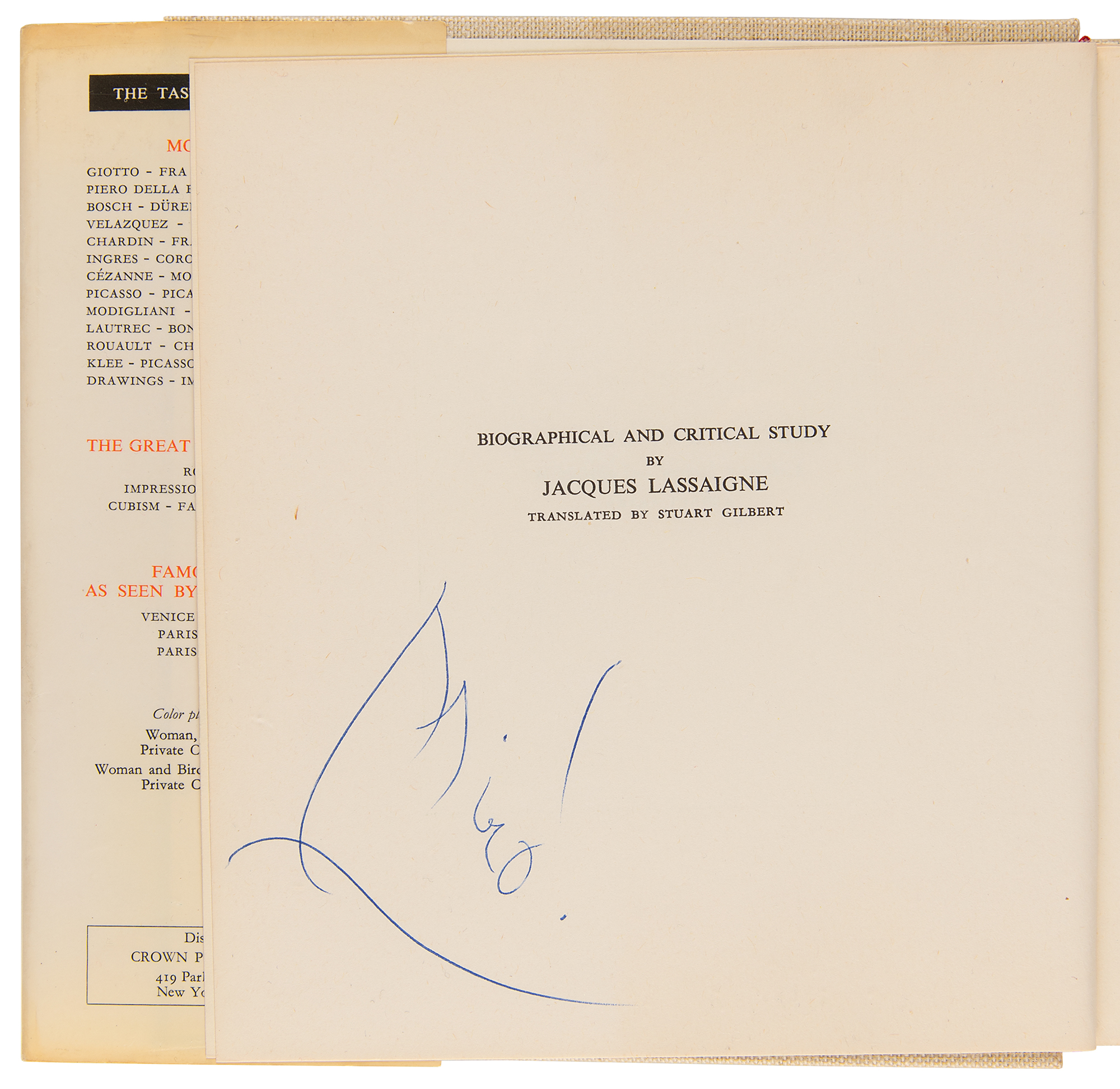 Spanish painter and sculptor (1893–1983) known for his colorful abstractions. Appealing signed book: Miro. Later printing. NY: Skira/Crown Publishers, 1972. Hardcover with dust jacket, 6.5 x 7.25, 142 pages. Signed opposite the title page in blue ballpoint, "Miro!" The fantastic volume boasts numerous tipped-in color illustrations of Miro's artwork. In fine condition, with light edgewear to the jacket.