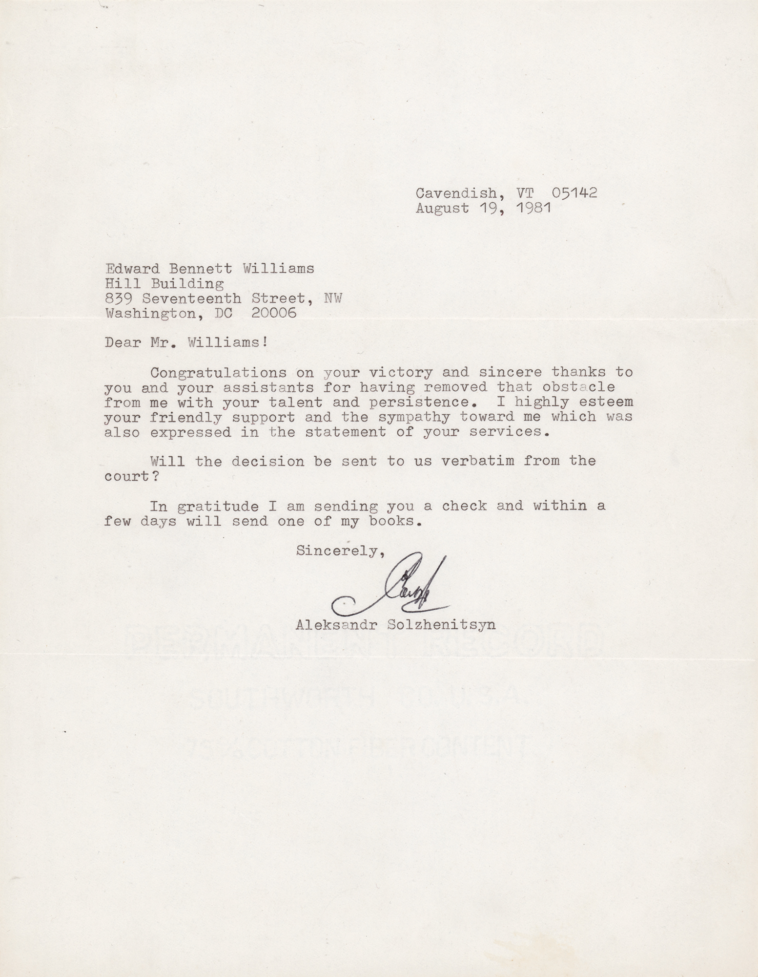 Soviet and Russian author and dissident (1918-2008) who helped to raise global awareness of political repression in the Soviet Union, especially the Gulag prison system. He was awarded the 1970 Nobel Prize in Literature ‘for the ethical force with which he has pursued the indispensable traditions of Russian literature.’ TLS, one page, 8.5 x 11, August 19, 1981. Letter to noted lawyer and Washington Redskins team president Edward Bennett Williams, in full: “Congratulations on your victory and sincere thanks to you and your assistants for having removed that obstacle from me with your talent and persistence. I highly esteem your friendly support and the sympathy toward me which was also expressed in the statement of your services. Will the decision be sent to us verbatim from the court? In gratitude I am sending you a check and within a few days will send one of my books.” In fine condition.