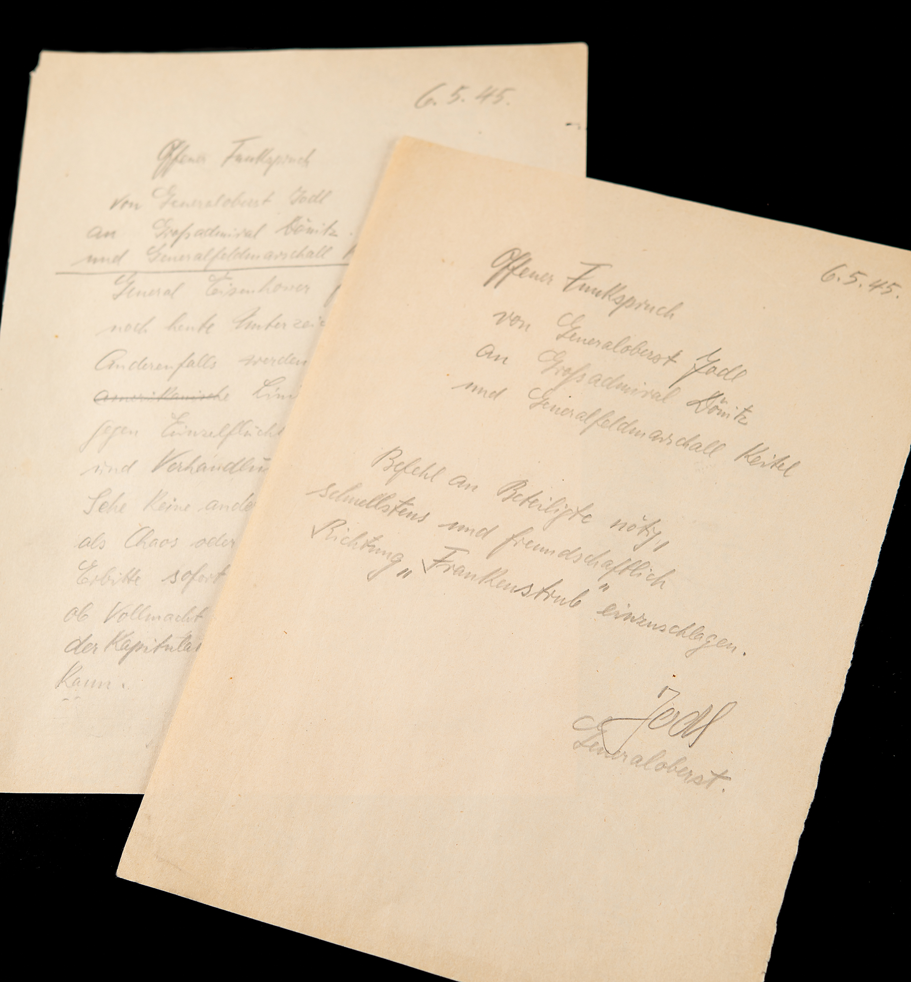 Amazing, historic pairing of two manuscript radiotelegram transmission drafts in pencil, each signed by Col. Gen. Alfred Jodl, "Jodl," transmitted to Reich President Karl Dönitz during armistice negotiations with General Dwight D. Eisenhower at Reims, France, on May 6, 1945.
