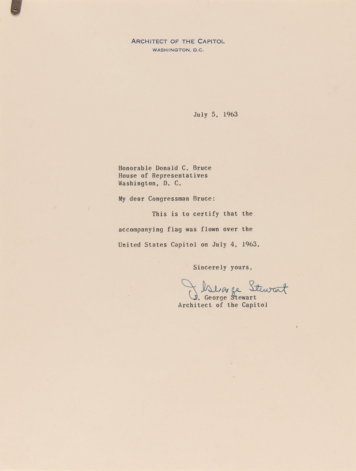 Appealing 5´ x 3´ cotton American flag that was flown over the United States Capitol on Independence Day in 1963 during the administration of President John F. Kennedy. Includes a letter from Architect of the Capitol J. George Stewart, sent to Indiana Congressman Donald C. Bruce, dated July 5, 1963, in part: "This is to certify that the accompanying flag was flown over the United States Capitol on July 4, 1963." In very good to fine condition, with expected wear from use and age, including fading and scattered small holes.