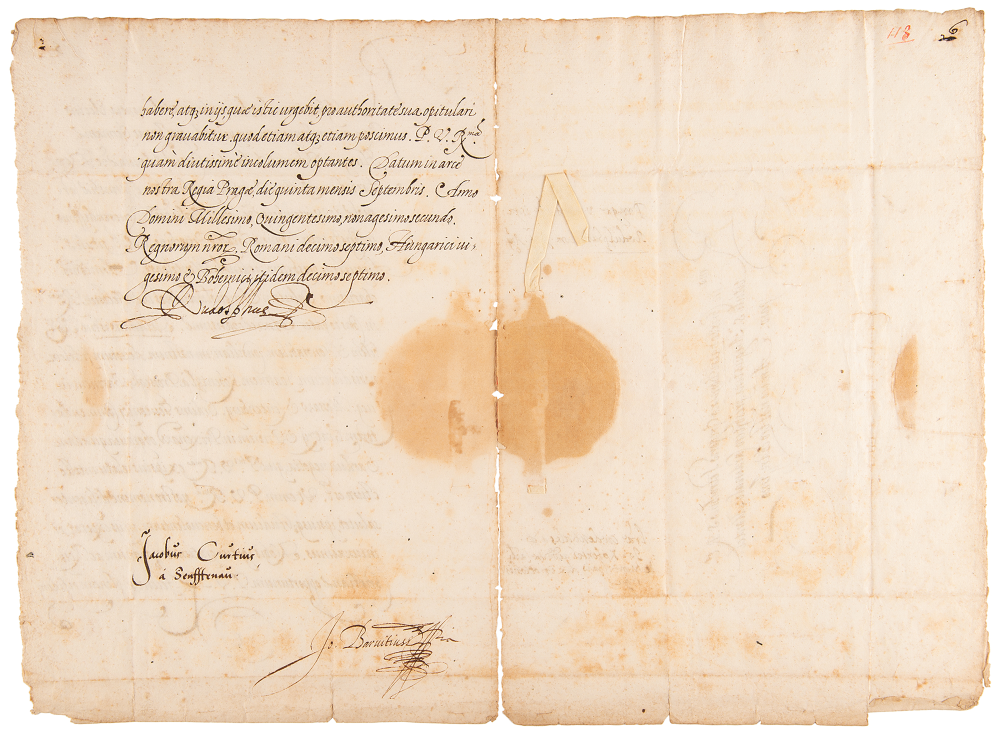 Member of the House of Habsburg who ruled as Holy Roman Emperor from 1576 until his death (1552-1612), remembered as an influential patron of the arts but ineffectual ruler whose mistakes led directly to the Thirty Years' War. LS in Latin, signed “Rudolphus,” one page both sides, 8.5 x 12.5, September 15, 1592. Untranslated letter that is addressed to Cardinal Montelparo and countersigned by both Rudolph's private counselor, Johann Barwitz, a noted Catholic humanist, and his chancellor, Jacob von Kurz Senftenau, two highly cultured officials who both supported astronomers Tycho Brahe and Johannes Kepler (the latter having dedicated one of his works to Barwitz). The reverse of the second integral sheet bears a near-complete embossed paper seal. In very good condition, with scattered light foxing and staining, short tears to the rough edges, and partial separation along the hinge. An evocative document of a brilliant court by its ruler and two of its most active players.