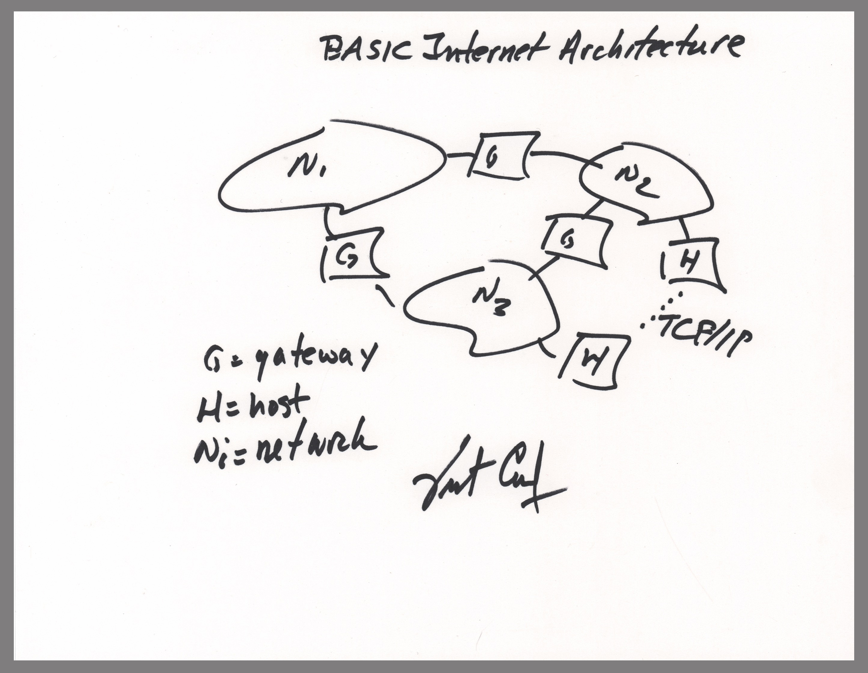 Original sketch by Vint Cerf of the “Basic Internet Architecture,” accomplished in felt tip on a white 11 x 8.5 card, signed at the bottom, "Vint Cerf." The sketch shows a basic diagram of the gateways, hosts, and networks that comprise the internet. In very fine condition.