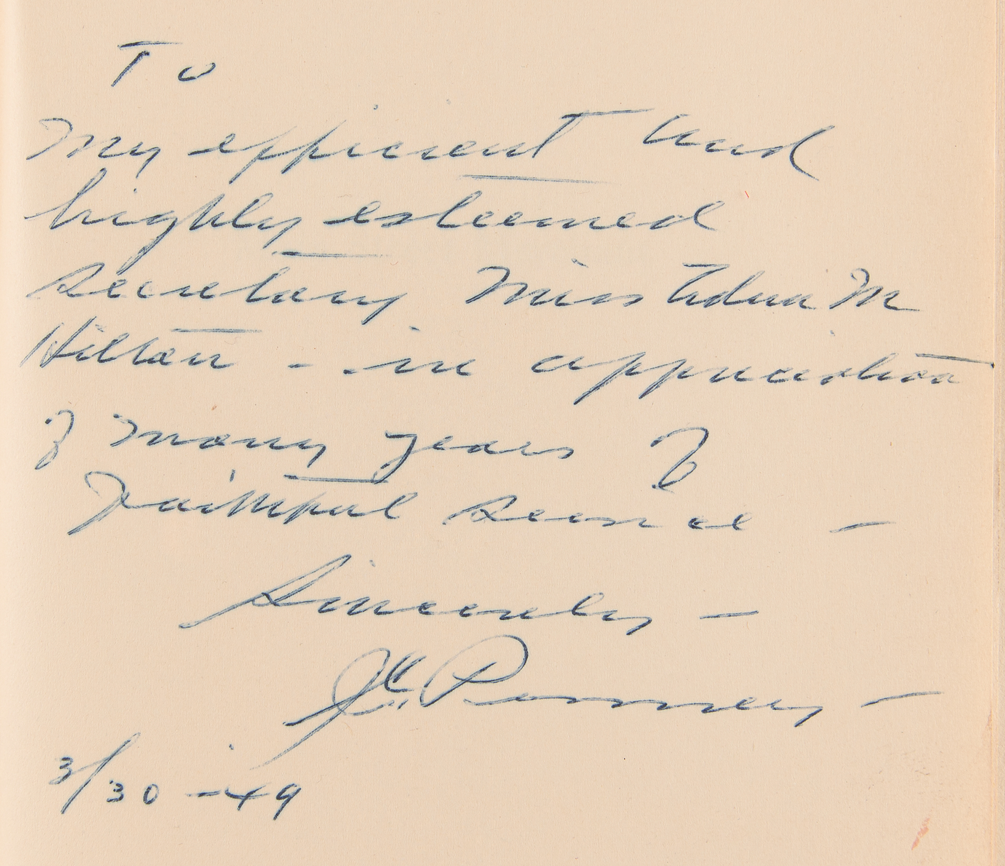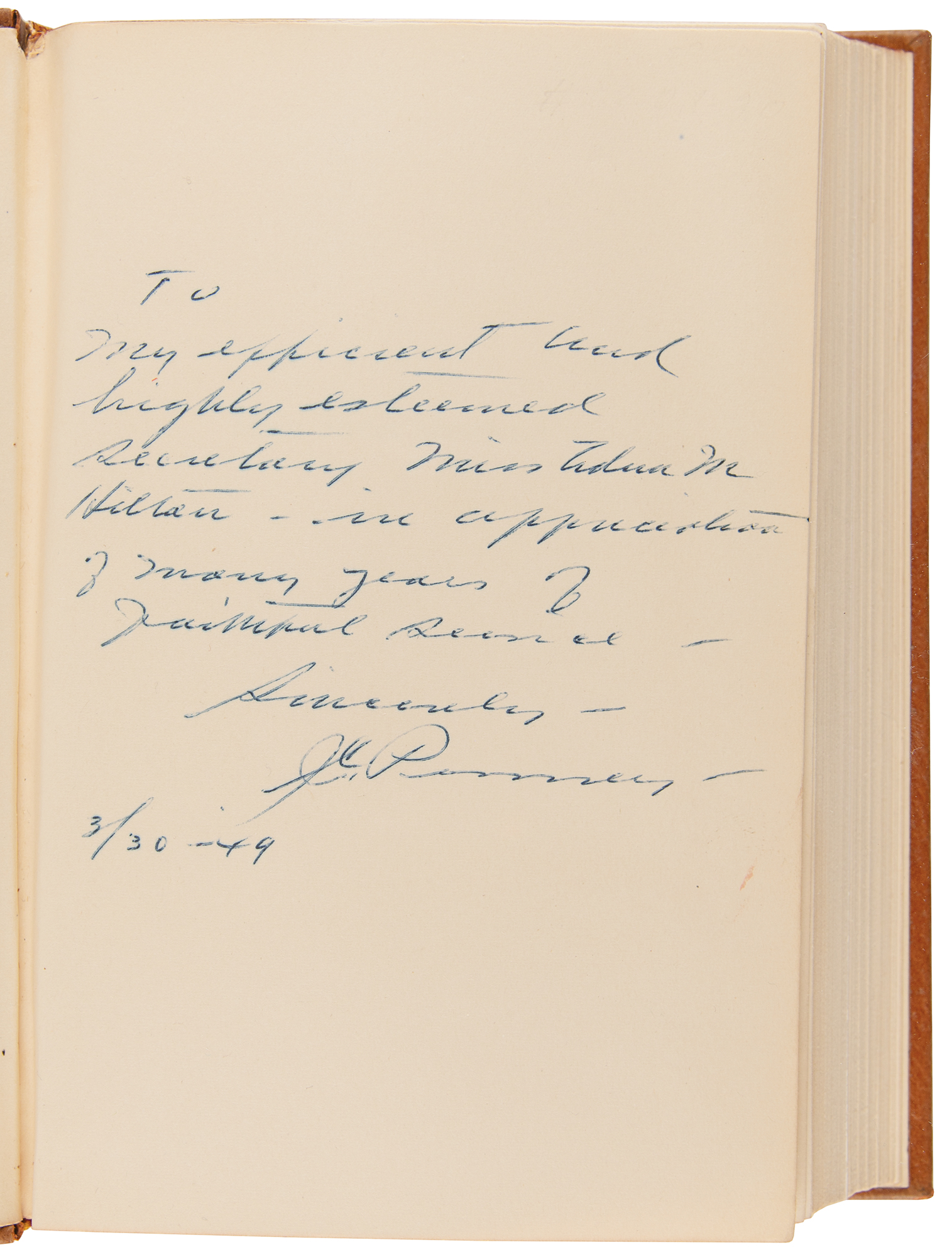 Signed book: Main Street Merchant: The Story of the J. C. Penney Company. First edition. NY: Whittlesey House, 1948. Leatherbound hardcover, 5.75 x 8.25, 274 pages. Signed and inscribed on a free end page in blue ballpoint, "To my efficient and highly esteemed secretary, Miss Edna M. Hilton—in appreciation of many years of faithful service—Sincerely—J. C. Penney—3/30-49." In fine condition.