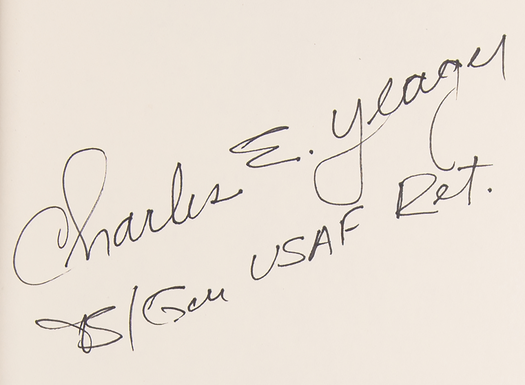 Signed book: Yeager: An Autobiography. Later printing. NY: Bantam Books, 1985. Hardcover with dust jacket, 6.25 x 9.25, 342 pages. Signed on the half-title page in black felt tip, "Chuck E. Yeager, B/Gen. USAF Ret." In fine condition, with a price-clipped dust jacket.